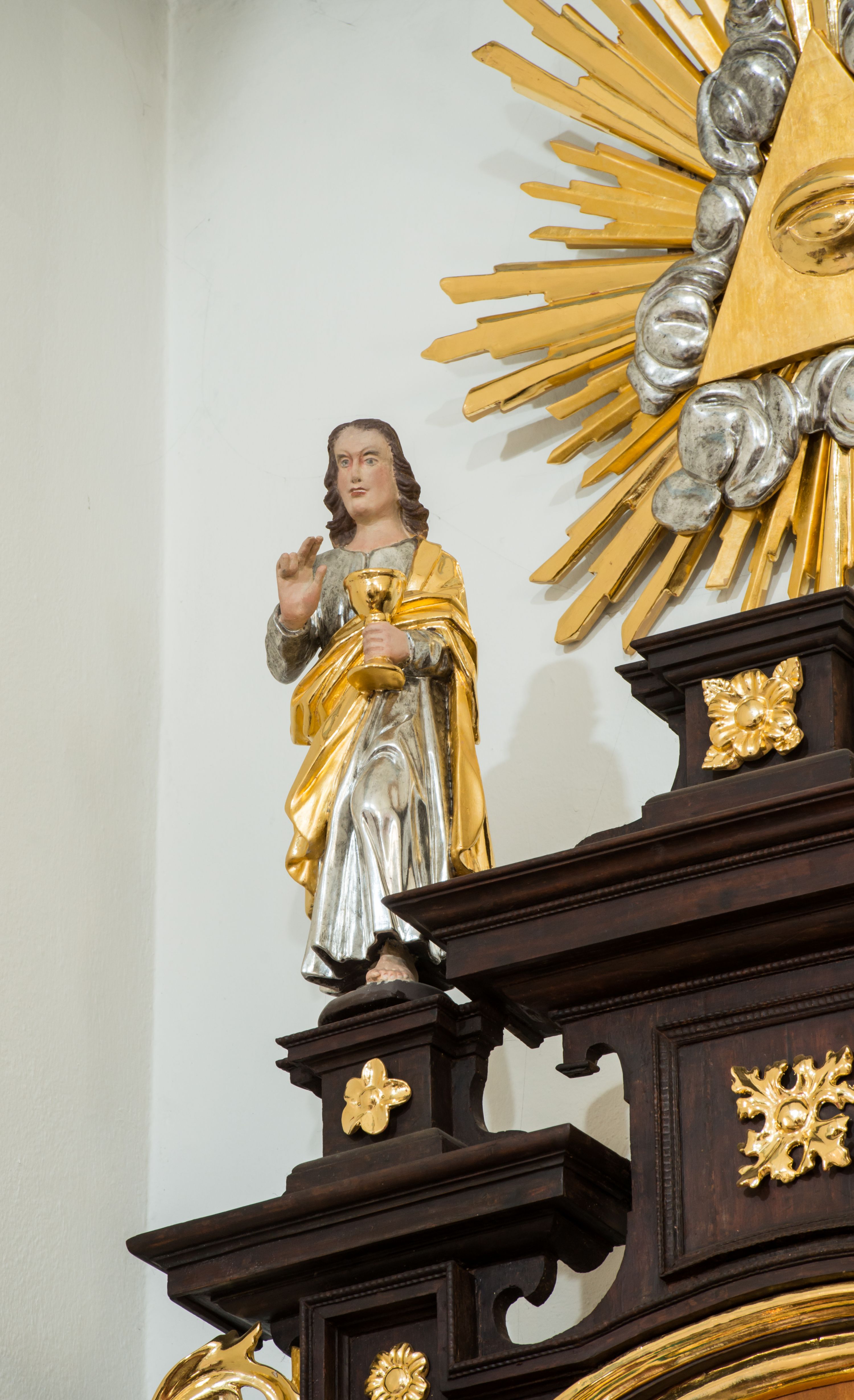 Święty Jan, który z reguły bywa przedstawiany jako młodzieniec, był uczniem Chrystusa i jako jedyny wytrwał pod krzyżem aż do jego śmierci. Był autorem Ewangelii, trzech Listów oraz treści Apokalipsy. W przedstawieniu nie towarzyszy mu atrybut w postaci orła, po którym można go najłatwiej rozpoznać. W lewej ręce trzyma kielich, a prawą czyni nad nim gest błogosławieństwa. Naczynie nawiązuje do legendy, według której efeski kapłan bogini Diany, Aristodemus, podał świętemu zatrute wino. Gdy Jan przeżegnał je krzyżem straciło swoją moc.