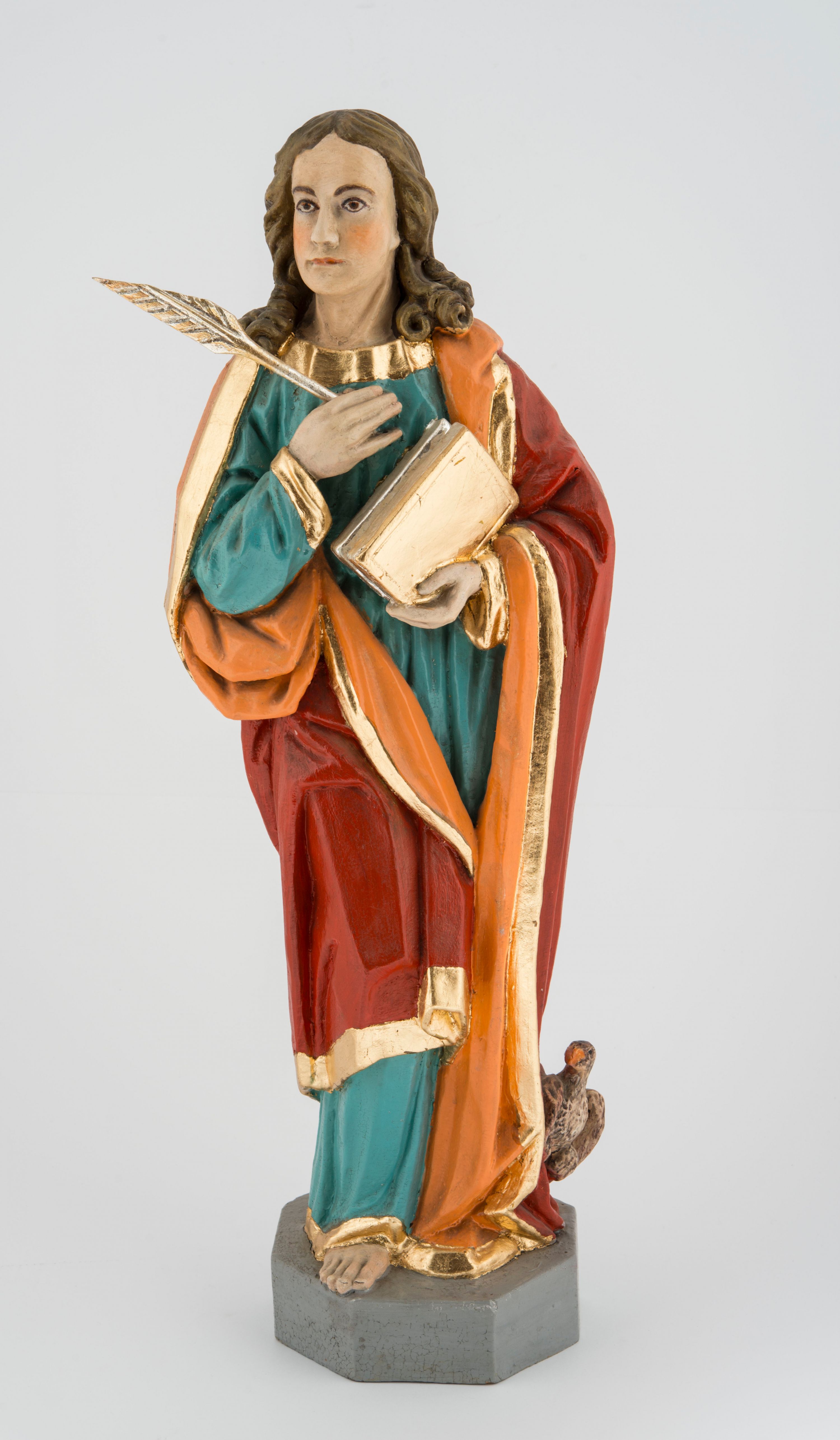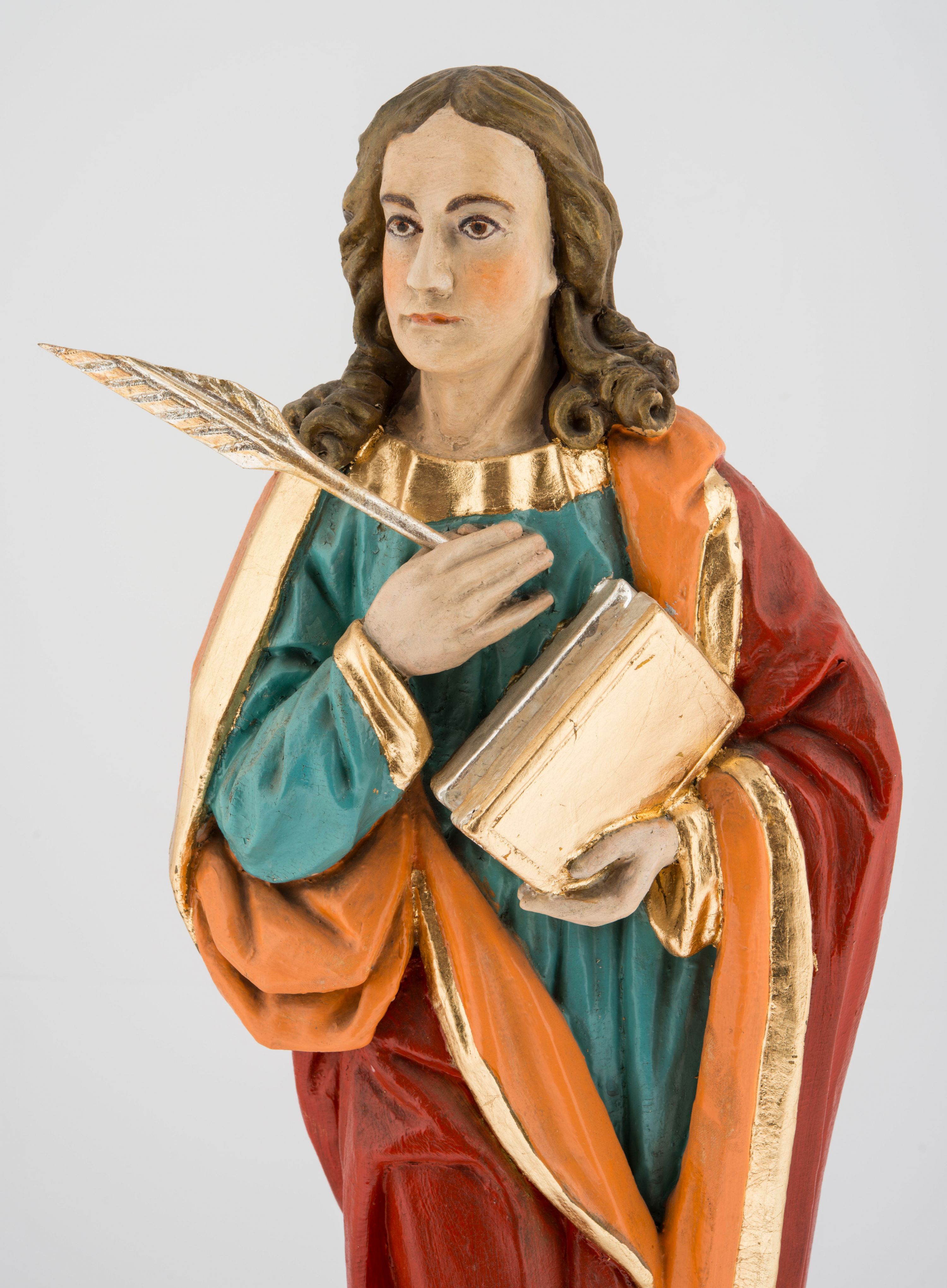 Rzeźba pełna na cokole przedstawiająca św. Jana Ewangelistę. Święty ukazany jest w pozycji stojącej, frontalnie, w kontrapoście, z prawą nogą zgiętą w kolanie i głową skierowaną delikatnie w prawo. Prawą rękę przyciska do piersi, trzymając pióro, lewą przytrzymuje zamkniętą księgę. Ma pociągłą twarz o szeroko otwartych, brązowych oczach, długim nosie i wąskich ustach, okoloną długimi włosami zwijającymi się na końcach w pukle, z przedziałkiem na środku. Ubrany jest w zieloną suknię lamowaną przy krawędziach złotem oraz czerwony, podbity pomarańczowym materiałem płaszcz zarzucony na oba ramiona, układający się w głębokie fałdy. Stopy bose, przy lewej nodze świętego widoczny fragment niewielkiej postaci orła w biało-brązowe cętki, z pomarańczowym dziobem. Polichromia w partiach ciała naturalistyczna, księga i pióro złocone.