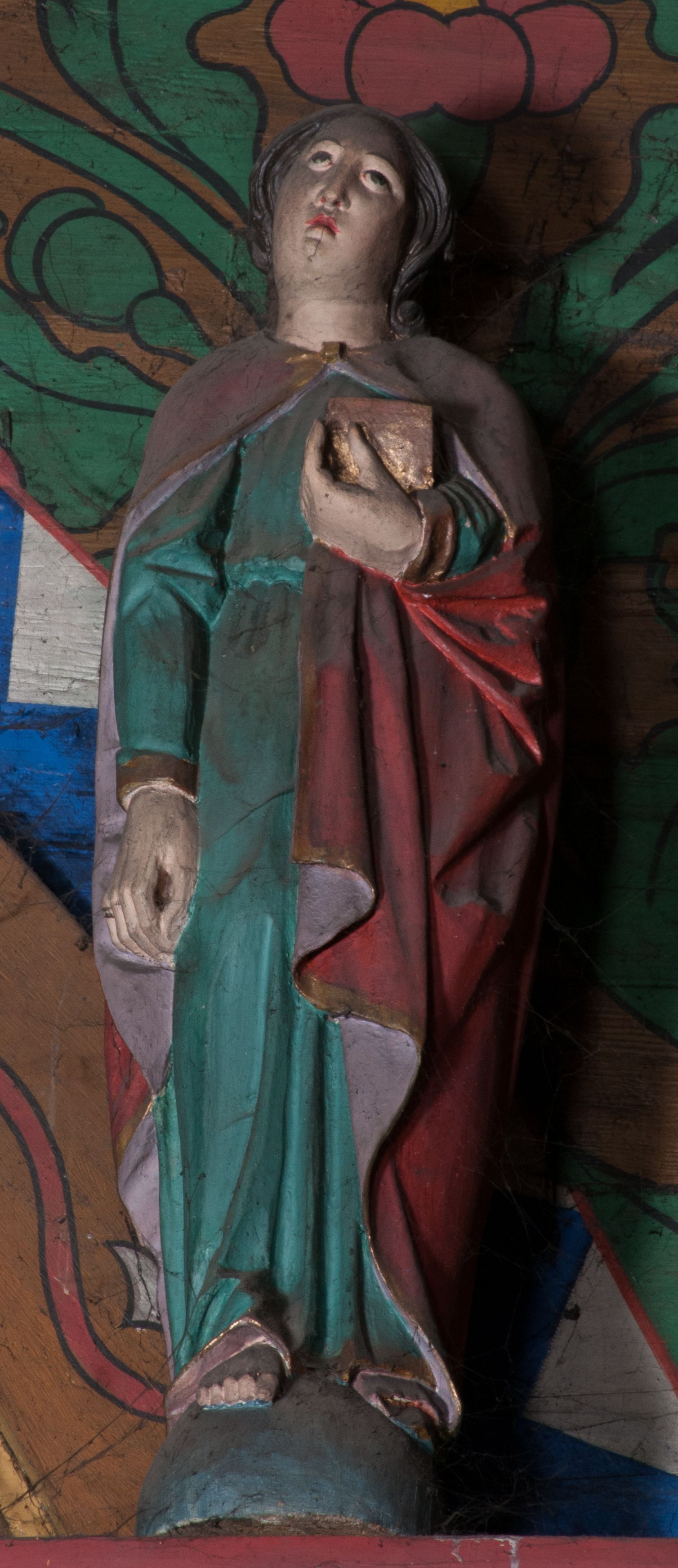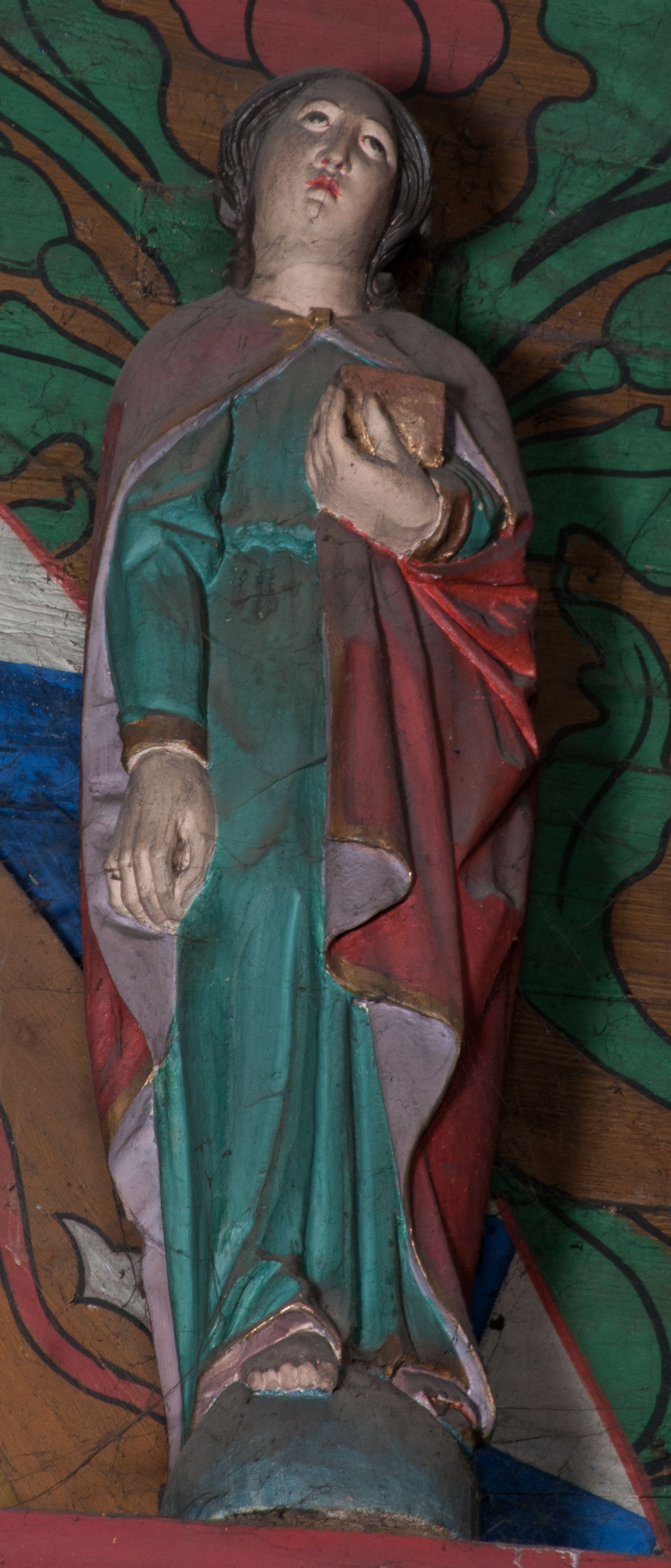 Figura ścięta z tyłu, ustawiona na podstawie w formie ściętej kuli. Święty ukazany frontalnie, w kontrapoście, z głową przechyloną na lewe ramię, prawą rękę ma opuszczoną wzdłuż ciała, lewą przytrzymuje przy piersi księgę. Twarz ma owalną o pełnych policzkach, małych, migdałowatych oczach, prostym nosie, pełnych ustach i wystającej brodzie. Włosy delikatnie kręcone, sięgające ramion. Ubrany jest w zieloną tunikę, przepasaną w talii oraz czerwony płaszcz, o różowej podszewce i złoconej lamówce, zapięty pod szyją, opadający na ramiona. Polichromia ciała naturalistyczna.