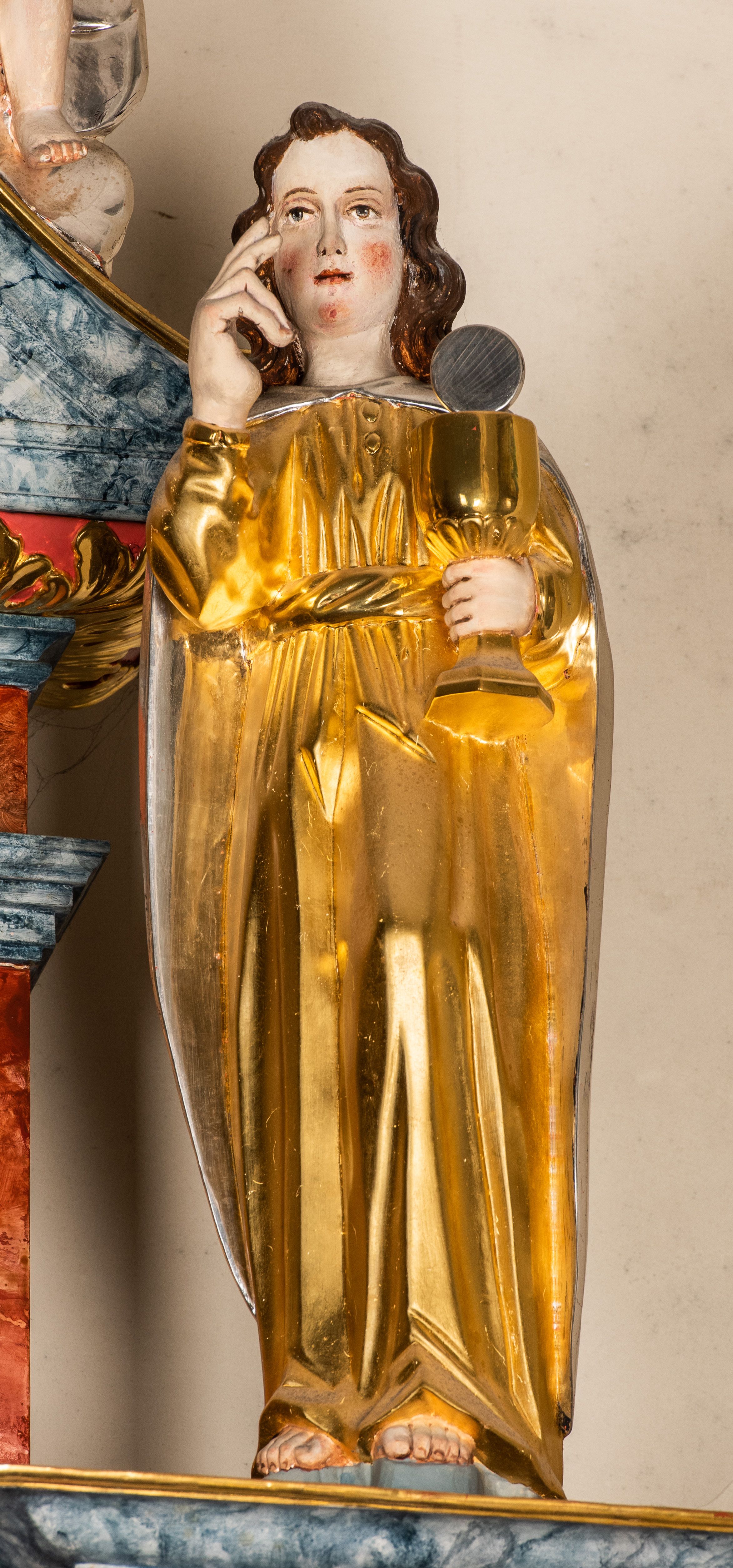 Drążona z tyłu, całopostaciowa figura św. Jana Ewangelisty stojącego frontalnie w lekkim kontrapoście. Twarz owalna o delikatnych rysach. Włosy brązowe, długie, mocno falowane. Święty jest ubrany w długą, złoconą suknię przewiązaną w pasie, na ramiona ma narzucony srebrzony, długi płaszcz spięty pod szyją. Prawa ręka w geście błogosławieństwa, w lewej dłoni złocony kielich ze srebrną hostią.