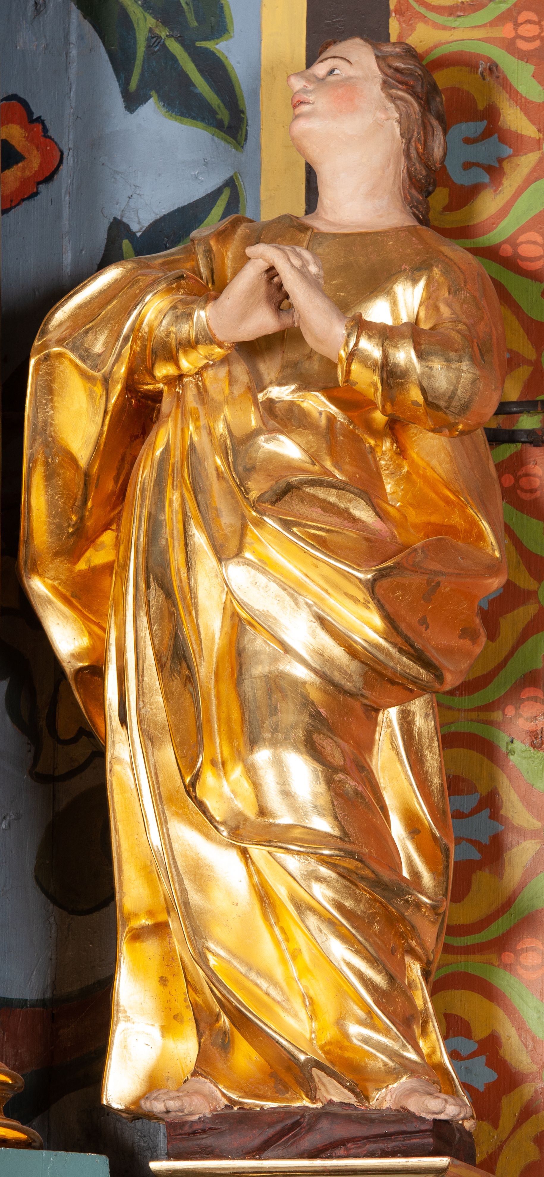 Całopostaciowa, lekko ścięta z tyłu figura św. Jana Ewangelisty zwróconej na wprost i stojącej w wydatnym kontrapoście. Sylwetka ciała esowato wygięta, tułów i głowa odchylone do tyłu. Głowa uniesiona, zwrócona w prawą stronę. Twarz o łagodnych rysach, okolona lekko falowanymi włosami. Czoło wydatne z pojedynczym lokiem włosów. Oczy niewielkie, usta rozchylone. Ręce uniesione na wysokość klatki piersiowej złożone w geście modlitewnym. Postać ubrana w długą tunikę oraz płaszcz, przerzucony przez prawe ramię, okrywający dolną część postaci. Karnacja ciała w jasnokremowym odcieniu, szaty złocone.