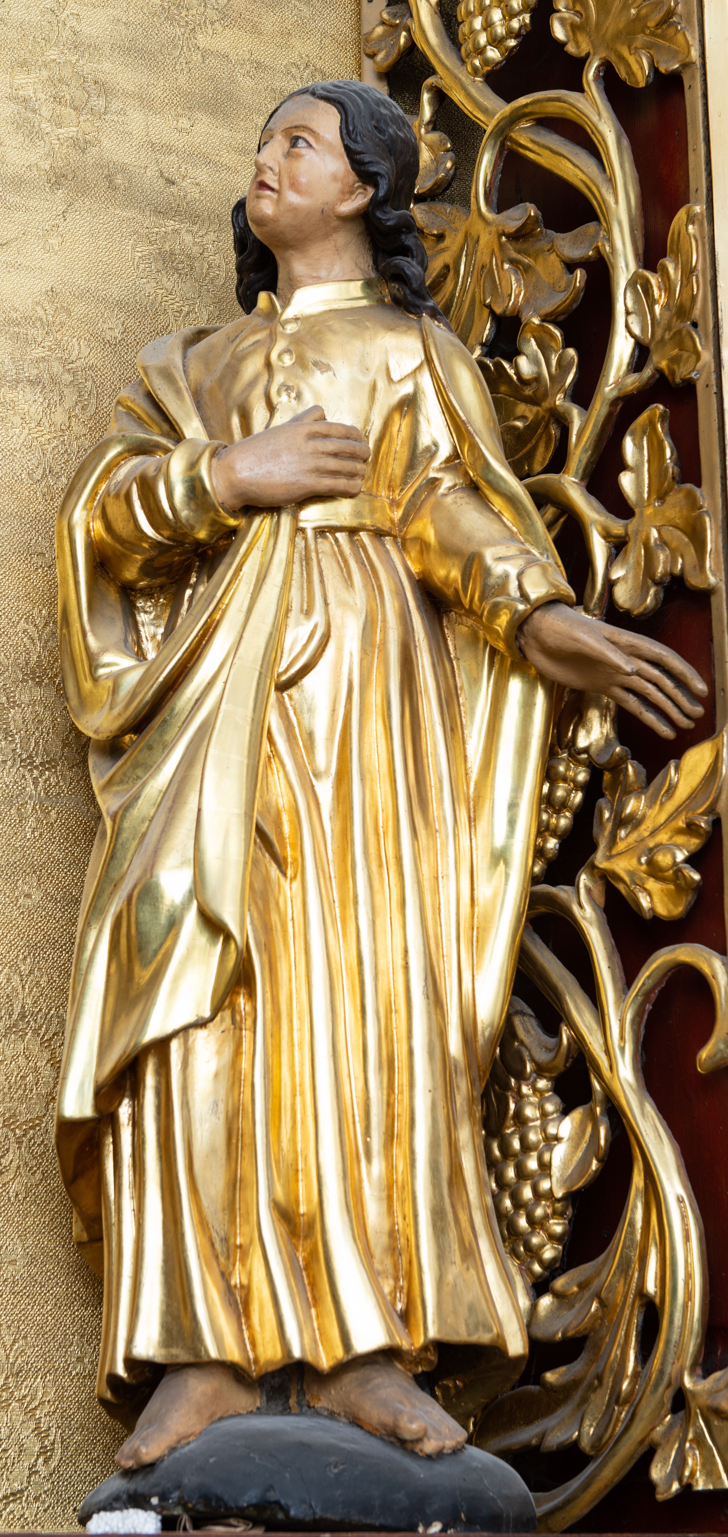 Rzeźba drążona, przedstawiająca św. Jana Ewangelistę, ustawiona na niskim, półkolistym cokole. Święty zwrócony delikatnie w prawo, w kontrapoście, z głową skierowaną w prawo i uniesioną nieco do góry, z prawą ręką złożoną na piersi, a lewą wyprostowaną i odsuniętą w bok. Twarz okrągła z wyraźnie zaznaczonym podbródkiem, małymi ustami i prostym nosem; włosy długie, ciemnobrązowe z przedziałkiem pośrodku, opadające na plecy. Święty jest ubrany w długą szatę z długimi rękawami, zapiętą w górnej części na guziki, przewiązaną pasem oraz płaszcz, którego jeden koniec trzyma w prawej dłoni. Draperia szat gęsta, równolegle biegnąca w dół. Polichromia w odsłoniętych partiach ciała naturalistyczna, szaty złocone.