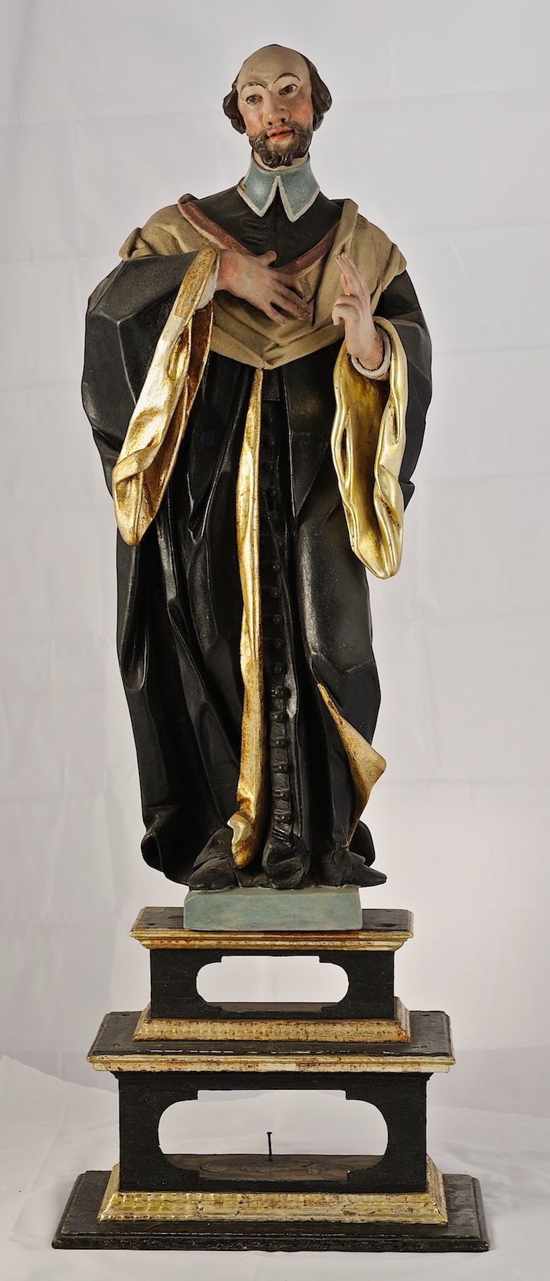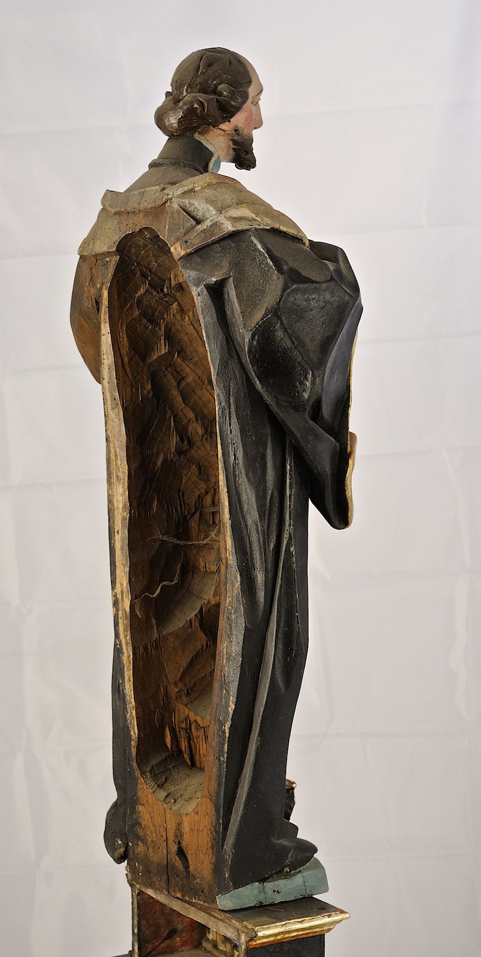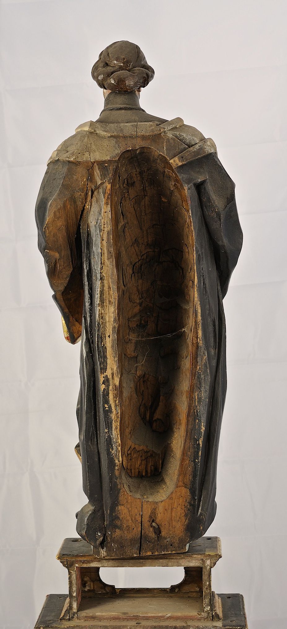 Figura zabrudzona, drobne przetarcia w partii złoceń. Brak zawartości skrzynek relikwiarzowych. Figura była odmalowana i pozłacana w latach 1844, 1883, 1907, 1957 i podczas generalnej konserwacji ołtarza w 1987 roku.