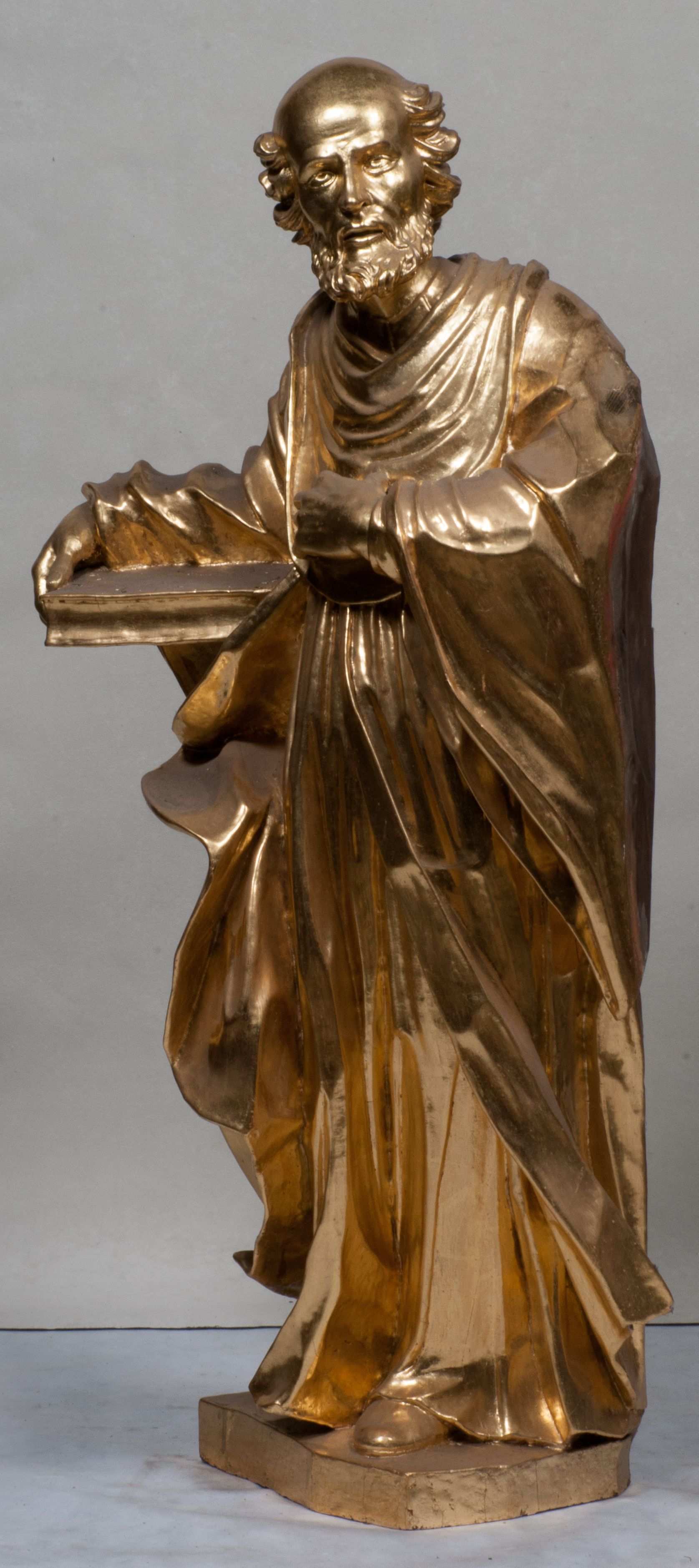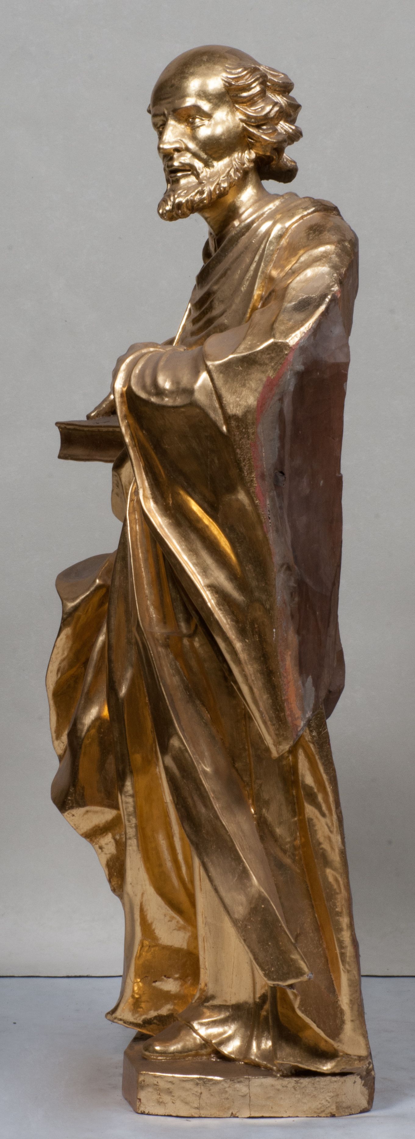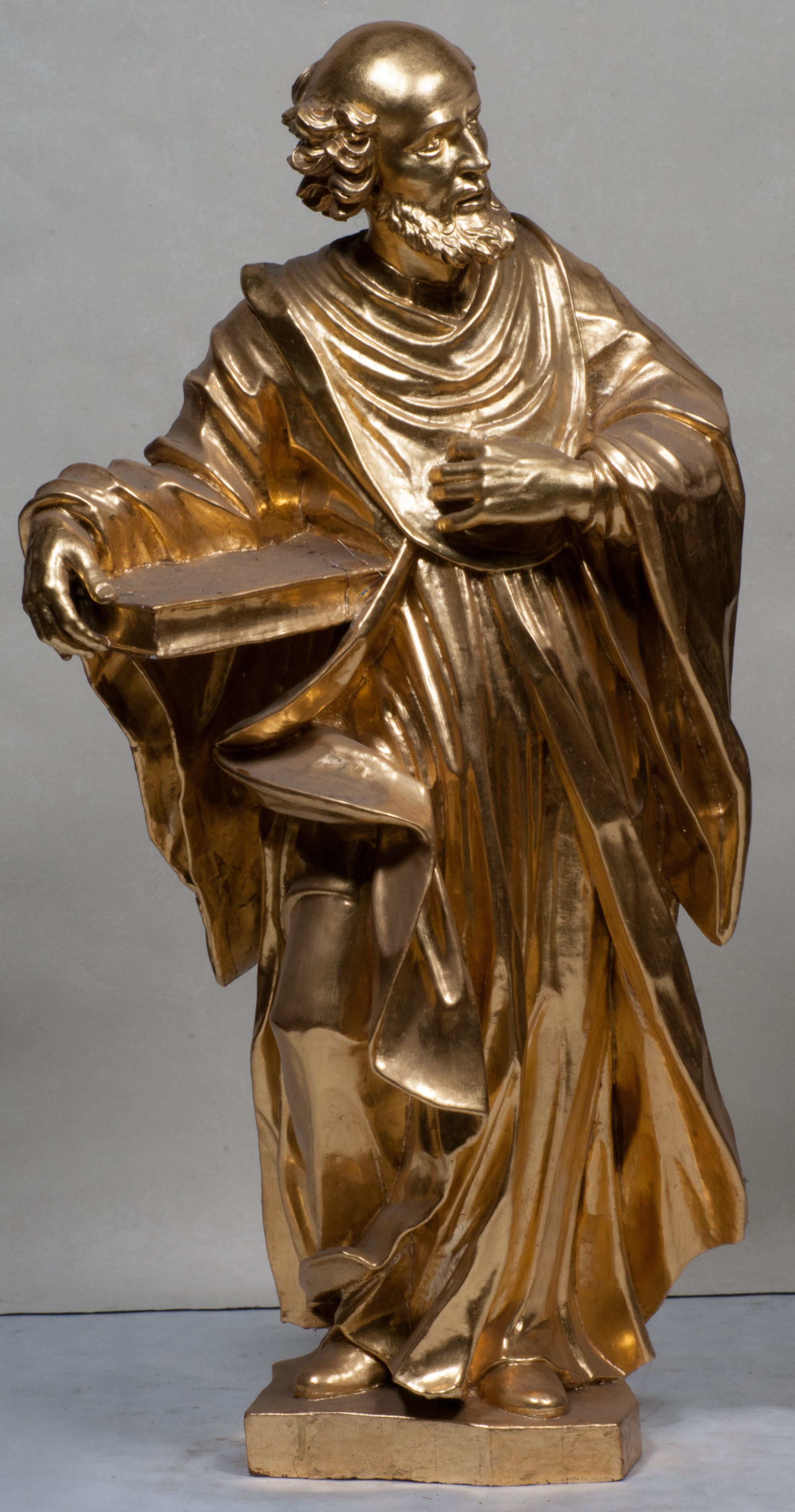 Rzeźba jest ścięta i wydrążona z tyłu, ustawiona na nieregularnej podstawie. Figura zwrócona jest frontalnie, w kontrapoście, z lekko pochylonymi głową i torsem, skierowanymi w lewo. Święty prawą ręką trzyma księgę opartą o jego biodro, lewą dłoń kładzie na piersi. Twarz ma wychudzoną, z podkreślonymi kośćmi policzkowymi, migdałowatymi, głęboko osadzonymi oczami, wąskim, małym nosem o ostrym profilu oraz wąskimi, otwartymi ustami, okoloną krótką, gęstą brodą, silnie wysuniętą do przodu oraz kręconymi włosami po bokach i z tyłu głowy. Święty ubrany jest w długą silnie fałdowaną tunikę oraz togę rektorską o szerokich rękawach, rozchyloną z przodu postaci z zygzakowato układającą się fałdą na jego prawej nodze. Figura w całości pozłocona.