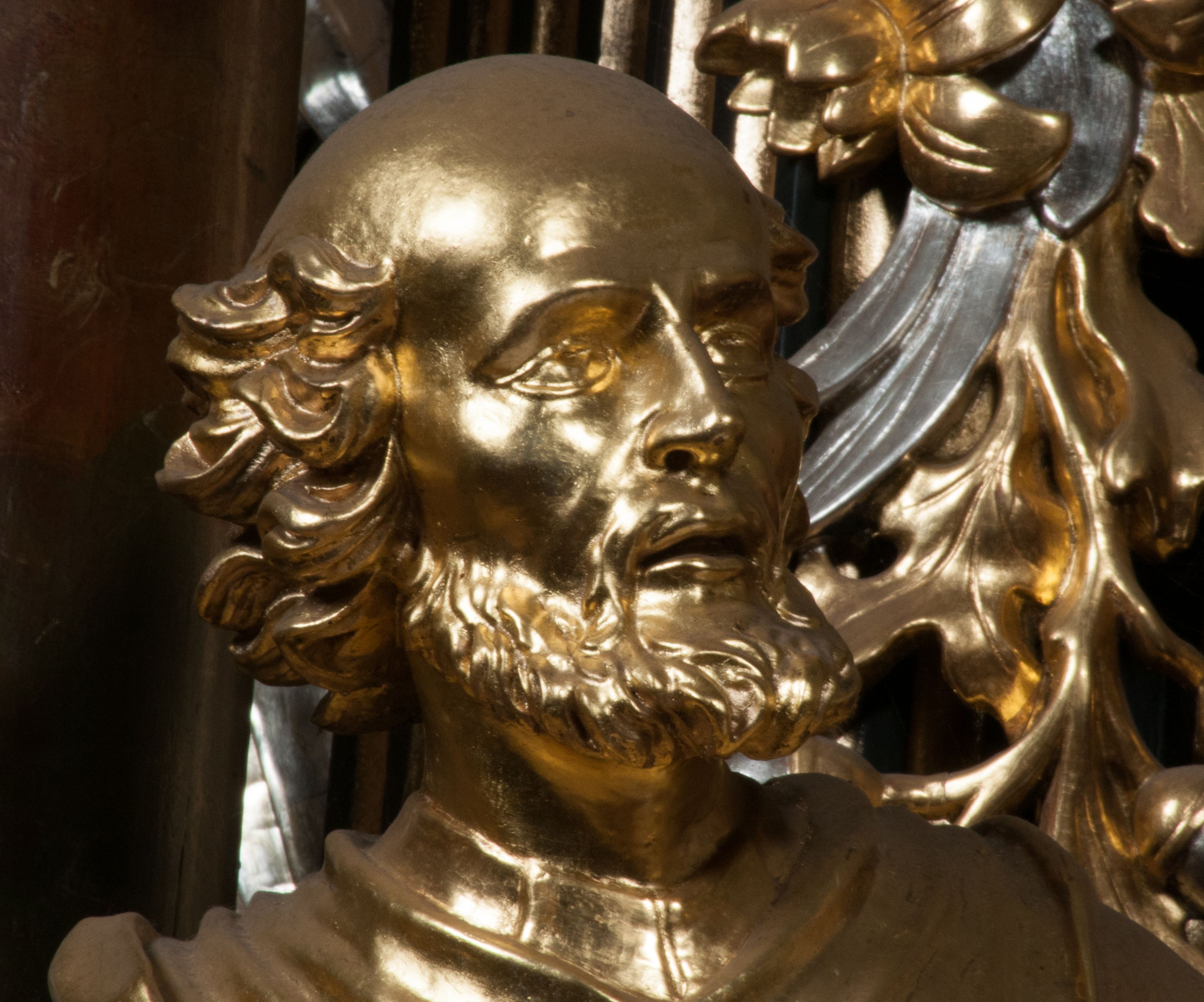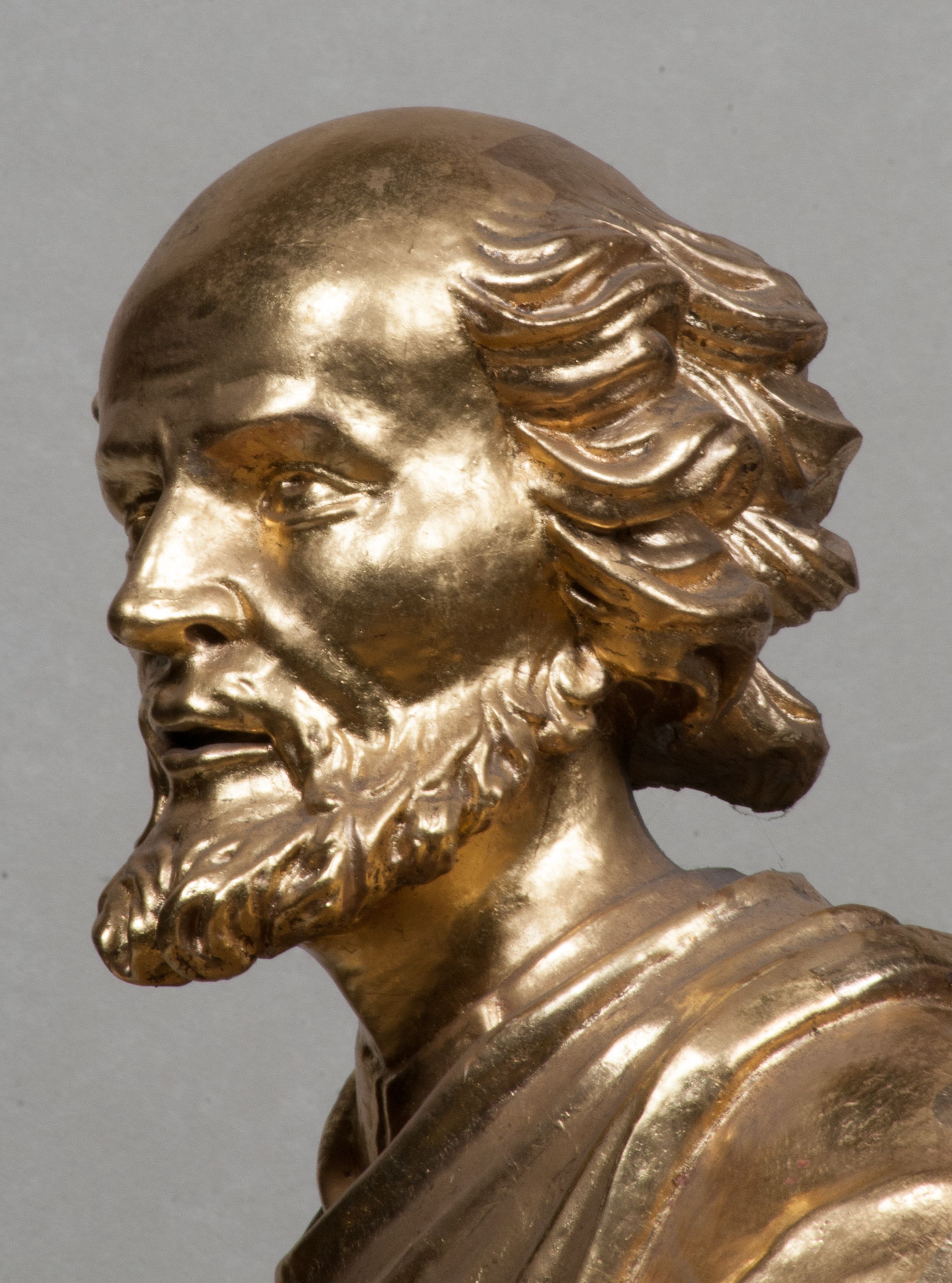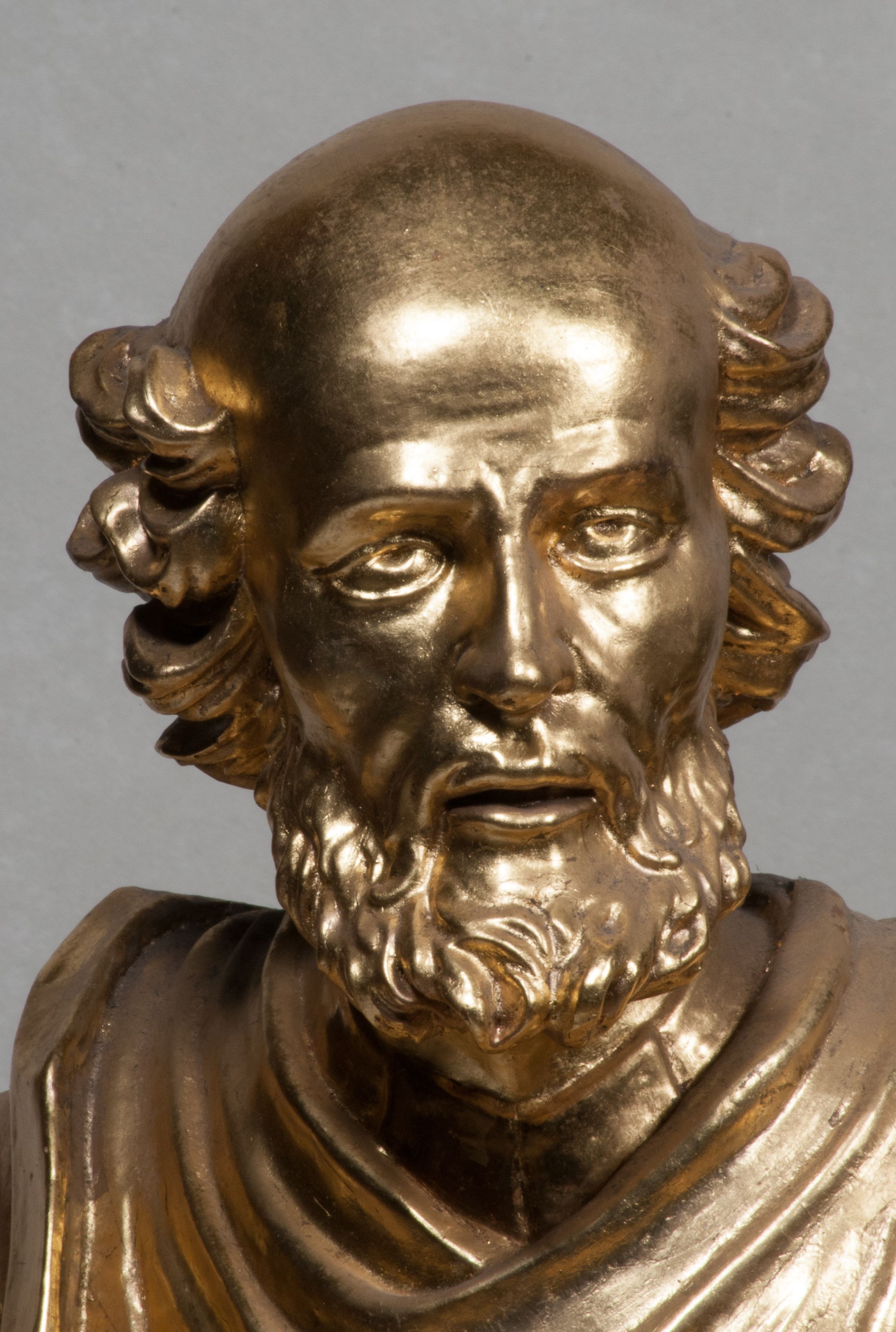 Rzeźba jest ścięta i wydrążona z tyłu, ustawiona na nieregularnej podstawie. Figura zwrócona jest frontalnie, w kontrapoście, z lekko pochylonymi głową i torsem, skierowanymi w lewo. Święty prawą ręką trzyma księgę opartą o jego biodro, lewą dłoń kładzie na piersi. Twarz ma wychudzoną, z podkreślonymi kośćmi policzkowymi, migdałowatymi, głęboko osadzonymi oczami, wąskim, małym nosem o ostrym profilu oraz wąskimi, otwartymi ustami, okoloną krótką, gęstą brodą, silnie wysuniętą do przodu oraz kręconymi włosami po bokach i z tyłu głowy. Święty ubrany jest w długą silnie fałdowaną tunikę oraz togę rektorską o szerokich rękawach, rozchyloną z przodu postaci z zygzakowato układającą się fałdą na jego prawej nodze. Figura w całości pozłocona.