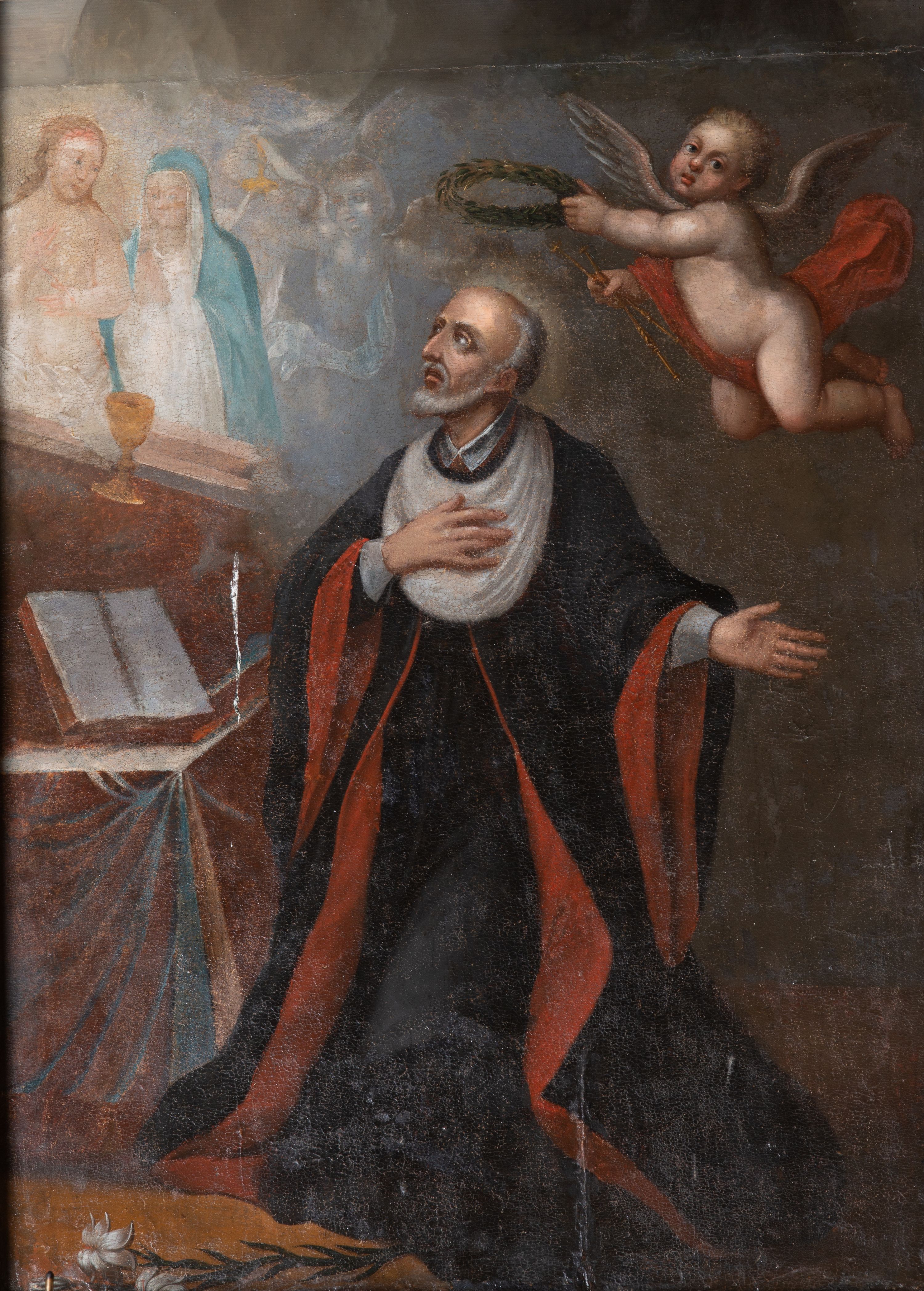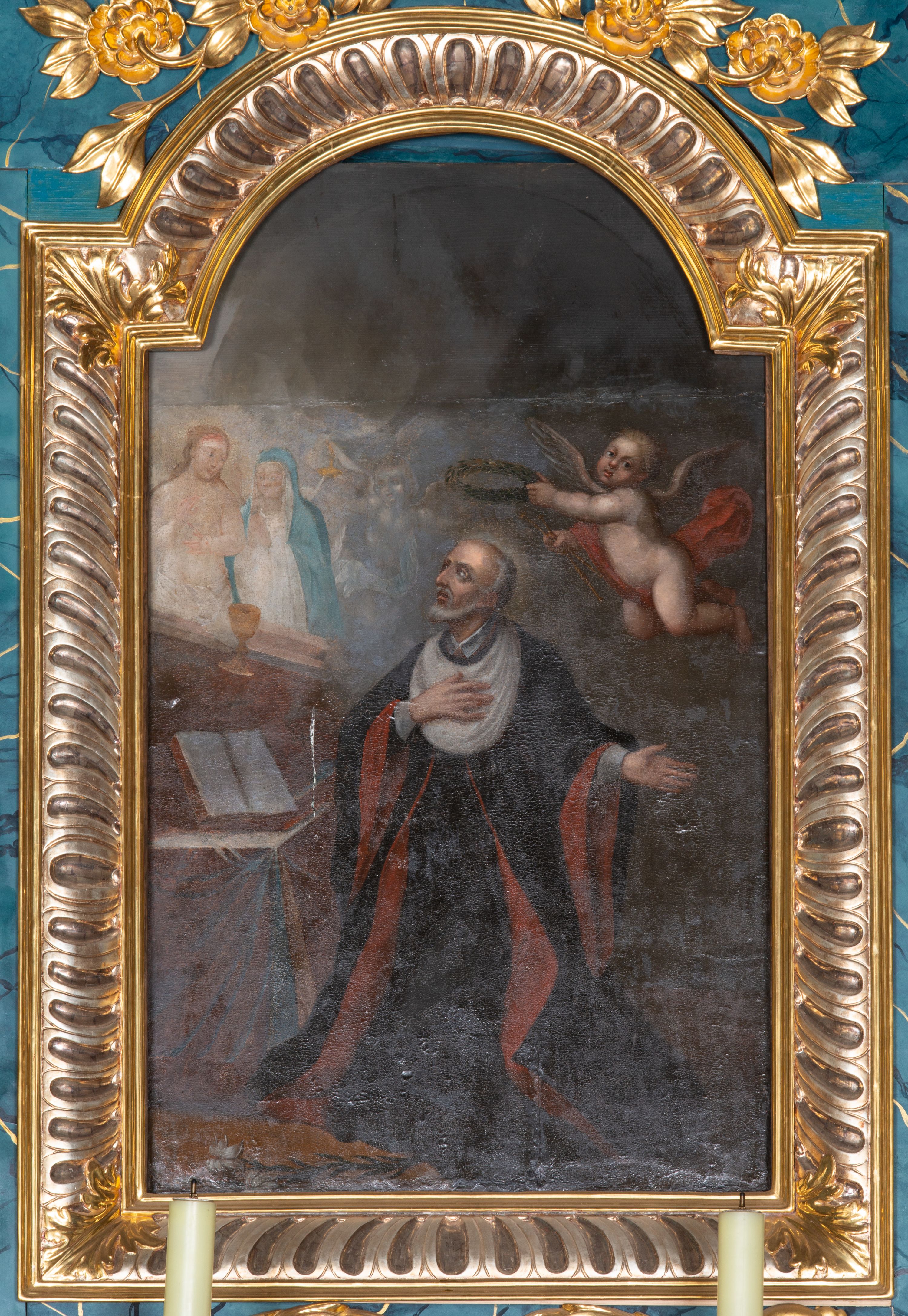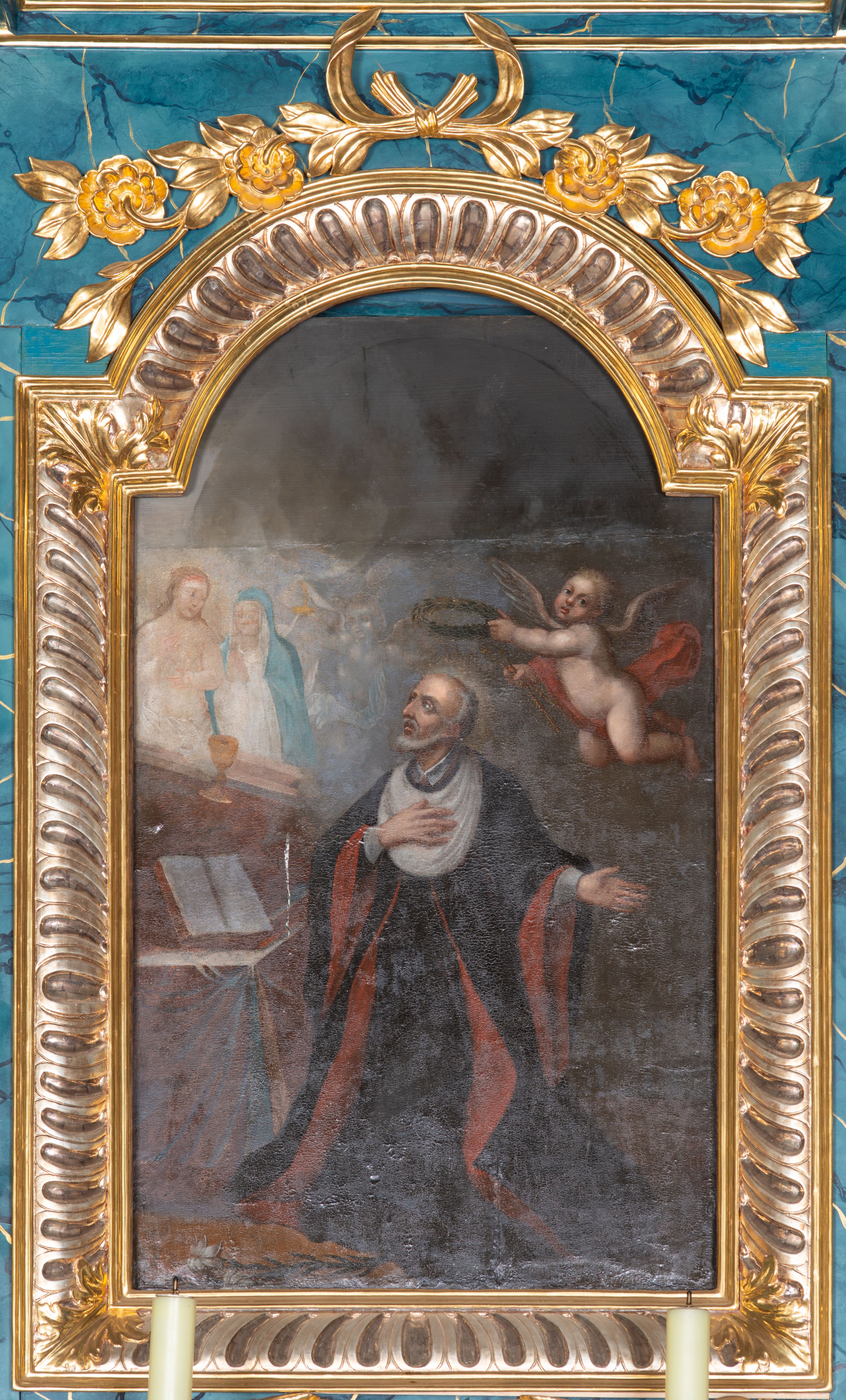 Obraz w kształcie stojącego prostokąta ujęty, profilowaną, rzeźbioną, złoconą i srebrzoną ramą zdobioną motywem puklowania i liśćmi akantu w narożach, zamkniętą nadwieszonym łukiem półkolistym. W centrum przedstawienie klęczącego św. Jana Kantego w trzech czwartych zwróconego w prawo, z delikatnie uniesioną głową. Szczupłą twarz charakteryzują delikatne, wyraziste rysy z krótkim, siwym zarostem. Włosy świętego są krótkie, z wydatną łysiną. Prawa ręka spoczywa na piersi, lewa odchylona w bok. Święty Jan Kanty ubrany jest w czarną togę profesorską z czerwonym podbiciem, spod której widoczny jest biały kołnierzyk. Na piersi opada biała pelerynka. Tuż przed nim, na ziemi leży biała lilia. Przed nim stół nakryty draperią, na którym ustawiona otwarta księga, powyżej, pośród obłoków i postaci aniołków ukazani w półpostaci Chrystus i Maria z dłońmi złożonymi w geście modlitwy, przed którymi stoi kielich. Nad głową świętego unosi się nagie putto częściowo przesłonięte czerwoną szatą, trzymające wieniec laurowy oraz parę skrzyżowanych bereł z godła herbu Uniwersytetu Jagiellońskiego. Kolorystyka ciemna, brunatna, postacie wydobyte światłocieniem.
