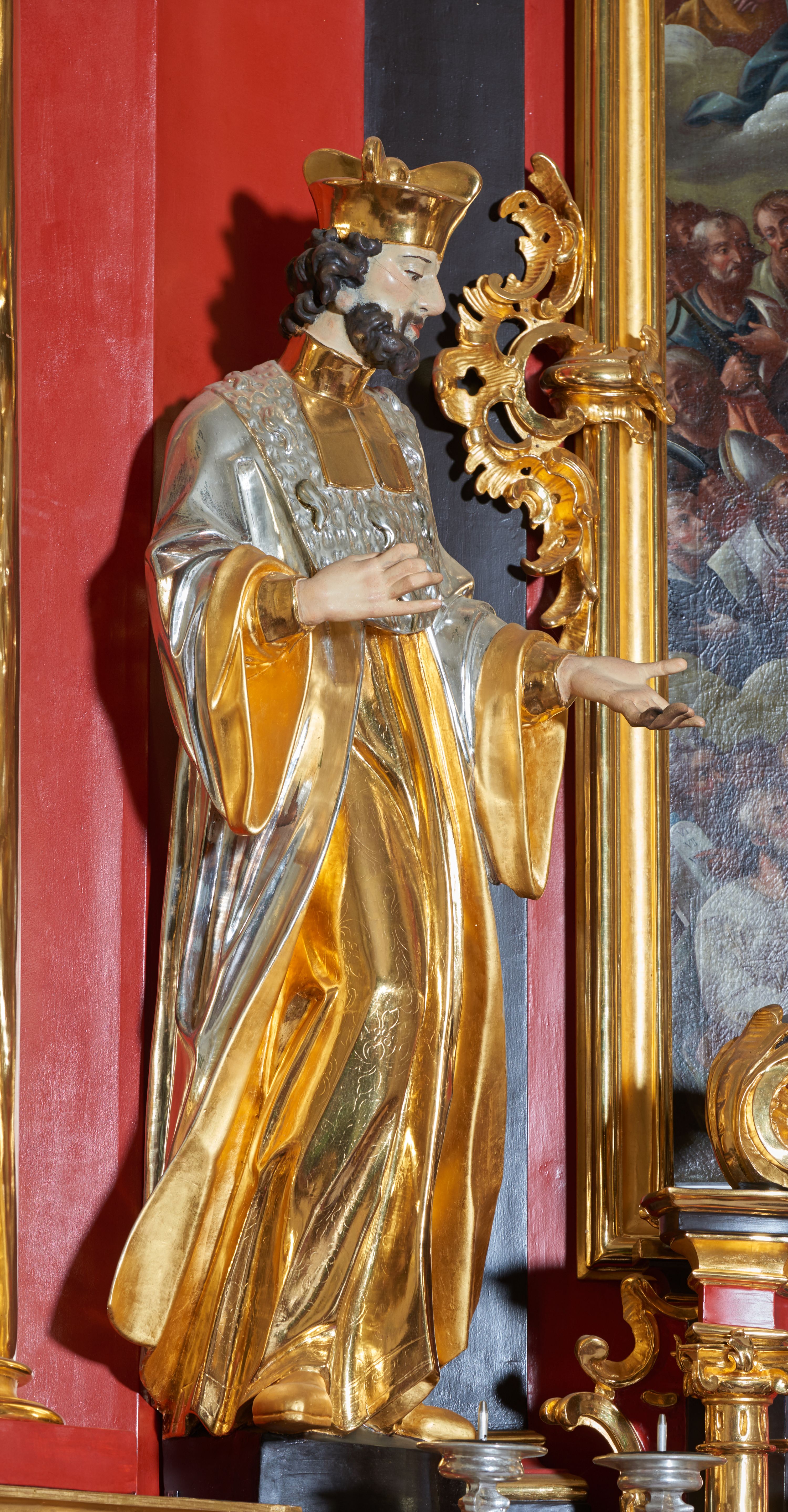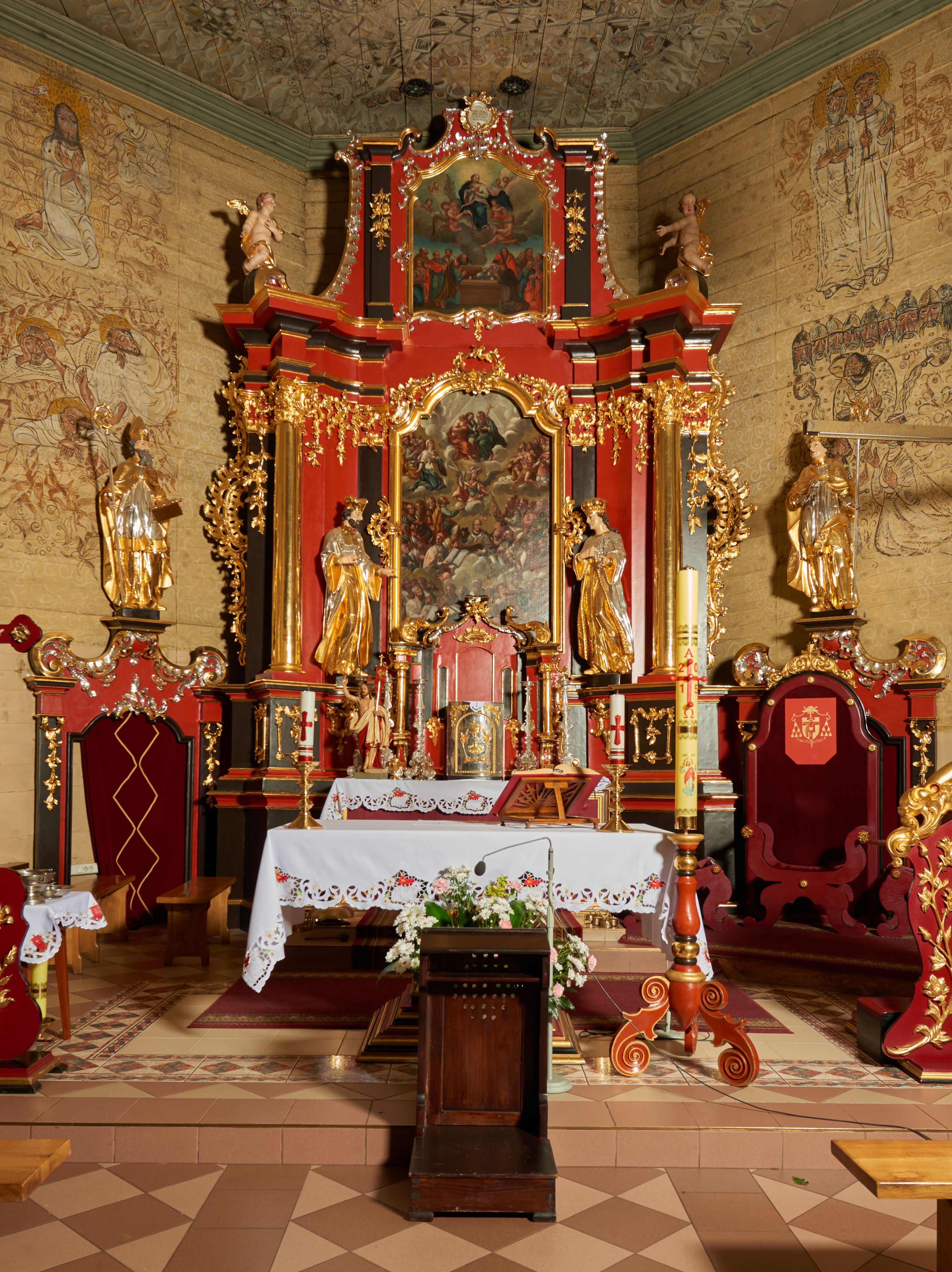 Rzeźba św. Jana Kantego powstała wraz z całą nastawą ołtarzową wkrótce po wybudowaniu kościoła, czyli około 1775 roku prawdopodobnie w warsztacie Johanna Feega. W ołtarzu tym, w polu głównym umieszczono obraz przedstawiający Wszystkich Świętych z początku XVIII wieku (przeniesiony z poprzedniej świątyni); na zasuwie obraz „Ukrzyżowanie” z drugiej połowy XVIII wieku, fundacji księdza Wojciecha Brandysiewicza, dziekana dobczyckiego. Z kolei w zwieńczeniu umieszczono płótno nieznanego artysty, przedstawiające Wniebowzięcie Matki Boskiej z 1775 roku. Ponadto ołtarz zdobią figury trzech innych polskich świętych: św. Wojciecha, św. Stanisława i św. Kazimierza, a także dwie rzeźby aniołków. Ołtarz razem z dekoracją rzeźbiarską był wielokrotnie odnawiany. Jedną z konserwacji (z lat 1884-1887) odnotowano na spodnich częściach baz kolumn. Kolejną wykonał w 1969 roku Jacek Radałowicz, a następną przeprowadzono w 1995 roku. Podczas konserwacji w 1969 roku zbudowano nową mensę z pustaków i nowe stopnie ołtarzowe, podwyższono też ołtarz o około 30 cm (pierwotnie nastawa z glorią sięgała do stropu prezbiterium), usunięto glorię, a w jej miejsce wstawiono kartusz z konfesjonału św. Marii Magdaleny. Ostatnia konserwacja odbyła się w latach 2013-2014.