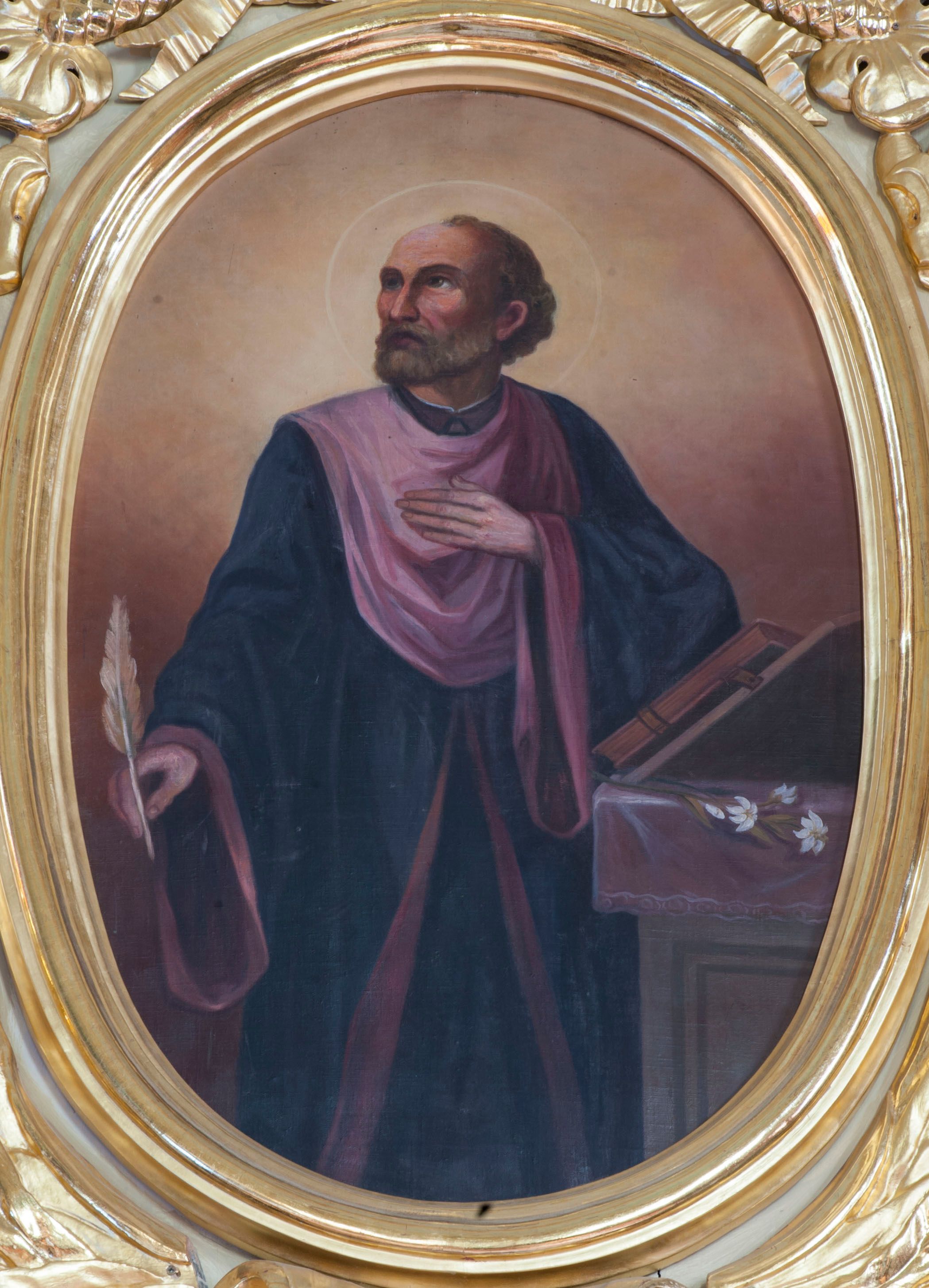 Obraz w kształcie stojącego owalu ujętego złoconą, profilowana ramą. Święty został ukazany do kolan, zwrócony nieznacznie w lewo, z głową odwróconą w przeciwnym kierunku. Ma trójkątną twarz, włosy i zarost krótkie, siwiejące; wokół głowy nimb. Jest ubrany w profesorską togę z szerokimi rękawami, czarną z fioletowymi obszyciami. W prawej, opuszczonej ręce trzyma pióro, lewą składa na piersi. Po prawej stronie kompozycji widoczny pulpit z ułożonymi na nim księgą na podpórce i kwiatem lilii. Tło cieniowane od brązowego w dolnej partii do żółtego w górnej, najjaśniejsze za głową świętego. Kolorystyka ciepła.