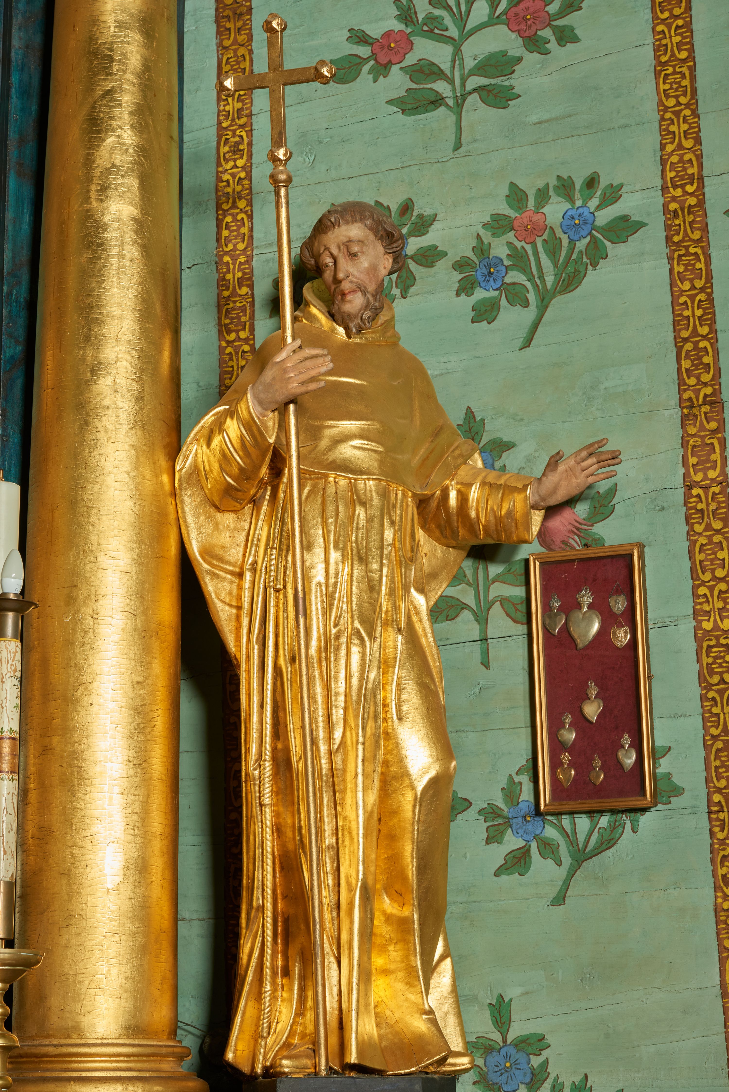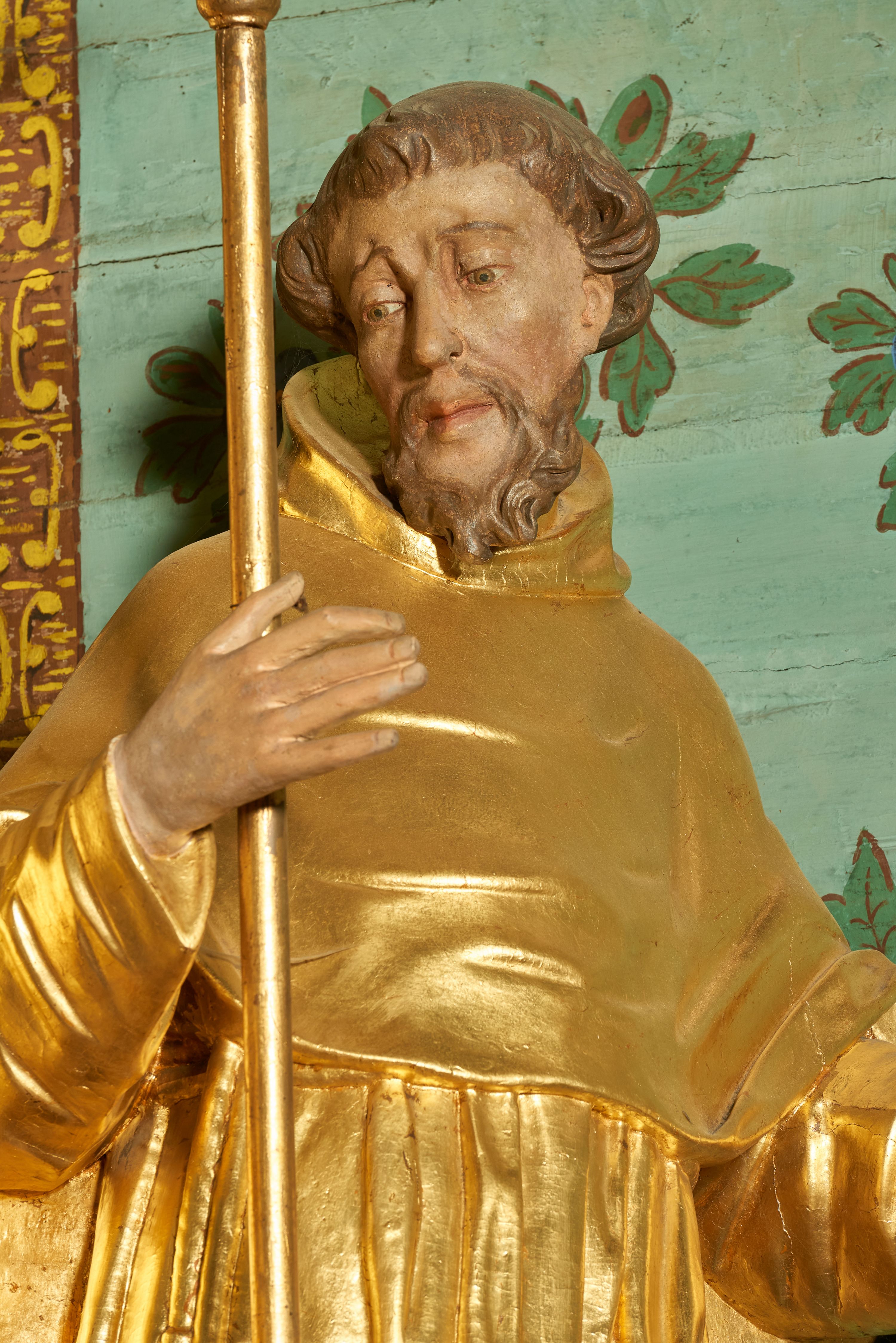 Rzeźba ścięta z tyłu, drążona, ustawiona na niskiej podstawie. Święty ukazany w całej postaci, frontalnie, w kontrapoście, o lekko przechylonej sylwetce, z delikatnie pochyloną głową, skierowaną w prawo; w prawej, ugiętej ręce trzyma laskę zakończoną krzyżem, lewa ma uniesioną i ugiętą. Twarz ma szczupłą, pociągłą, o wyraźnie rzeźbionych, ściągniętych łukach brwiowych, głęboko osadzonych oczach skierowanych w dół, prostym nosie i pełnych ustach; okoloną krótką kręconą brodą oraz krótkimi włosami, układającymi się w grube pukle, na głowie tonsura. Ubrany jest w złocony habit, przewiązany w pasie sznurem z trzema guzami, przylegający ścisłe do ciała, obficie fałdowany w grube, głęboko rzeźbione fałdy. Na ramiona ma narzuconą złoconą pelerynkę z kapturem, dłuższą na plecach, delikatnie marszczoną na piersi. Polichromia ciała figury naturalistyczna.