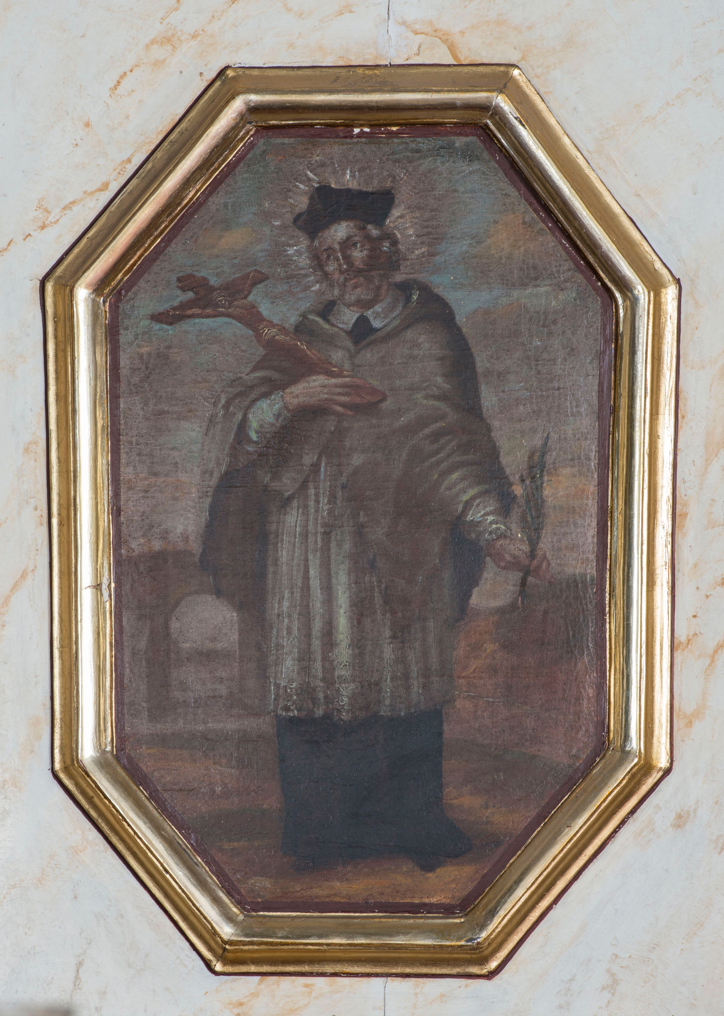 Święty Jan Nepomucen był kanonikiem kolegiaty św. Idziego w Pradze, dlatego przedstawiany jest w stroju odpowiadającym tej godności. Zginął zrzucony z praskiego mostu Karola do rzeki Wełtawy. Najczęściej ukazywany jest jako adorujący krucyfiks trzymany w ręku. Natomiast liść palmy stanowi symbol jego męczeńskiej śmierci.