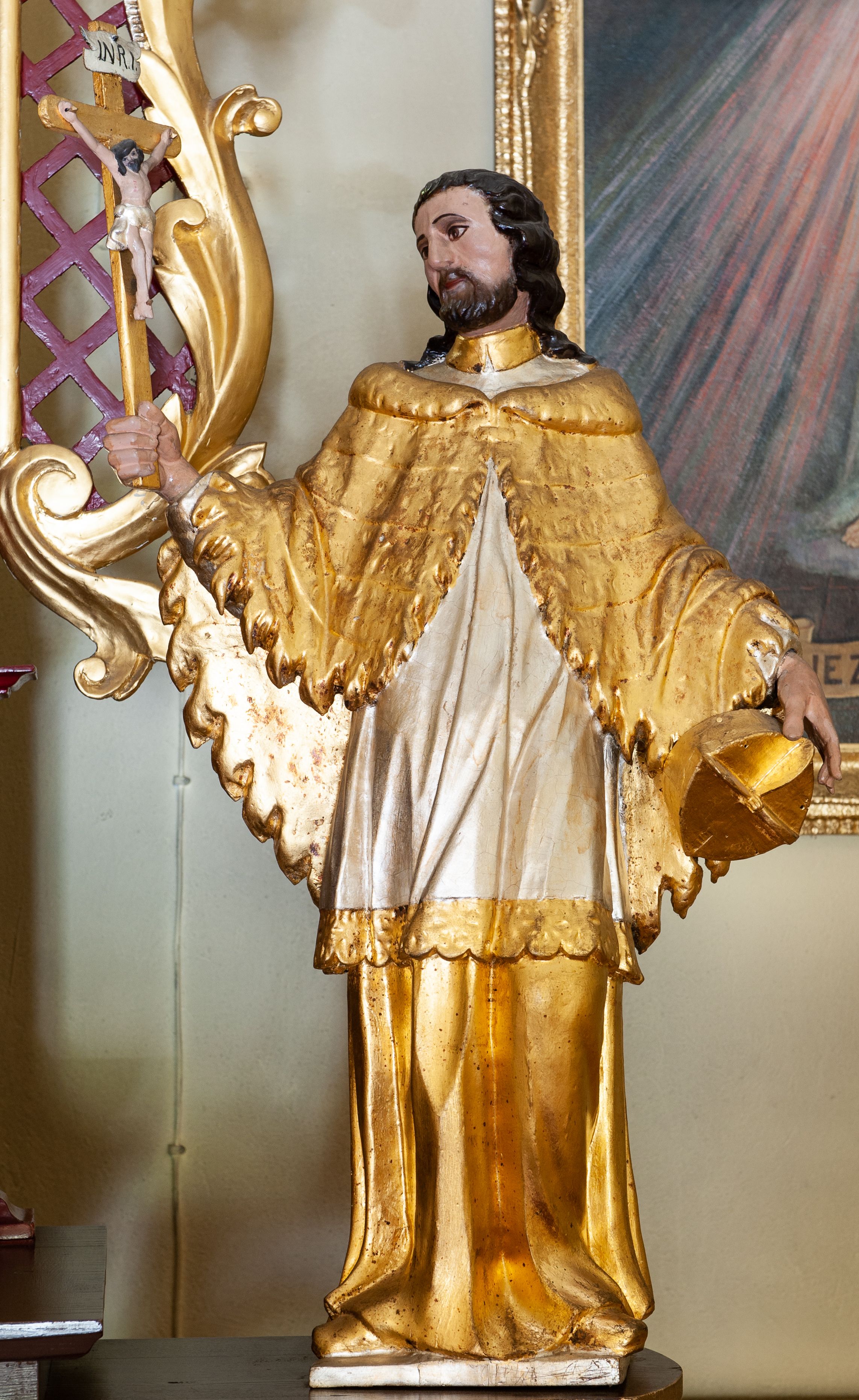 Figura ustawiona na niskiej podstawie. Święty ukazany frontalnie, z głową skierowaną w prawo, w kontrapoście. W prawej, ugiętej i uniesionej ręce trzyma krucyfiks, lewą przytrzymuje przy boku biret. Twarz ma kwadratową, o migdałowatych oczach, krótkim, dużym nosie i wąskich ustach, okoloną krótką brodą i kręconymi włosami sięgającymi ramion. Ubrany jest w złoconą albę, srebrzoną komże ze złoconą koronką przy brzegu oraz złoconą almucję zapiętą pod szyją. Polichromia ciała naturalistyczna.