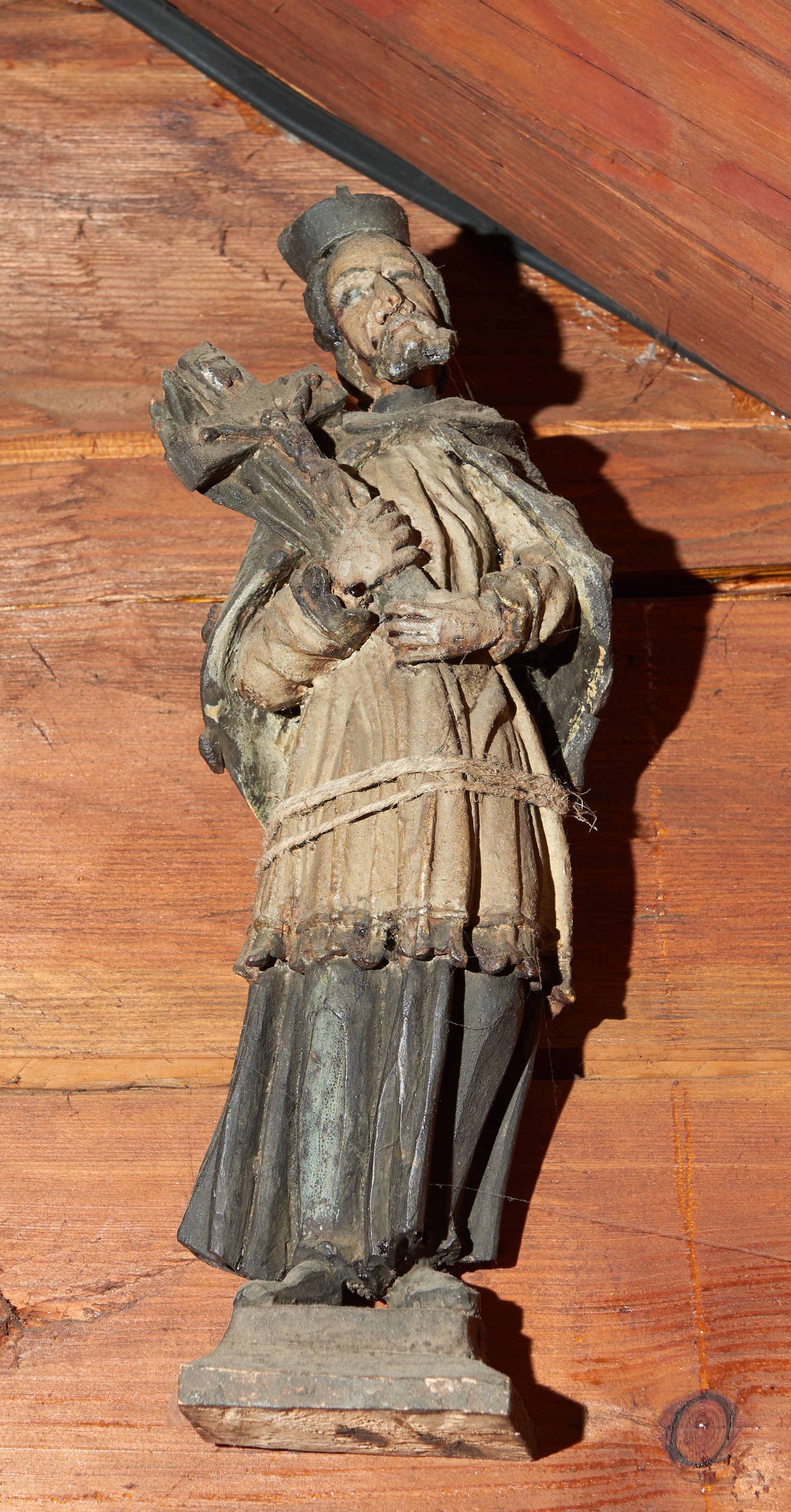 Rzeźba pełnoplastyczna, ustawiona na niewysokim cokole na rzucie prostokąta. Święty ukazany frontalnie, w kontrapoście, o esowato wygiętej sylwetce, z głową przechyloną na prawe ramię. Ręce ugięte w łokciach. Obiema dłońmi podtrzymuje przed sobą krucyfiks oparty na prawym ramieniu. Twarz pociągła, okolona zarostem; włosy krótkie. Ubrany w czarną sutannę, białą delikatnie drapowaną komżę, na ramionach mucet. Na głowie biret. Polichromia naturalistyczna.