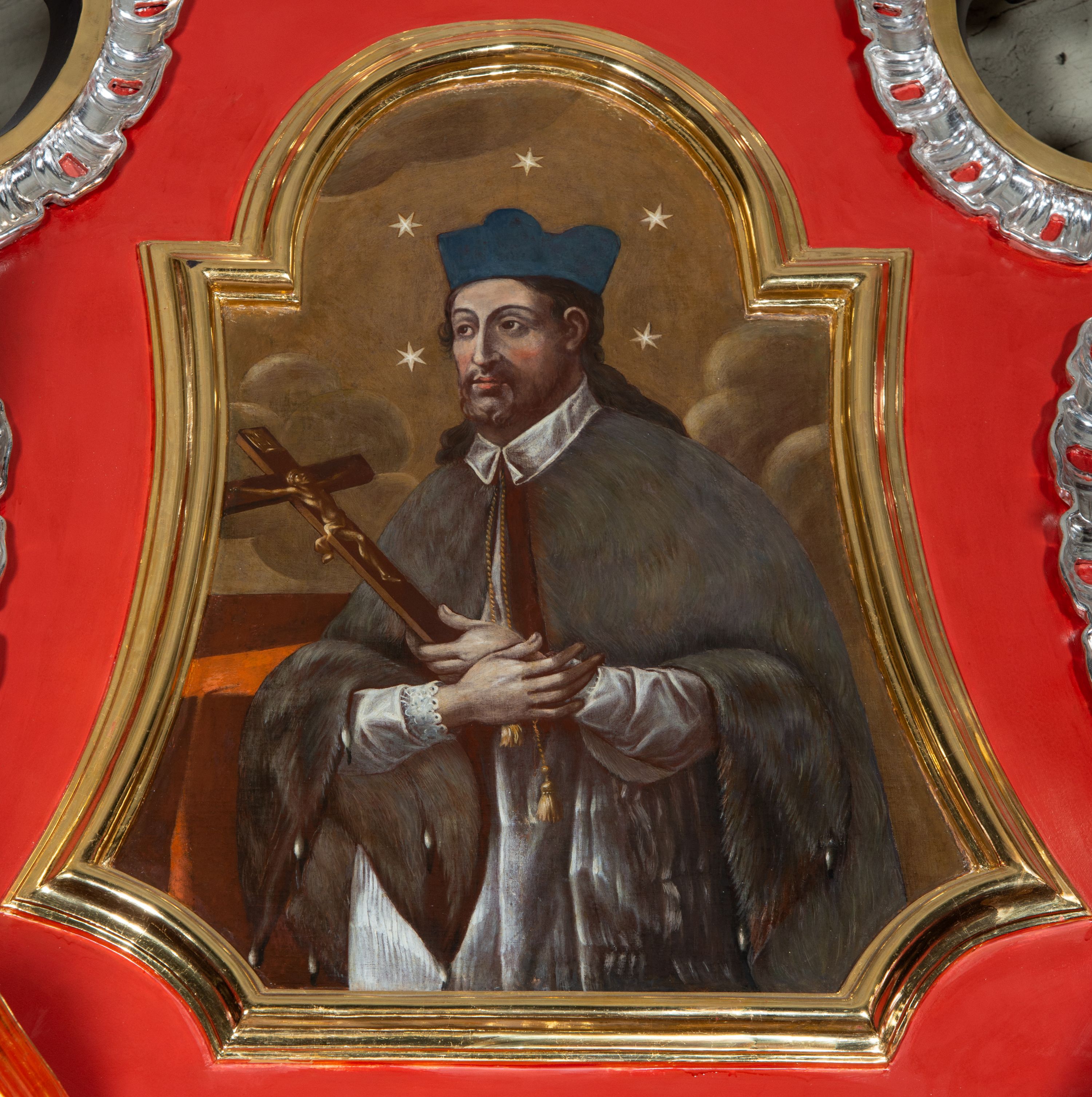 Obraz w kształcie trapezu o wklęsłych ramionach i dolnych narożach, zamknięty łukiem nadwieszonym, ujęty profilowaną, złoconą ramą. Święty ukazany w półpostaci, w trzech czwartych zwrócony prawo z dłońmi skrzyżowanymi na wysokości pasa, w których trzyma krucyfiks. Twarz pociągła o wyrazistych rysach, z krótkim, brązowym zarostem. Włosy długie, falowane, ciemnobrązowe, opadające na plecy i prawe ramię. Święty ubrany jest w albę i almucję, na głowie ma ciemnoniebieski biret. Ręce złożone na piersiach, w lewej dłoni krucyfiks. Po prawej stronie świętego widoczny jest fragment pulpitu. W tle obłoki, wokół głowy pięć gwiazd. Kolorystyka stonowana.