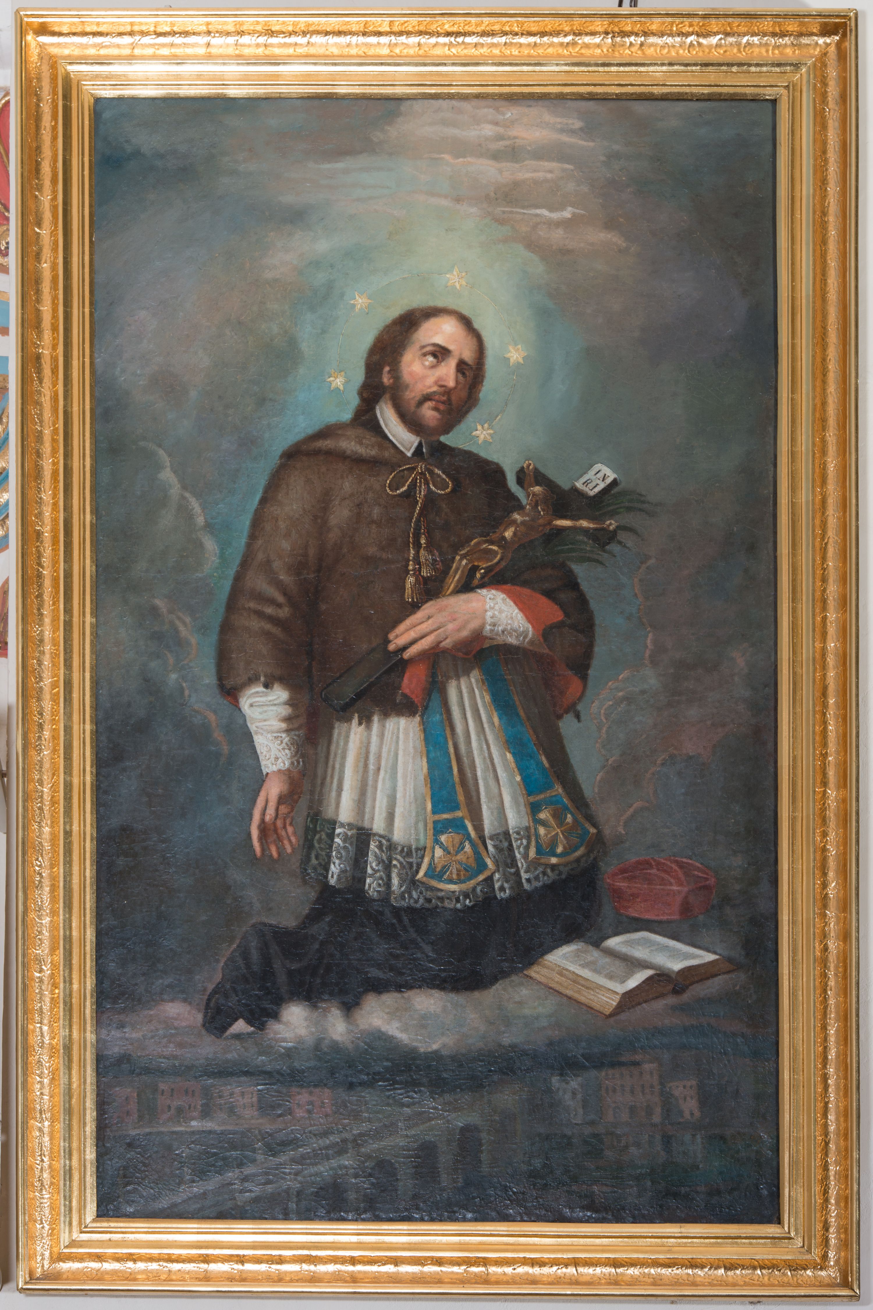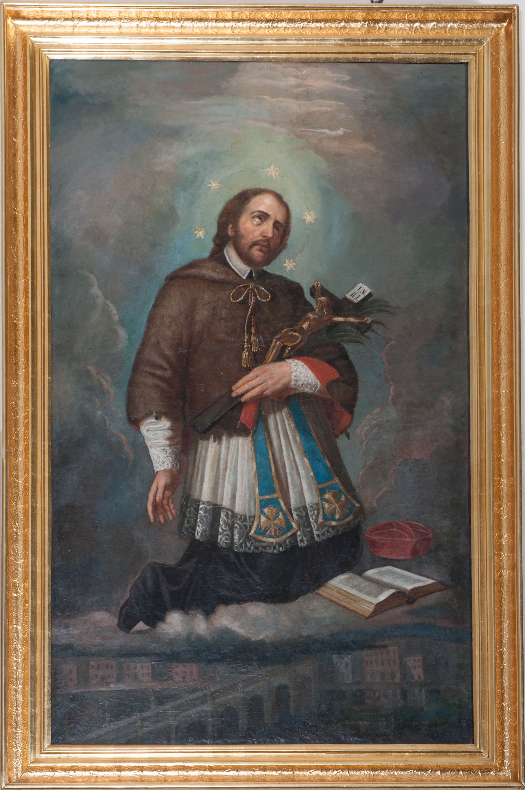 Obraz powstał w XIX wieku, niestety nieznany jest autor tego dzieła. Dzieło utrzymane jest w konwencji barokowej, w zakresie kompozycji tradycyjne, ukazujące świętego w pozycji klęczącej z krzyżem i palmą męczeństwa w dłoni. Święty Jan Nepomucen był kanonikiem kolegiaty św. Idziego w Pradze, dlatego na obrazie został przedstawiony w stroju odpowiadającym tej godności. Święty wmieszany w walkę arcybiskupa Pragi z królem Wacławem, nie chcąc wyjawić tajemnicy spowiedzi, został uwięziony, poddany torturom, aż w końcu zginął zrzucony z mostu Karola do Wełtawy w 1393 roku. Krzyż, który trzyma w dłoni przypomina o jego szczególnej czci wobec Ukrzyżowanego.