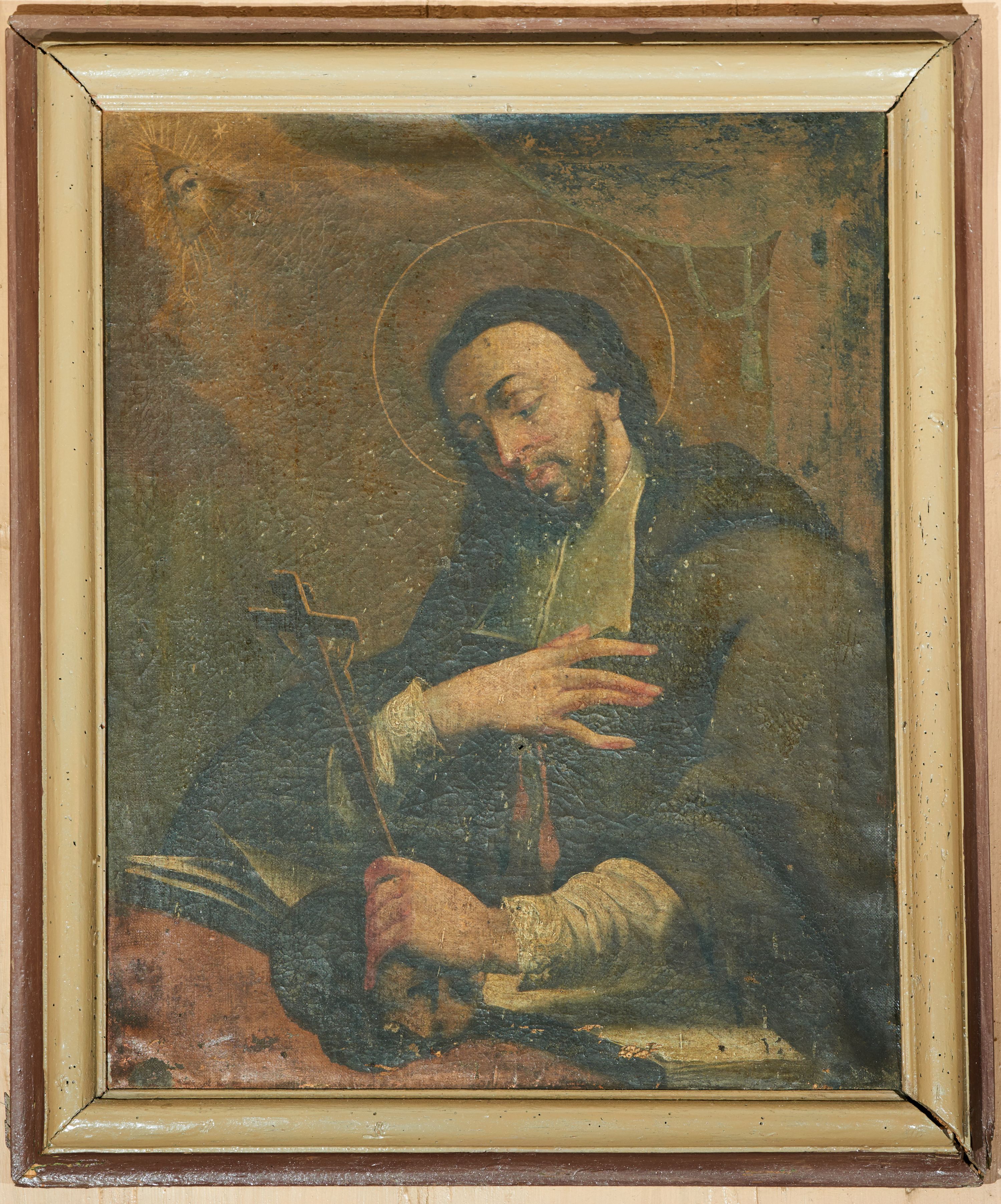 Zły: warstwa malarska w całości spękana, łuszcząca się, silnie zabrudzona, przetarta w górnym prawym rogu. Ubytki i odpryski malatury w środkowej i dolnej partii obrazu. Sfalowane i przedziurawione płótno. Odspojenia ramy, przetarcia polichromii, drewnojady.