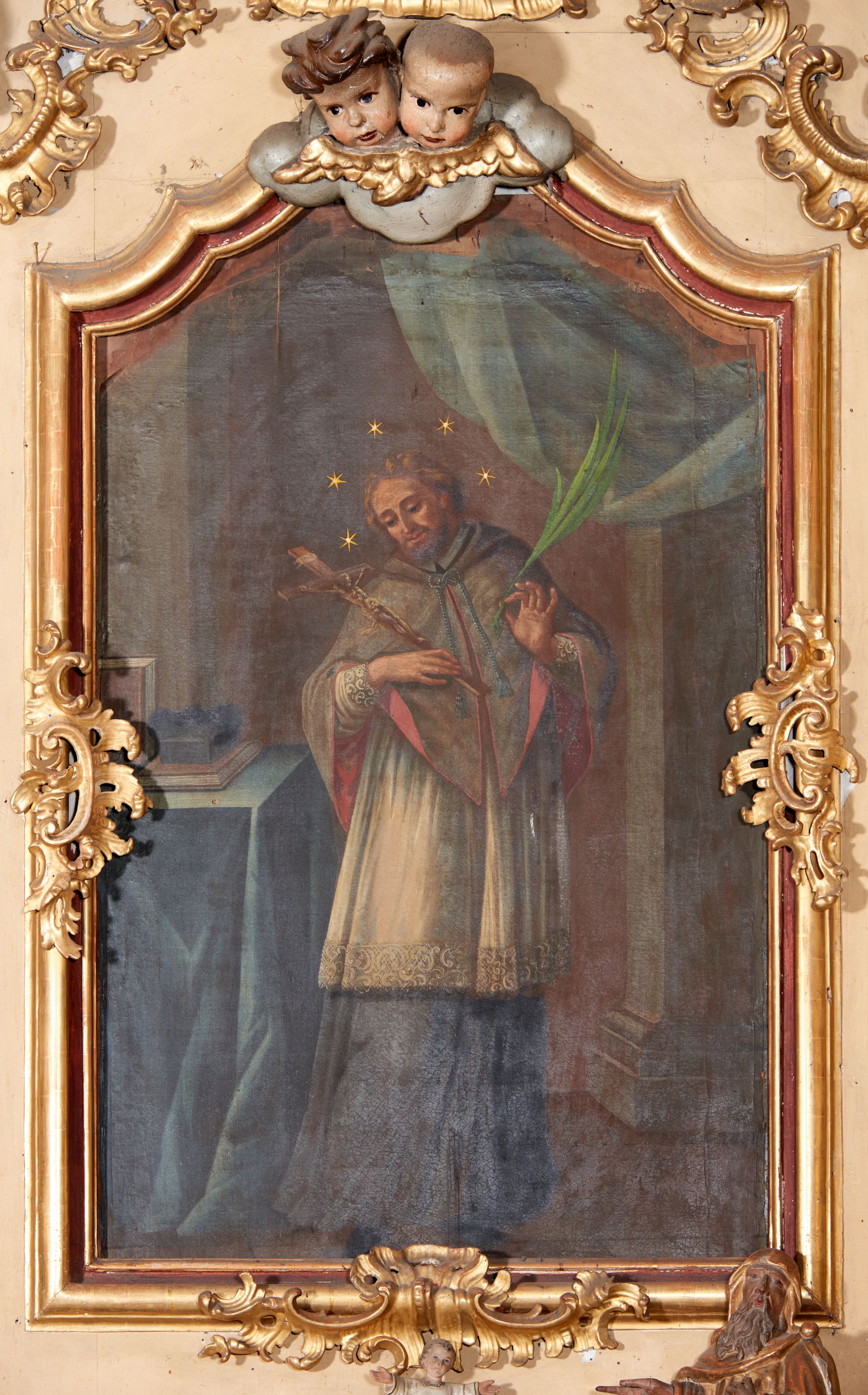 Obraz w formie stojącego prostokąta zamkniętego łukiem segmentowym z uskokiem. W centrum kompozycji całopostaciowe przedstawienie św. Jana Nepomucena, zwróconego delikatnie w lewo, z pochyloną głową skierowaną w prawo. W prawej dłoni trzyma krucyfiks oparty na ramieniu, w lewej, w subtelnym geście, liść palmy. Twarz ma pociągłą, szczupłą, o dużych oczach skierowanych w dół, prostym i długim nosie oraz pełnych ustach. Włosy ma krótkie, jasne, falowane, opadające na tył głowy. Twarz okolona jest krótką brodą. Ubrany jest w czarną komżę, białą albę dekorowaną koronką przy brzegach, delikatnie drapowane w gęste równoległe fałdy; jasnobrązową almucję z czerwoną podszewką, zawiązaną pod szyją sznurkiem i narzuconą na ramiona. Wokół głowy nimb z pięciu gwiazd. W lewej części obrazu, obok świętego ukazany stół nakryty niebieską tkaniną, na którym leżą księgi i biret. Scena ukazana we wnętrzu, z widocznymi fragmentami filarów po dwóch stronach kompozycji oraz jasnoniebieską tkaniną podwieszoną w prawym górnym rogu.