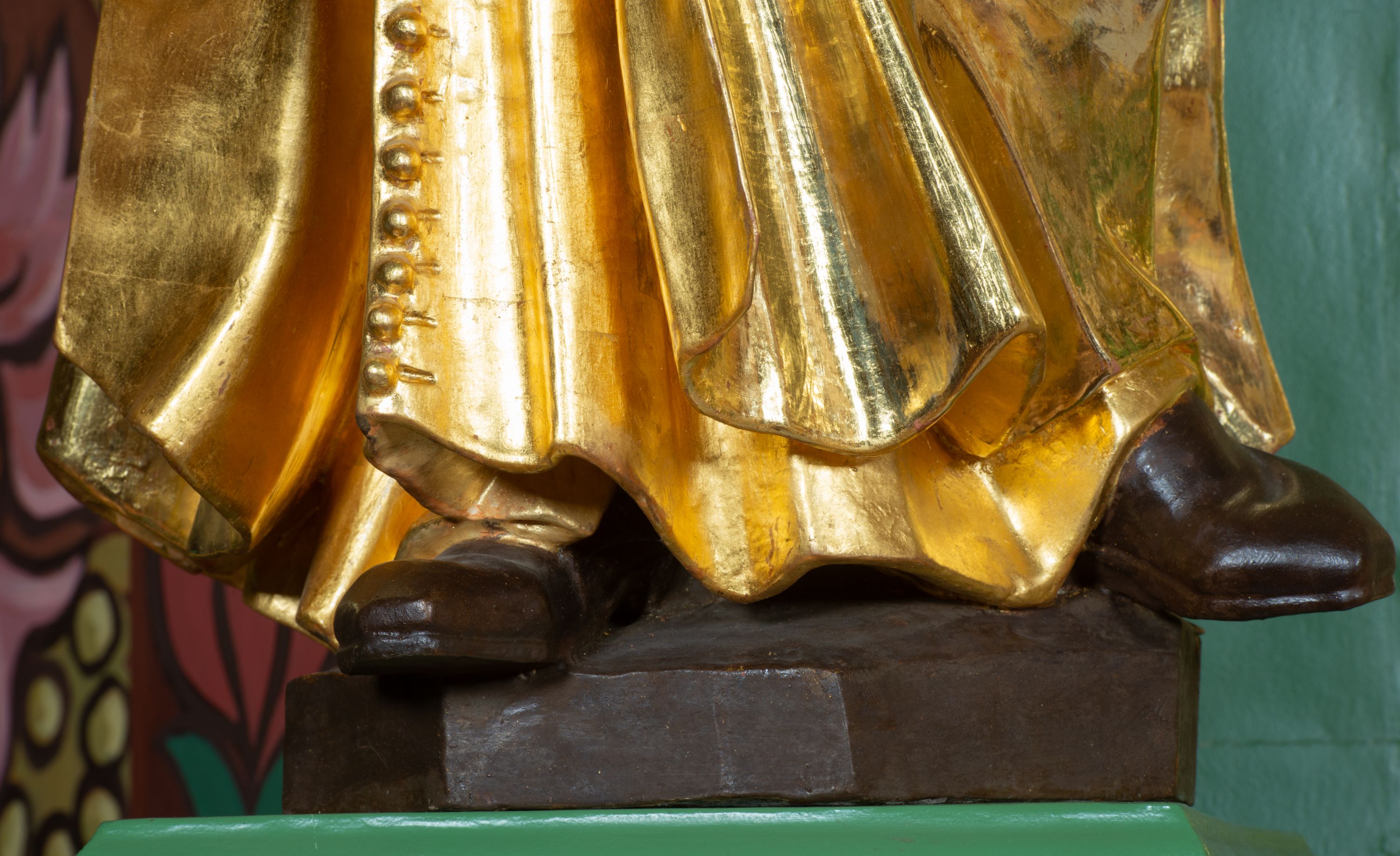 Rzeźba pełna, na cokole ukazująca św. Jana Nepomucena w całej postaci, w kontrapoście z ciałem skręconym lekko w lewą stronę. Święty wznosi wzrok do góry, w prawej, uniesionej ręce trzyma krucyfiks, lewą przytrzymuje opartą na biodrze, zamkniętą księgę. Ma kwadratową twarz o wąskich brwiach, dużych, migdałowatych oczach, dużym nosie i wyraźnie zarysowanych ustach, okoloną krótką brodą i układającymi się w pukle włosami. Jest ubrany w strój kanonika: ma narzuconą na sutannę futrzaną almucję, pod szyją befkę – formę krótkiego krawata. Należący do stroju biret leży na księdze; na nogach ma buty o ściętych czubkach. Polichromia w partiach ciała naturalistyczna, szaty złocone, atrybuty złocone i srebrzone, krzyż brązowy.