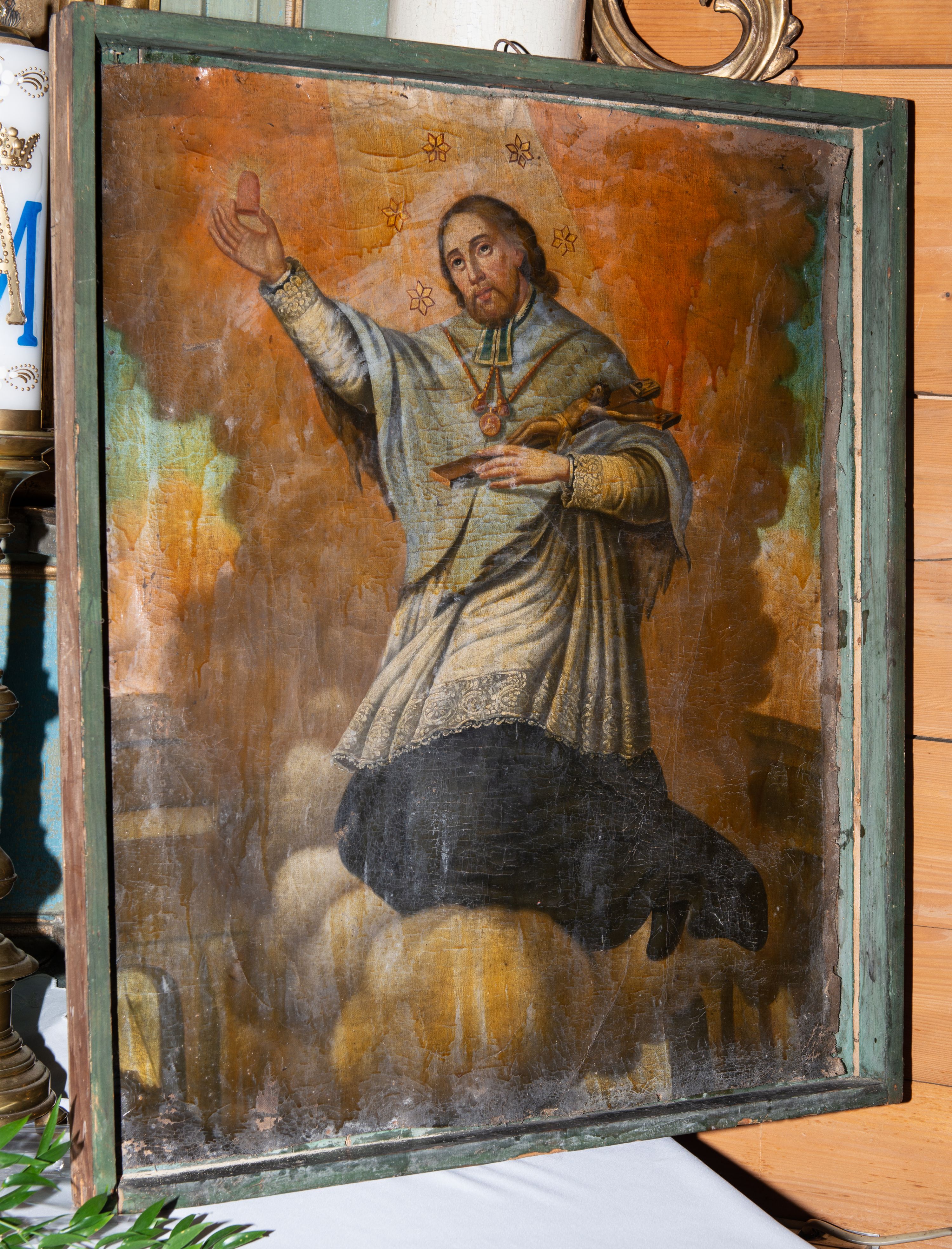 Obraz powstał w XVIII wieku, niestety nieznany jest jego autor. Dzieło zostało utrzymane w konwencji barokowej, w zakresie kompozycji tradycyjnie, ukazujące świętego w pozycji klęczącej z krucyfiksem i odciętym językiem w dłoni. Święty Jan Nepomucen był kanonikiem kolegiaty św. Idziego w Pradze, dlatego na obrazie został przedstawiony w stroju odpowiadającym tej godności. Święty wmieszany w walkę arcybiskupa Pragi z królem Wacławem, nie chcąc wyjawić tajemnicy spowiedzi, został uwięziony, poddany torturom, aż w końcu zginął zrzucony z mostu Karola do Wełtawy w 1393 roku. Krzyż, który ma w dłoni przypomina o jego szczególnej czci wobec Ukrzyżowanego. Święty na omawianym obrazie trzyma w dłoni język stanowiący symbol dochowanej przez niego tajemnicy spowiedzi.