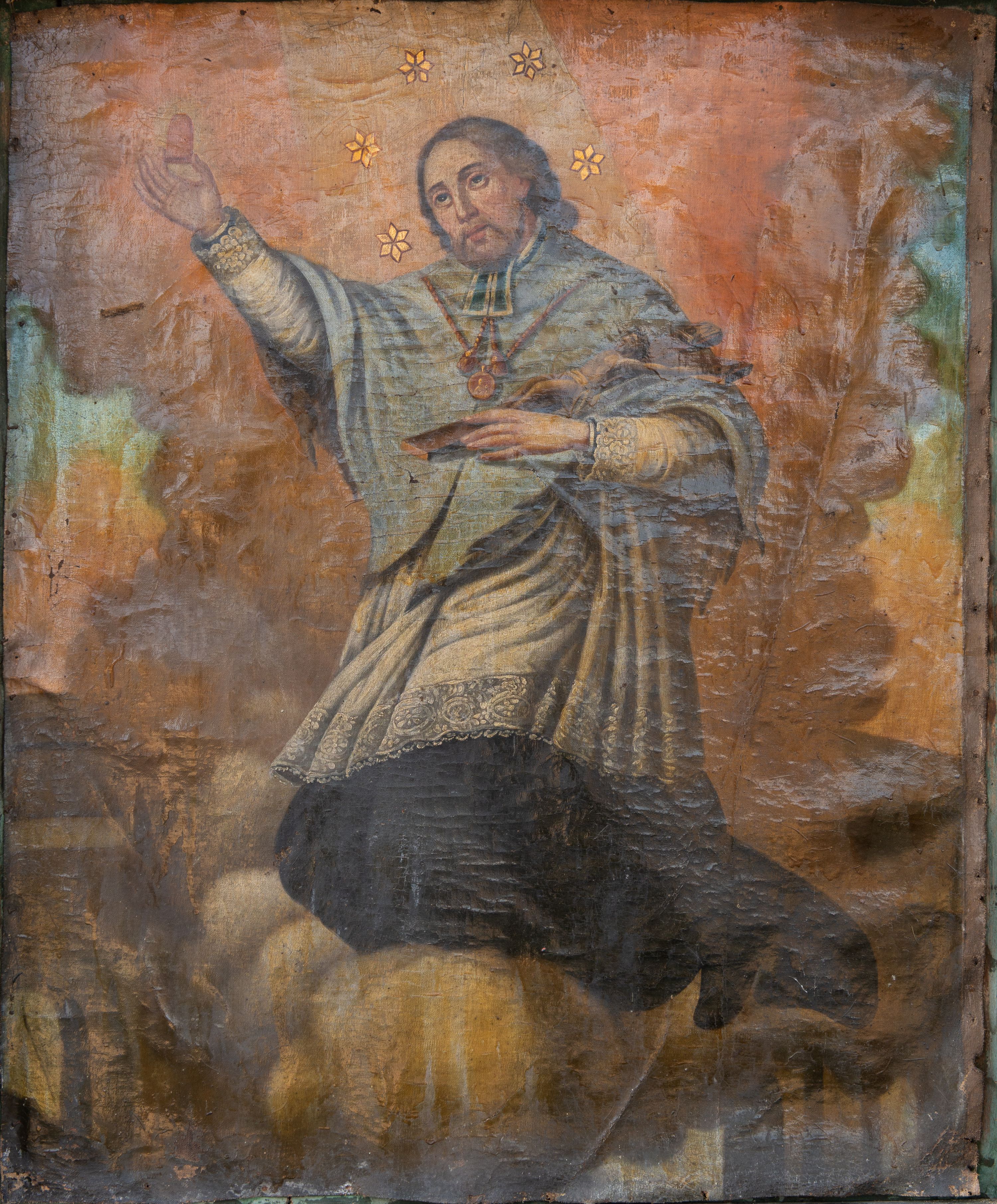 Zły, powierzchnia obrazu mocno zabrudzona. Płótno mocno zdeformowane, odkształcone i pogniecione. Krawędzie płótna przycięte do formatu ramy, zachowane jedynie prawe obrzeże. Ubytki warstwy malarskiej niewielkie. Na całej powierzchni widoczne zacieki pożółkłego werniksu.