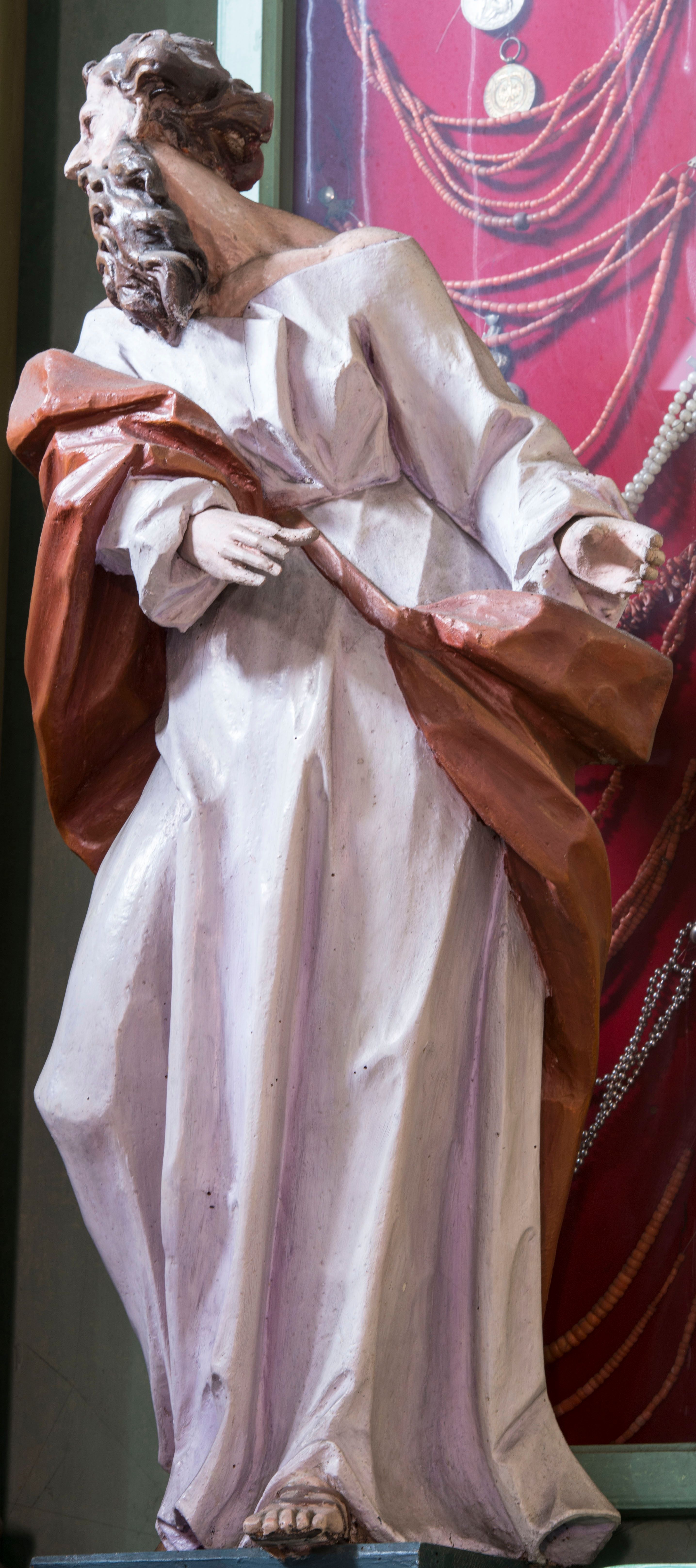 Rzeźba pełna, posadowiona na niskim cokole. Święty ukazany całopostaciowo, zwrócony w prawo, w silnym kontrapoście z prawą nogą odsuniętą do tyłu, z głową ukazaną z profilu, skierowaną w prawo. Obie ręce zwrócone w lewą stronę. Twarz szczupła, pociągła, o wydatnym, wąskim nosie i płytkich oczodołach, okolona długą gęstą brodą i krótkimi układającymi się w pukle włosami jakby rozwianymi do tyłu. Postać jest ubrana w jasną suknię sięgającą stóp, o dużym dekolcie odsłaniającym ramiona. Tkanina przylega do ciała, drapowana jest w grube, pojedyncze fałdy. Okrywający plecy brązowy płaszcz przerzucony przez prawe ramię i lewe biodro jest spięty taśmą na przodzie. Polichromia naturalistyczna.