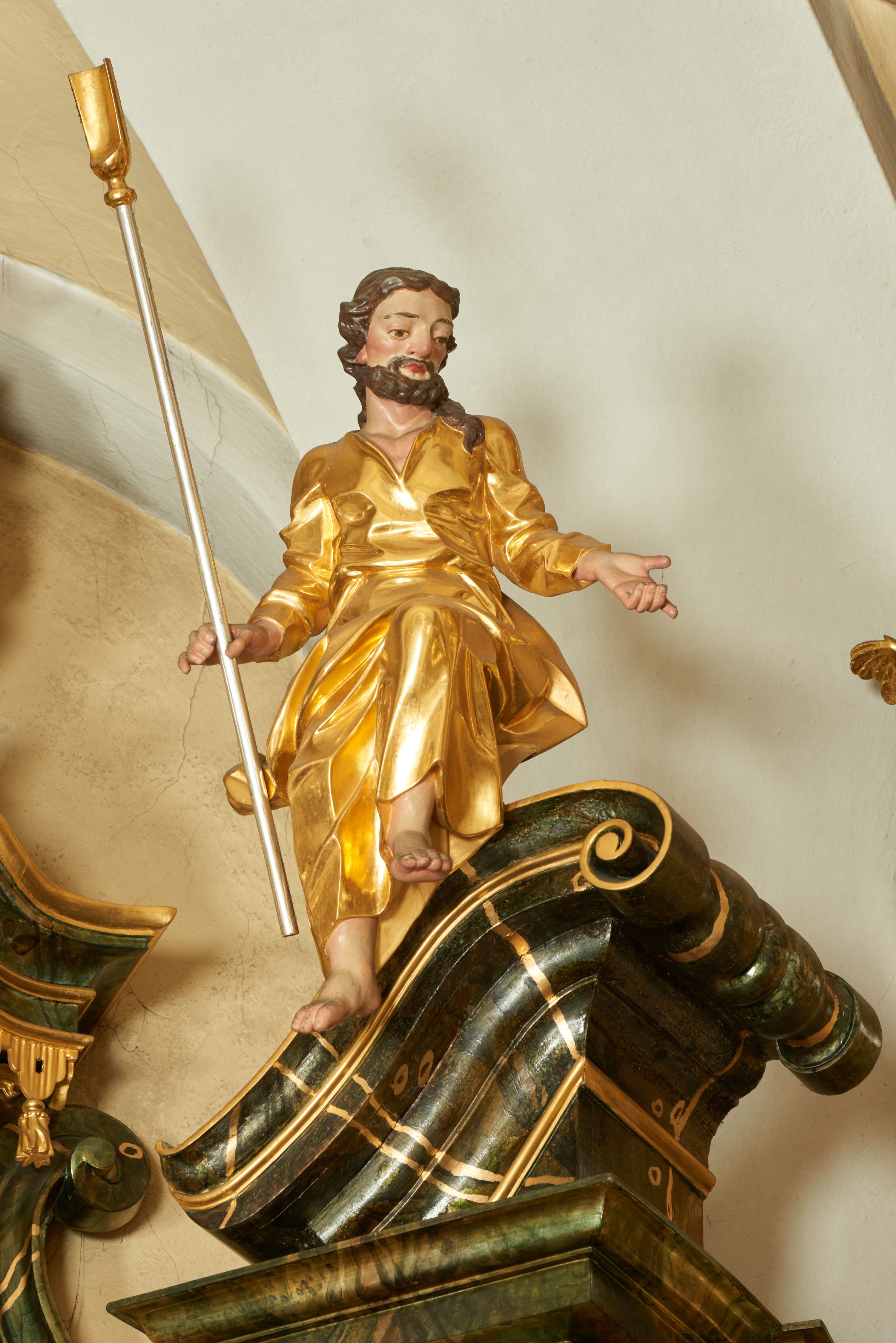 Rzeźba przedstawia św. Joachima, który według tekstów apokryficznych wywodził się z zamożnej rodziny z Galilei, był mężem św. Anny i ojcem Najświętszej Marii Panny. Małżeństwo przez wiele lat nie mogło doczekać się potomstwa. Joachim po tym jak został wyrzucony ze świątyni przez kapłanów podczas składania ofiar, udał się w góry ze swoją trzodą. Dlatego w omawianej rzeźbie trzyma w dłoni szuflę pasterską. W ikonografii przedstawiany jest jako dojrzały mężczyzna lub starzec. Kij o charakterystycznym zakończeniu jest jednym z atrybutów św. Joachima obok pary gołębi, owieczki lub anioła (kij został ukazany m.in. na grafice Johanna Georga Bergmüllera z około 1730 roku).