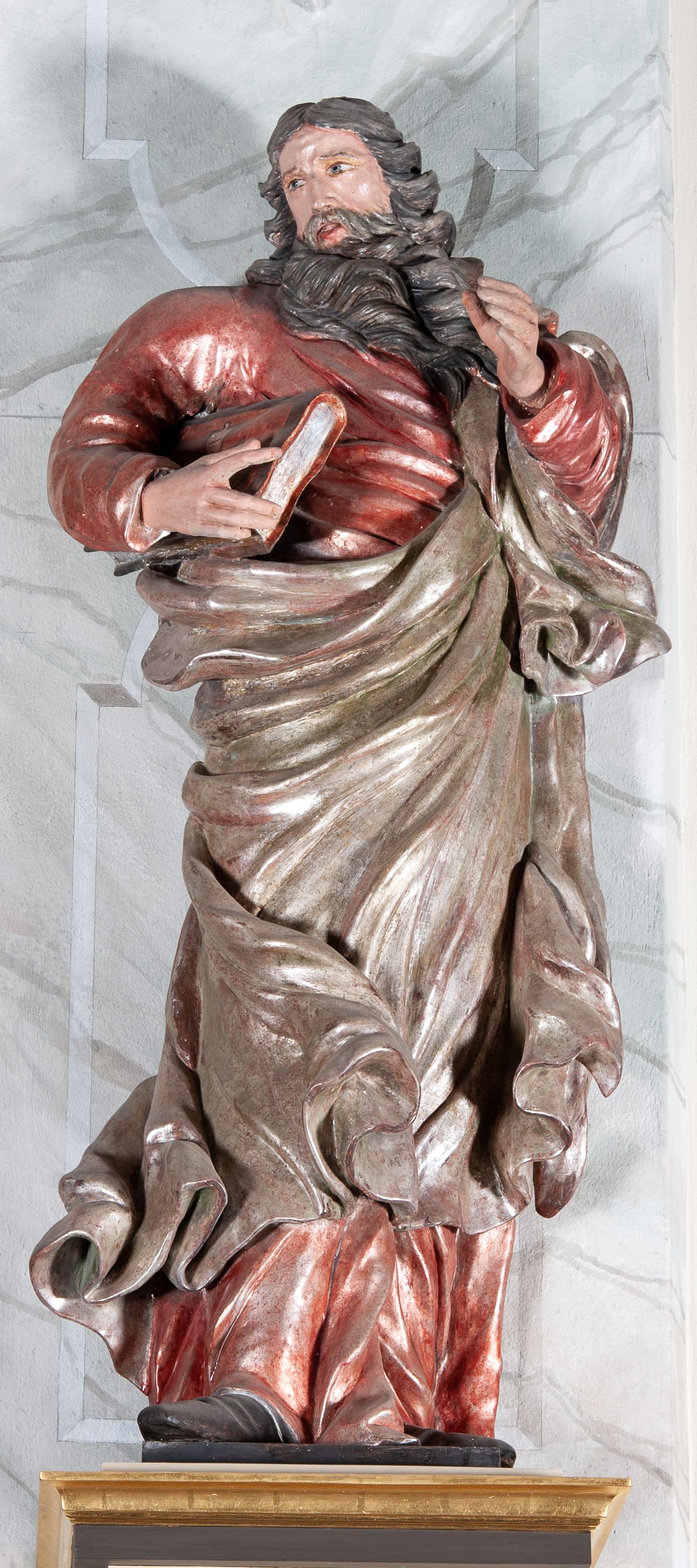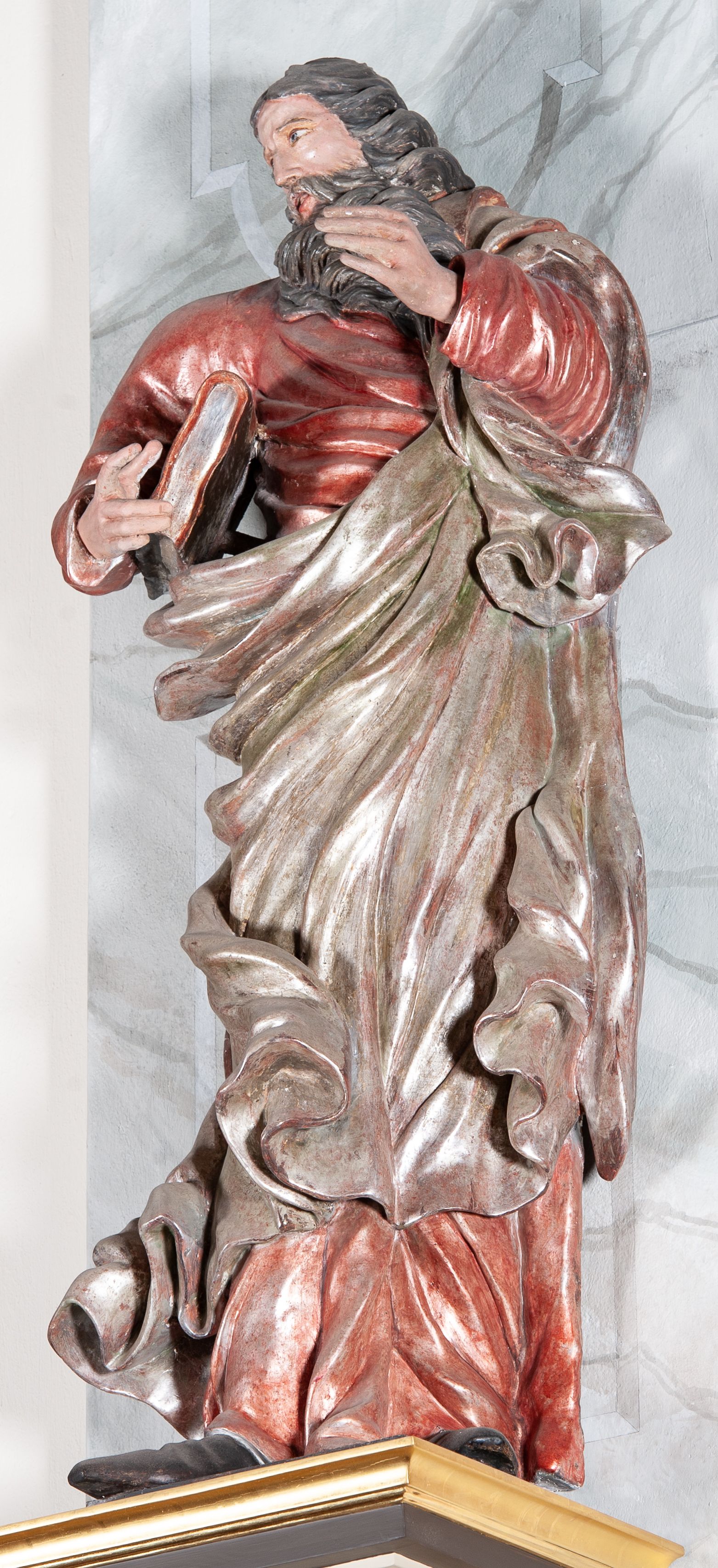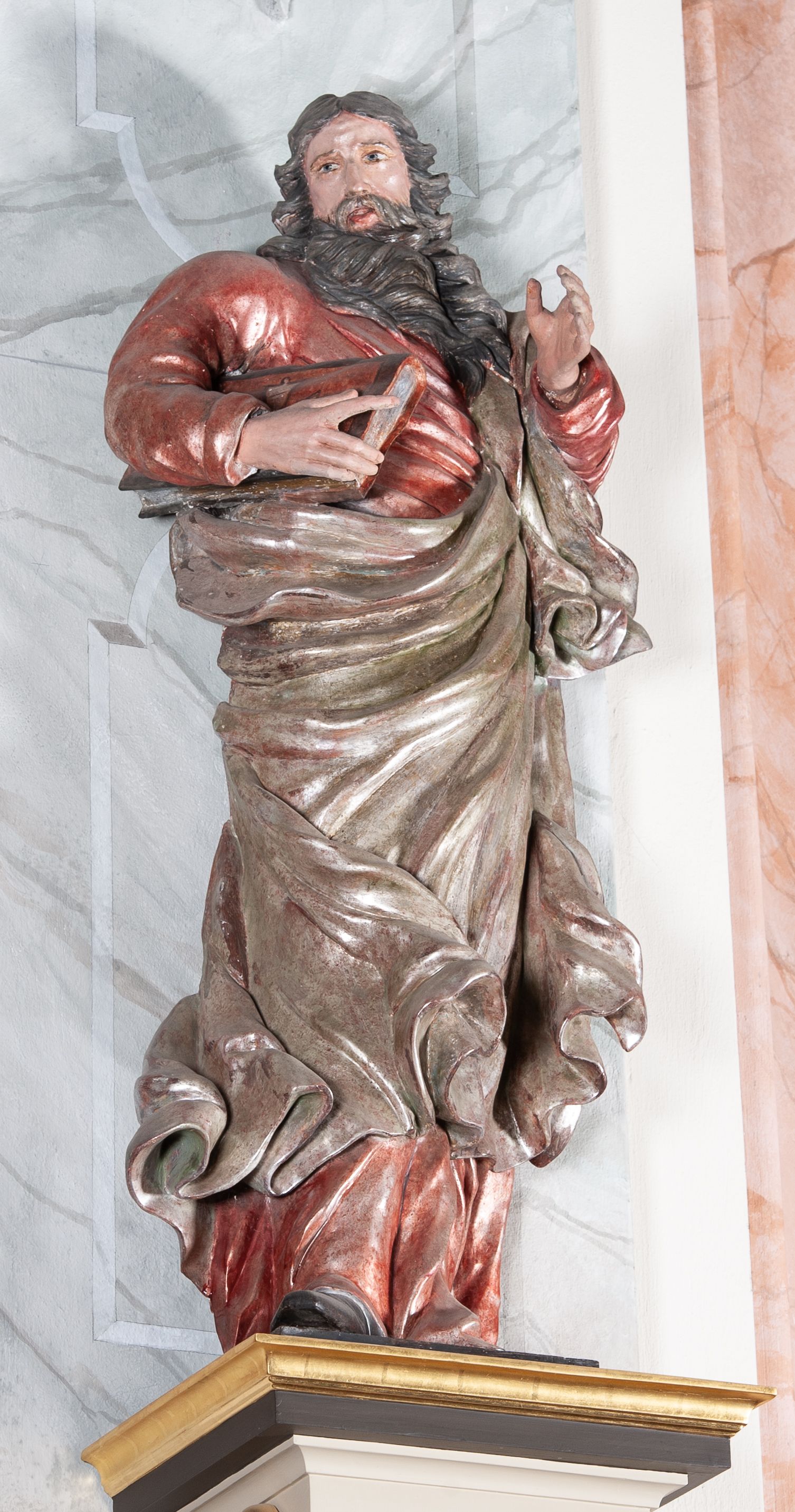 Figura drążona, mocno ścięta z tyłu, przedstawiająca św. Joachima. Święty ustawiony frontalnie, lewa ręka uniesiona i wysunięta przed siebie, a prawą, ugiętą podtrzymuje przy boku księgę. Głowę ma skierowaną w prawą stronę, delikatnie pochyloną. Twarz szeroka z długim nosem o niewielkich oczach patrzących w bok oraz delikatnie rozchylonych ustach; okolona długą brodą w postaci silnie skręconych dwóch pukli opadających diagonalnie na pierś. Włosy długie z przedziałkiem na środku głowy, kręcone, opadają na plecy i lewe ramię. Święty ubrany jest w czerwoną, silnie przylegającą do ciała suknię z wąskimi rękawami oraz brązowy płaszcz przerzucony przez lewe ramię, opadający przez plecy, otaczający postać i odsłaniający klatkę piersiową. Tkanina ekspresyjnie drapowana, obficie fałdowana z rozwianym spodem. Polichromia naturalistyczna w partiach ciała.