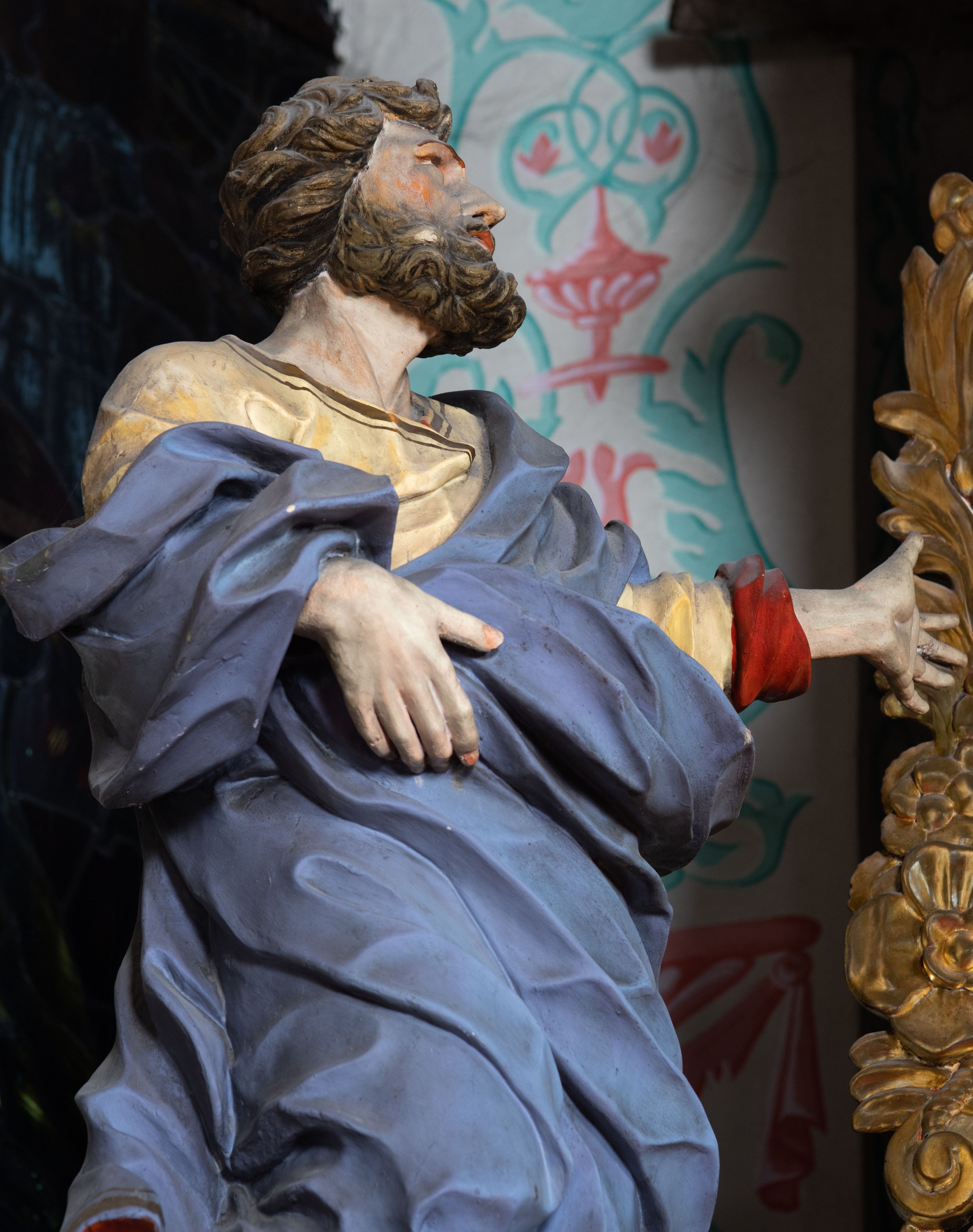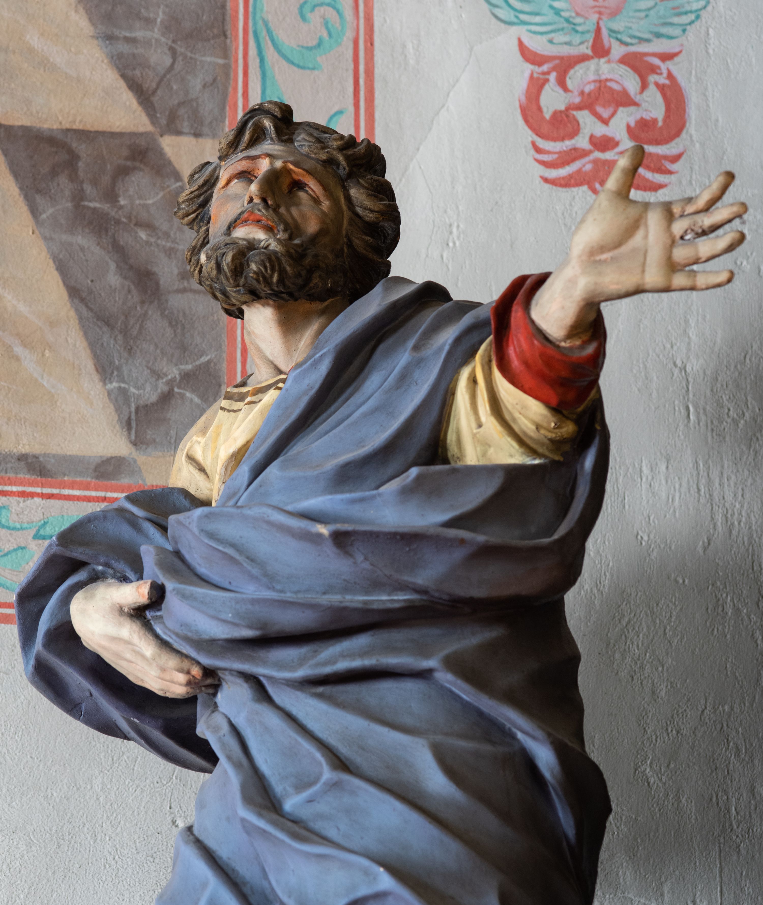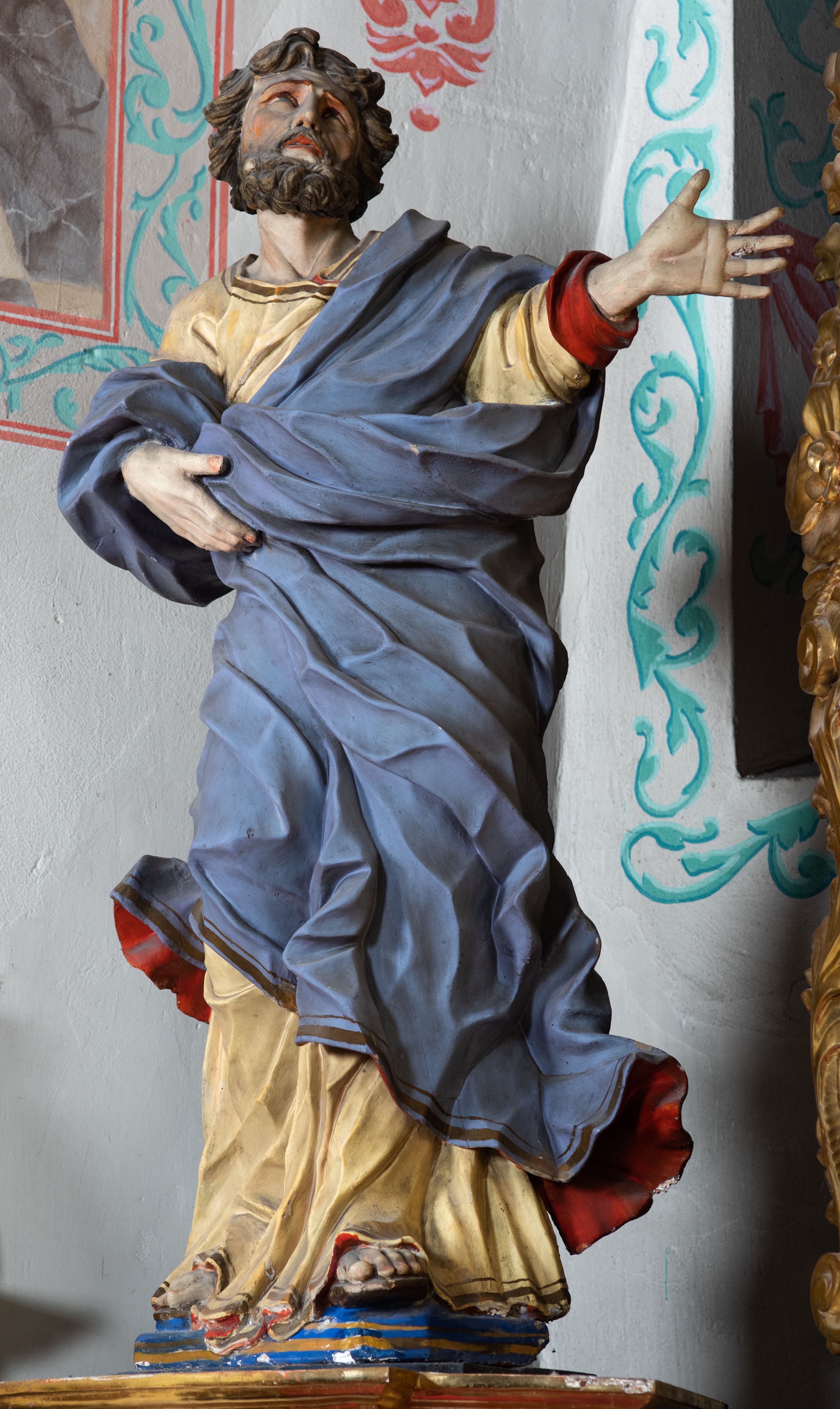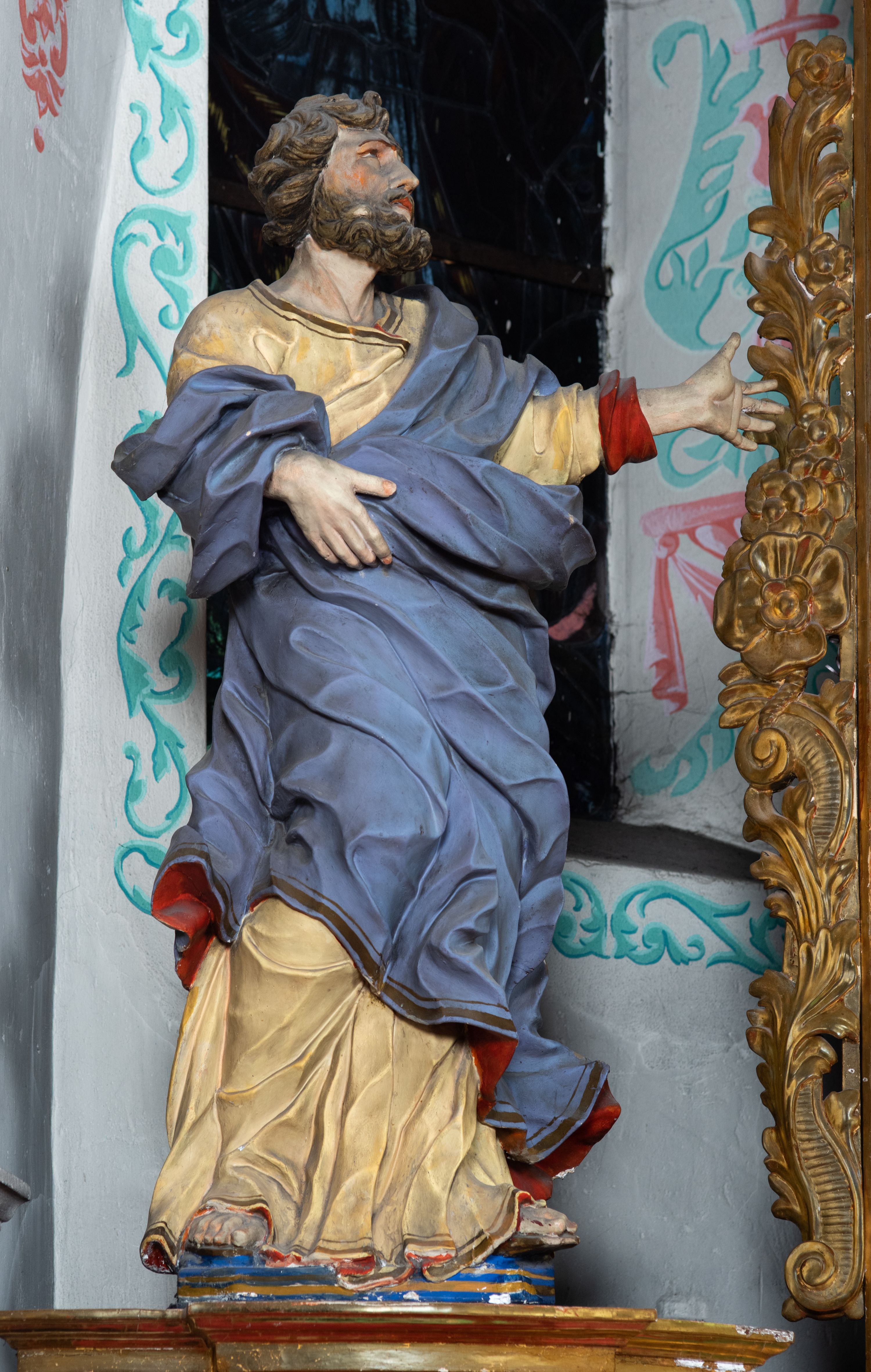 Rzeźba ścięta z tyłu i drążona. Święty zwrócony w trzech czwartych w lewo, w kontrapoście, z uniesiona głową. Lewą, uniesioną rękę wyciąga w bok, prawą podtrzymuje z przodu połę płaszcza. Twarz ma szczupłą, kwadratową, o migdałowatych oczach skierowanych w górę, ostrym profilu nosa oraz wąskich rozchylonych ustach. Włosy i broda brązowe, krótkie, rzeźbione w silnie skręcone, pojedyncze pukle. Ubrany jest w jasnożółtą, silnie drapowaną tunikę ze złoconą lamówką oraz niebieski płaszcz zarzucony na ramiona i zawinięty wokół ciała postaci, silnie skręcony, drapowany i rozwiany od spodu, zdobiony brązową lamówką i podbity czerwonym podbiciem. Polichromia ciała naturalistyczna.