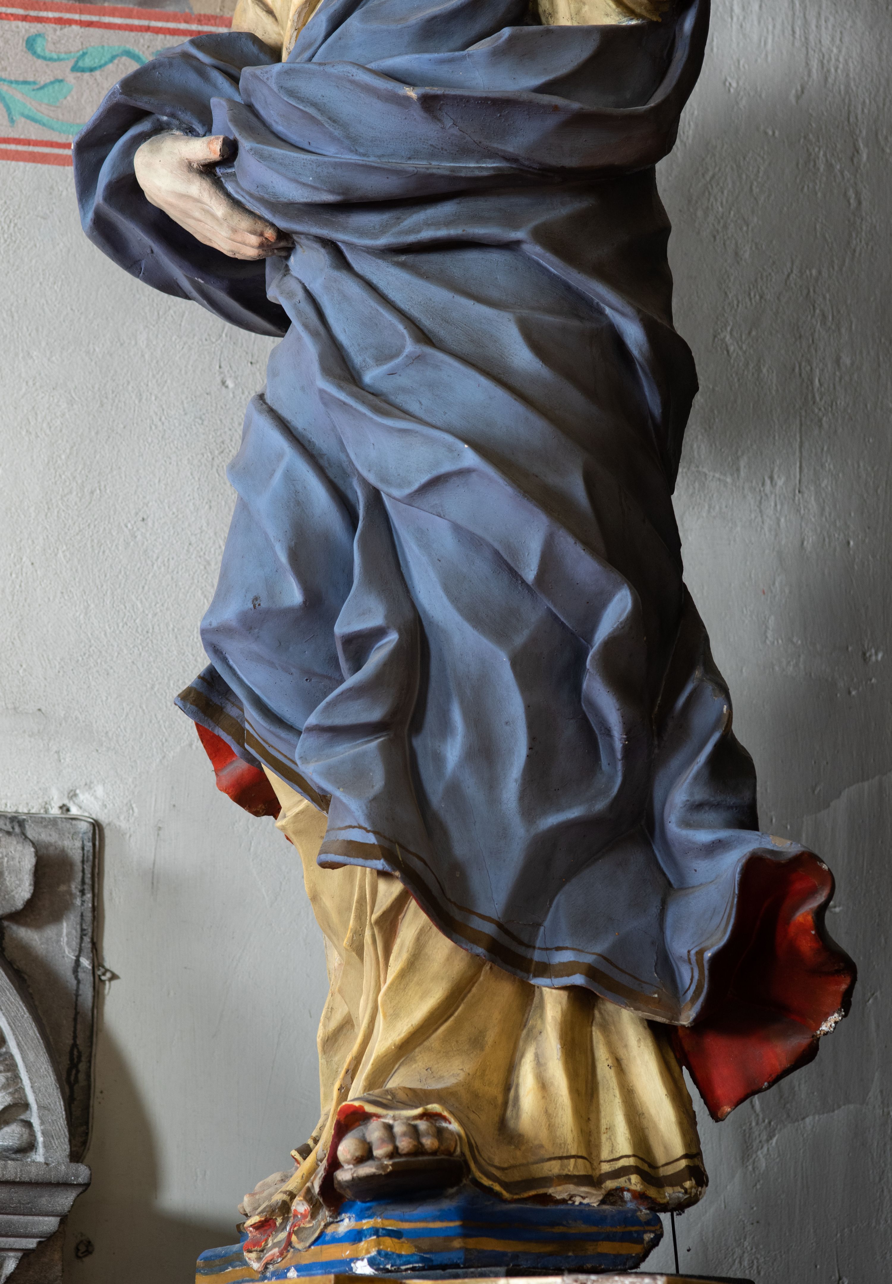 Ubytki mechaniczne podstawy i krawędzi szat, odpryski polichromii, silne zabrudzenia. Pierwotnie figura była najpewniej złocona.