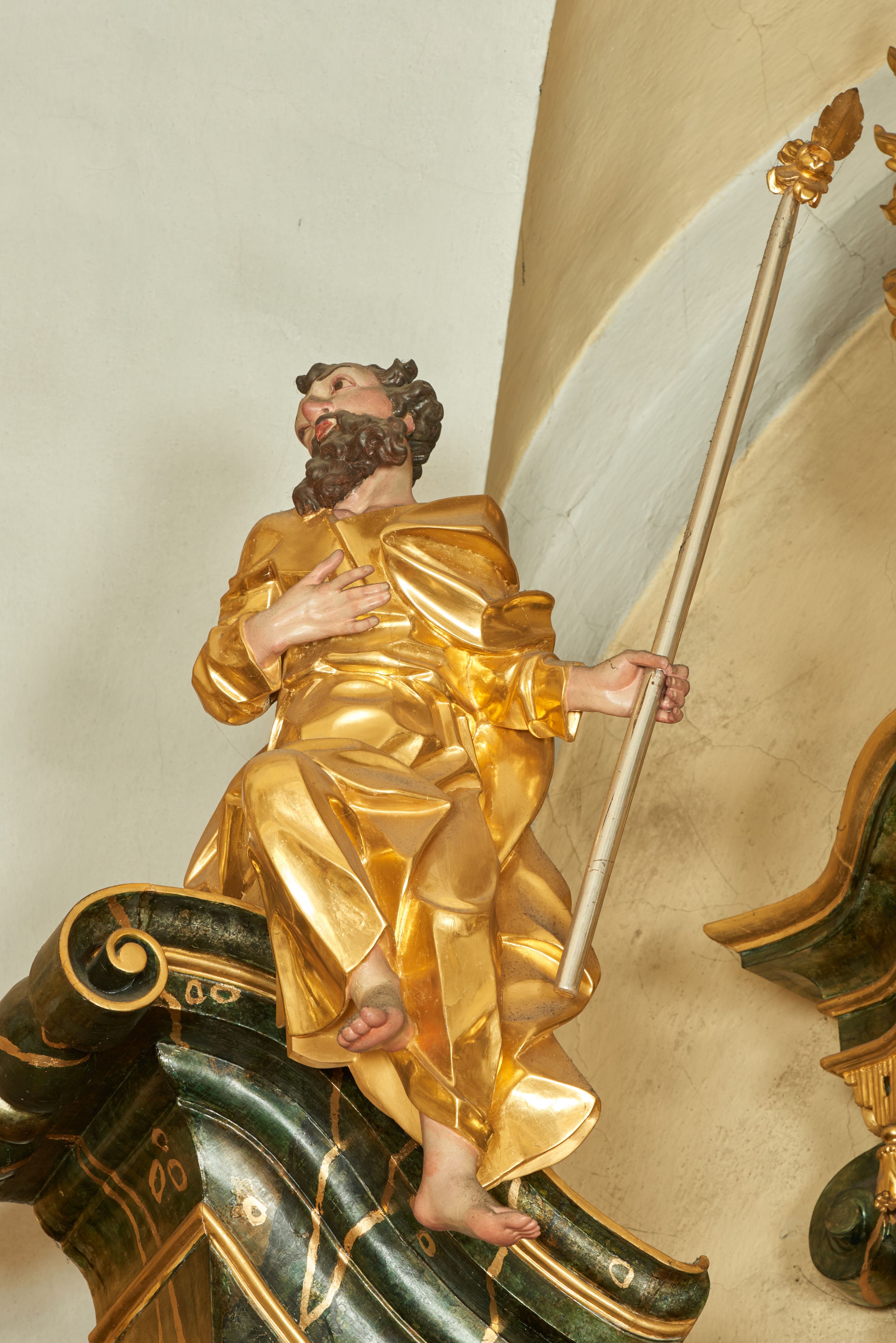 Rzeźba umieszczona jest na ołtarzu głównym, który po raz pierwszy został odnotowany w księdze rachunkowej kościoła „Rationes Ecclesiae Felso Lapsensis”. W 1776 roku umieszczono w niej informację o Janie Joanellim z Tolvano – fundatorze, który sprawił zdobienie ołtarza oraz zatrudnił czterech malarzy pracujących w kościele przez następnych pięć tygodni. W latach 1777-1778, odnotowano zakup obrazów, a pod kolejną datą wydatków zapisanych w księdze rachunków świątyni odnotowano nazwisko twórcy rzeźb umieszczonych na ołtarzu – Johanna Feega. Jednakże analiza stylistyczna dzieł pozwala wyodrębnić dwóch twórców całego ołtarza: Johanna Feega oraz jego brata Franciszka. Franciszek wykonał rzeźby w dolnej partii ołtarza, natomiast Johann – w górnej części wraz z rzeźbą św. Józefa.