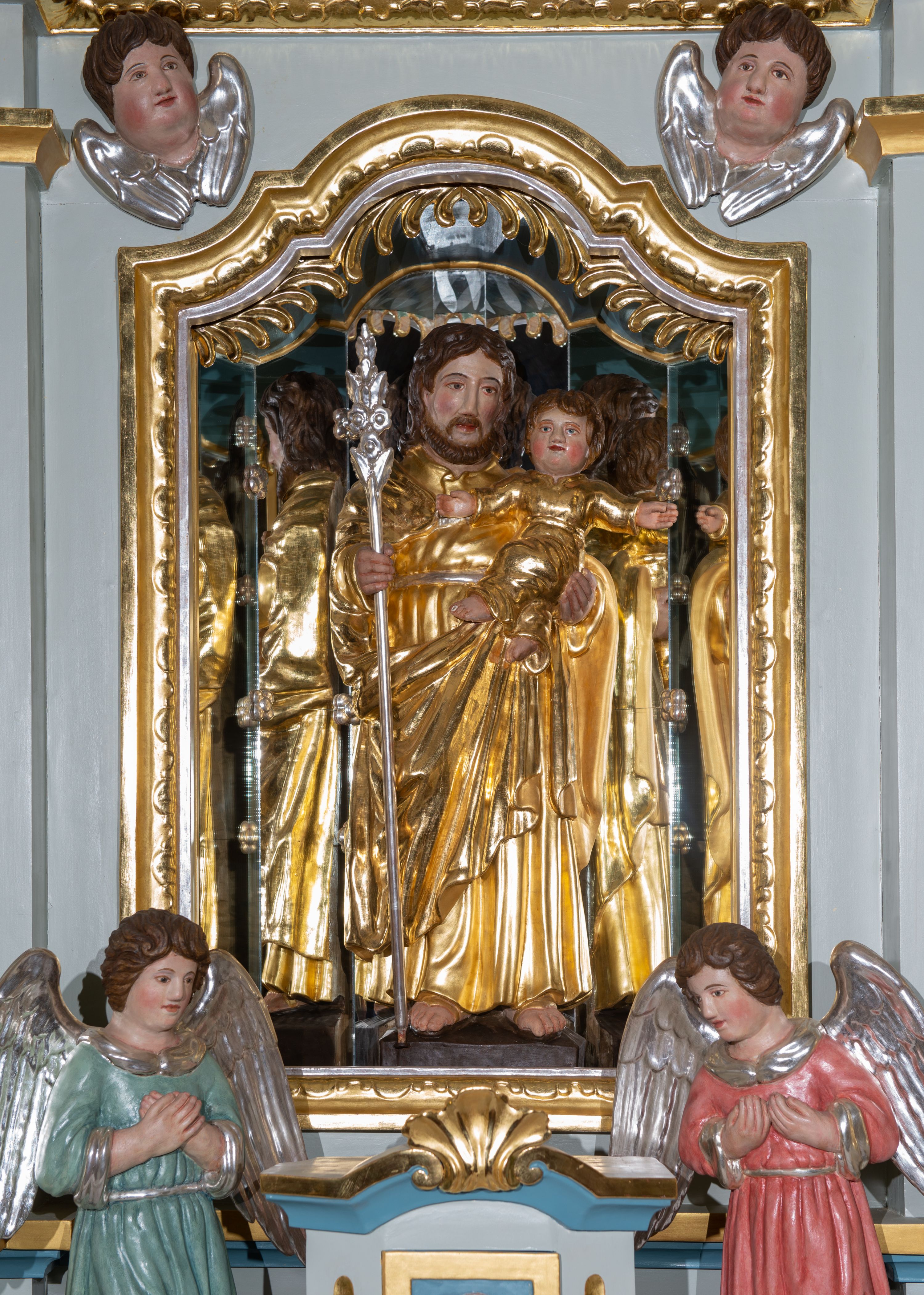 Rzeźba pełna, ustawiona na prostokątnym cokole. Święty Józef ukazany frontalnie, z Dzieciątkiem na lewym ręku, z różdżką Jessego w prawej ręce. Jest ubrany w długą suknię z długimi rękawami, przepasaną sznurkiem oraz długi płaszcz spięty pod szyją, z prawym końcem zarzuconym na lewe przedramię, na stopach sandały. Ma podłużną, okoloną brodą twarz z długim, wąskim nosem i małymi oczami. Włosy brązowe, średniej długości, opadają na plecy. Dzieciątko zostało ukazane frontalnie, z rozpostartymi szeroko rękami, z lewą nogą założoną na prawą. Jest ubrane w długą sukienkę z długimi rękawami, przepasaną w pasie sznurkiem. Ma okrągłą twarz, z rumieńcami na pełnych policzkach i małymi, czerwonymi ustami oraz krótkim, szerokim nosem; włosy krótkie, falowane. Polichromia w partiach ciała naturalistyczna, szaty złocone, atrybut srebrzony.