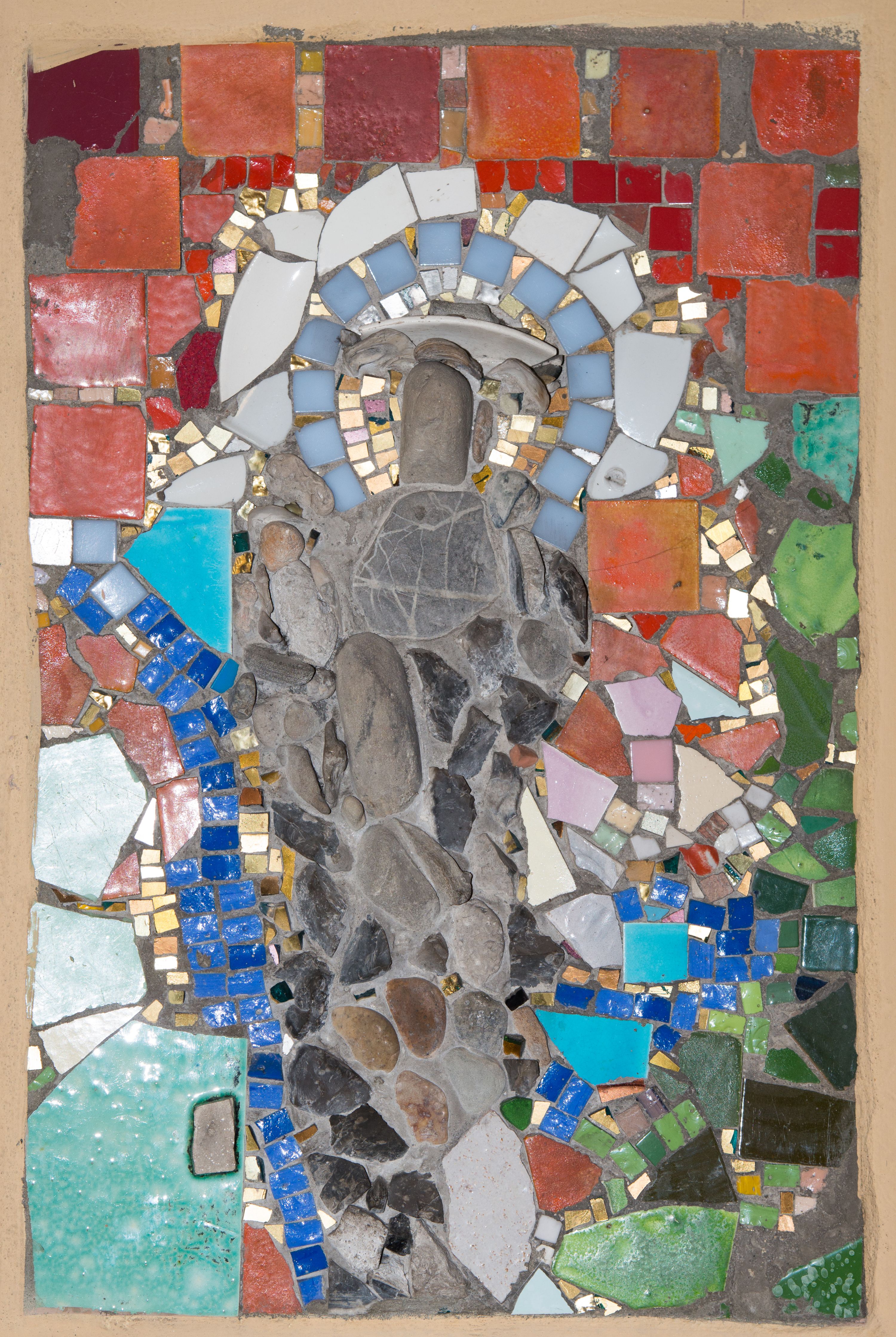 Mozaika autorstwa Ireny Weiss jest przykładem uproszczonej kompozycji o tematyce religijnej, w której temat ikonograficzny zarysowano jedynie szkicowo. Kolorystyka i ogólny zarys postaci, a także jej charakterystyczna poza wskazują, że mozaika przedstawia św. Józefa z Dzieciątkiem. Irena Weiss była początkowo uczennicą, potem żoną znanego malarza okresu Młodej Polski, profesora i rektora krakowskiej Akademii Sztuk Pięknych Wojciecha Weissa. Naukę malarstwa i rzeźby rozpoczęła w warszawskiej Szkole Sztuk Pięknych pod kierunkiem Konrada Krzyżanowskiego i Xawerego Dunikowskiego. Następnie kontynuowała edukację w Monachium i prywatnie u Wojciecha Weissa w Krakowie. W 1908 roku wyszła za Weissa. By jej prace nie były mylone z dziełami męża, przyjęła pseudonim artystyczny Aneri (będący anagramem imienia Irena). Aneri była autorką licznych pejzaży, martwych natur, portretów charakteryzujących się mocnymi, nasyconymi barwami. W późniejszym okresie twórczości wykonywała również mozaiki i witraże. Rodzina Weissów od około 1904 roku była związana z Kalwarią Zebrzydowską, gdzie Wojciech Weiss kupił dom dla swoich rodziców. Po ślubie z Ireną artysta dzielił swój czas pomiędzy Kraków a położony u podnóża klasztoru Bernardynów dom w Kalwarii. Kalwaryjskie pejzaże stały się częstym motywem w twórczości zarówno Wojciecha jak i Ireny Weiss. Prócz omawianej mozaiki przedstawiającej św. Józefa z Dzieciątkiem i wizerunku Matki Boskiej Niepokalanie Poczętej w kościele św. Józefa w Kalwarii Zebrzydowskiej, Aneri wykonała także mozaikę z wizerunkiem Matki Boskiej w kościele św. Michała Archanioła w pobliskich Zebrzydowicach.