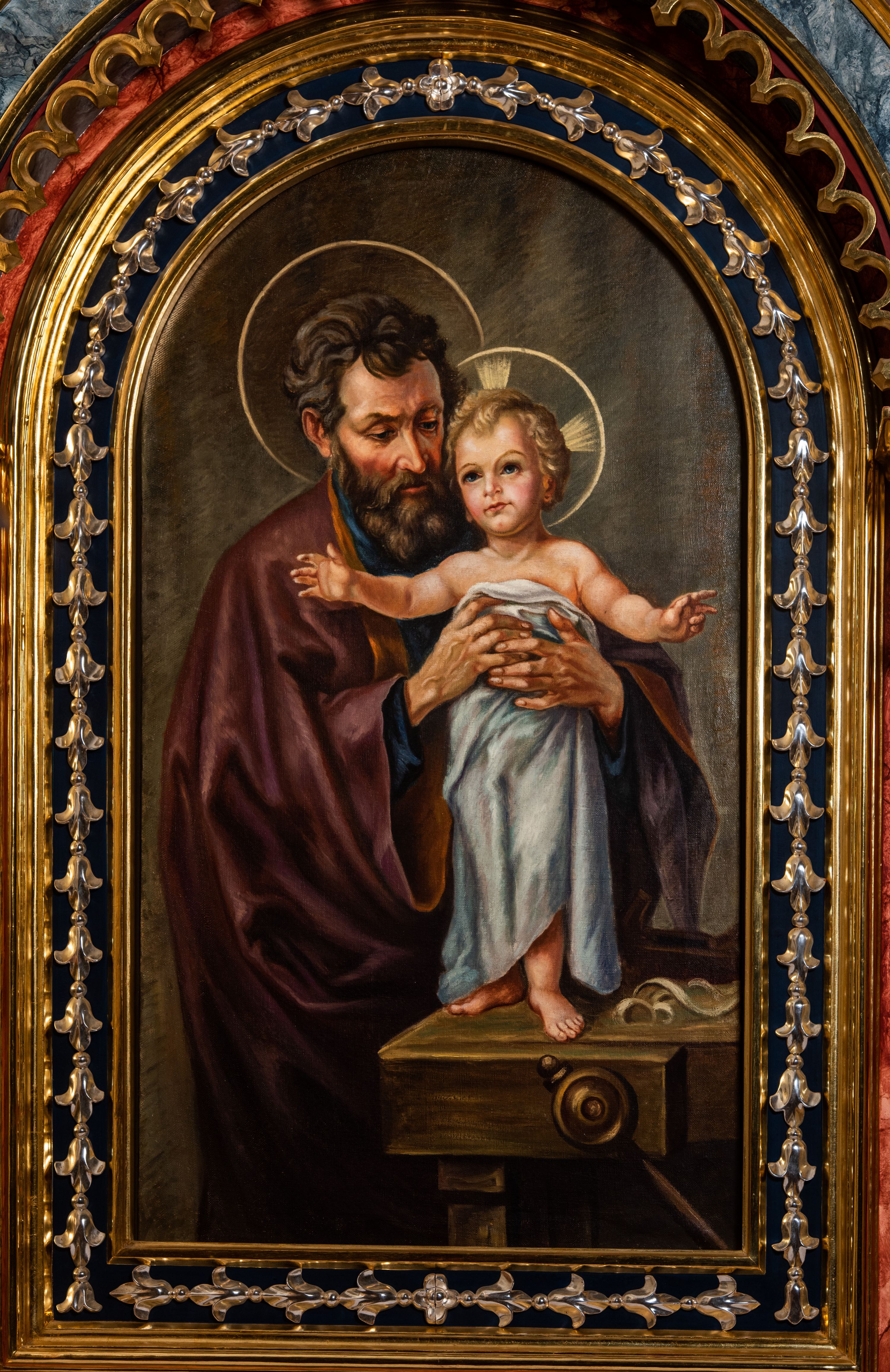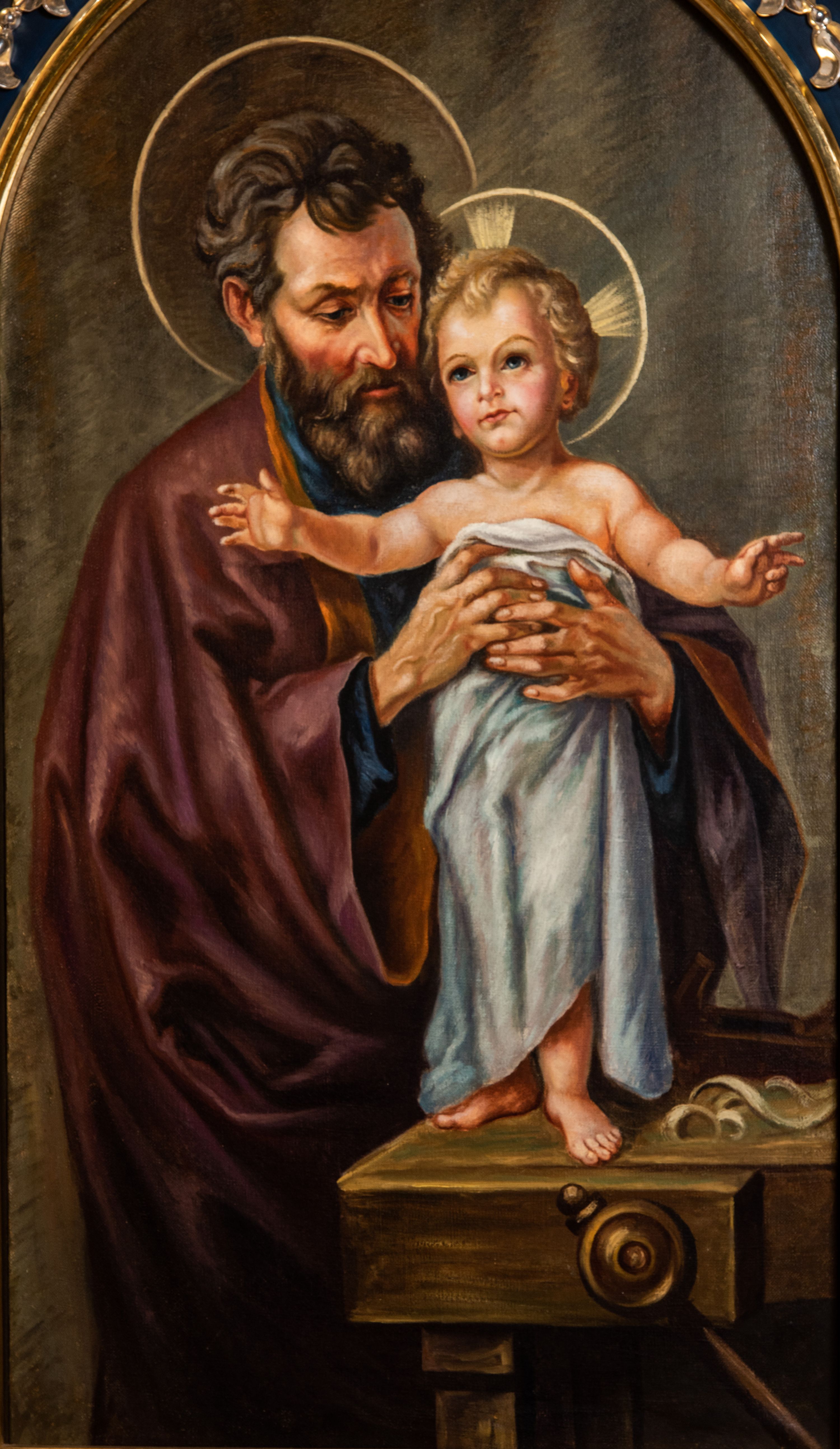 Obraz w części środkowej jednego z ołtarzy bocznych ukazuje wizerunek św. Józefa, oblubieńca Najświętszej Marii Panny (Mt 1, 16-19; Łk 1, 27) i ziemskiego opiekuna Jezusa (Łk 2, 4, 51-52). Józef był cieślą (Mt 13, 55), na co wskazują widoczne na obrazie elementy wyposażenia warsztatu (strugnica). Charakterystyczny dla XIX wieku rozwój kultu św. Józefa Robotnika przyczynił się do powstawania tego typu wizerunków świętego z narzędziami ciesielskimi bądź elementami wyposażenia warsztatu. W kontekście przedstawień ikonograficznych św. Józef ukazany jest w swej najpopularniejszej wersji – jako brodaty mężczyzna w sile wieku. Ów reprezentacyjny typ ikonograficzny przedstawień św. Józefa rozpowszechnił się w okresie nowożytnym, bazując na wizerunkach maryjnych, co miało podkreślić rolę świętego jako orędownika i pośrednika pomiędzy wiernymi a Zbawicielem. Trzymana zazwyczaj przez Józefa biała lilia symbolizuje zaprzeczenie biologicznego ojcostwa Jezusa, akcentując jego czystość. Wspomniany motyw, pominięty na obrazie, pojawia się jako ornament zdobiący ramę.