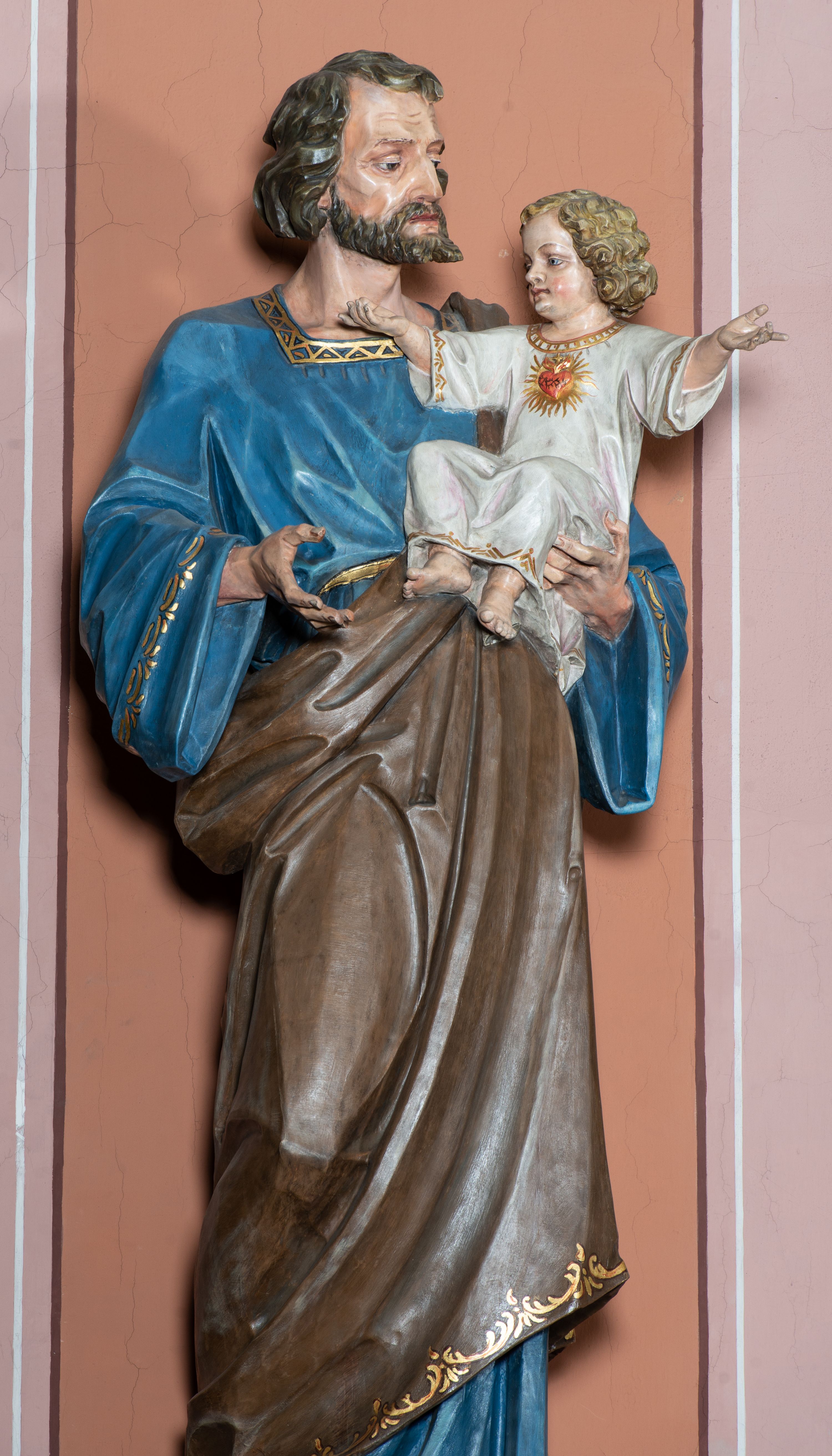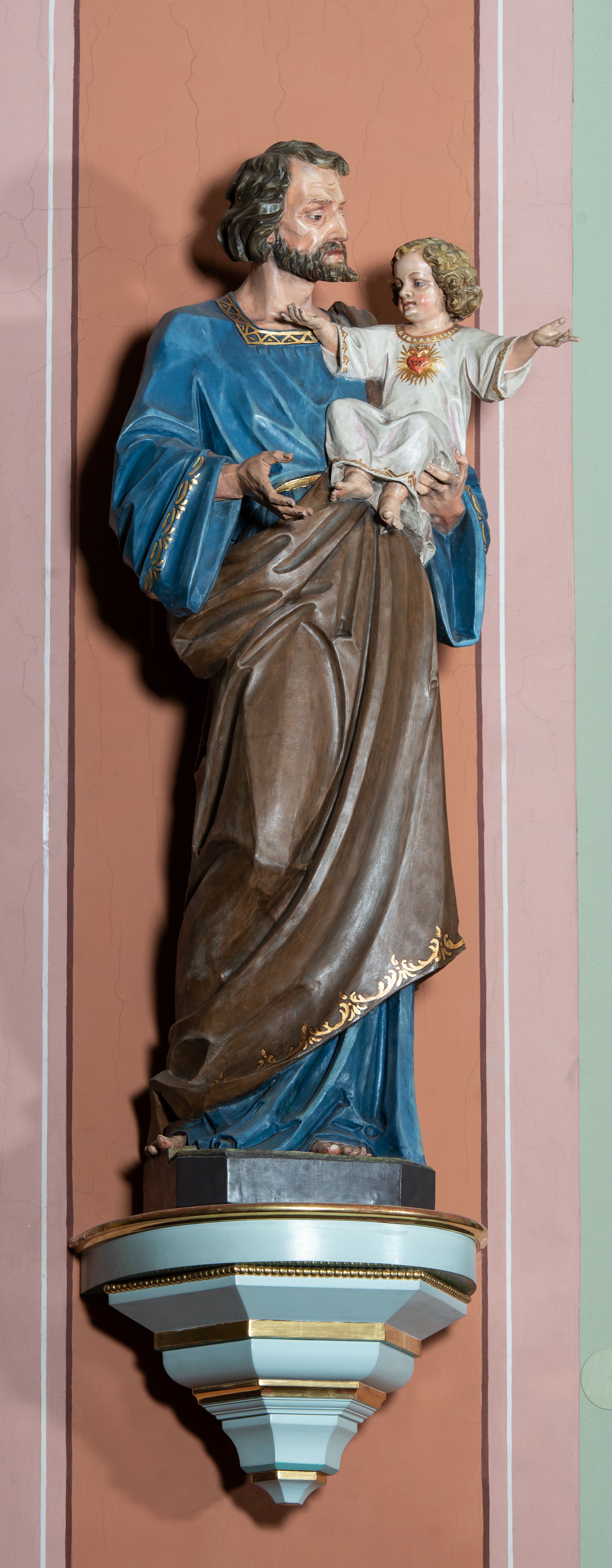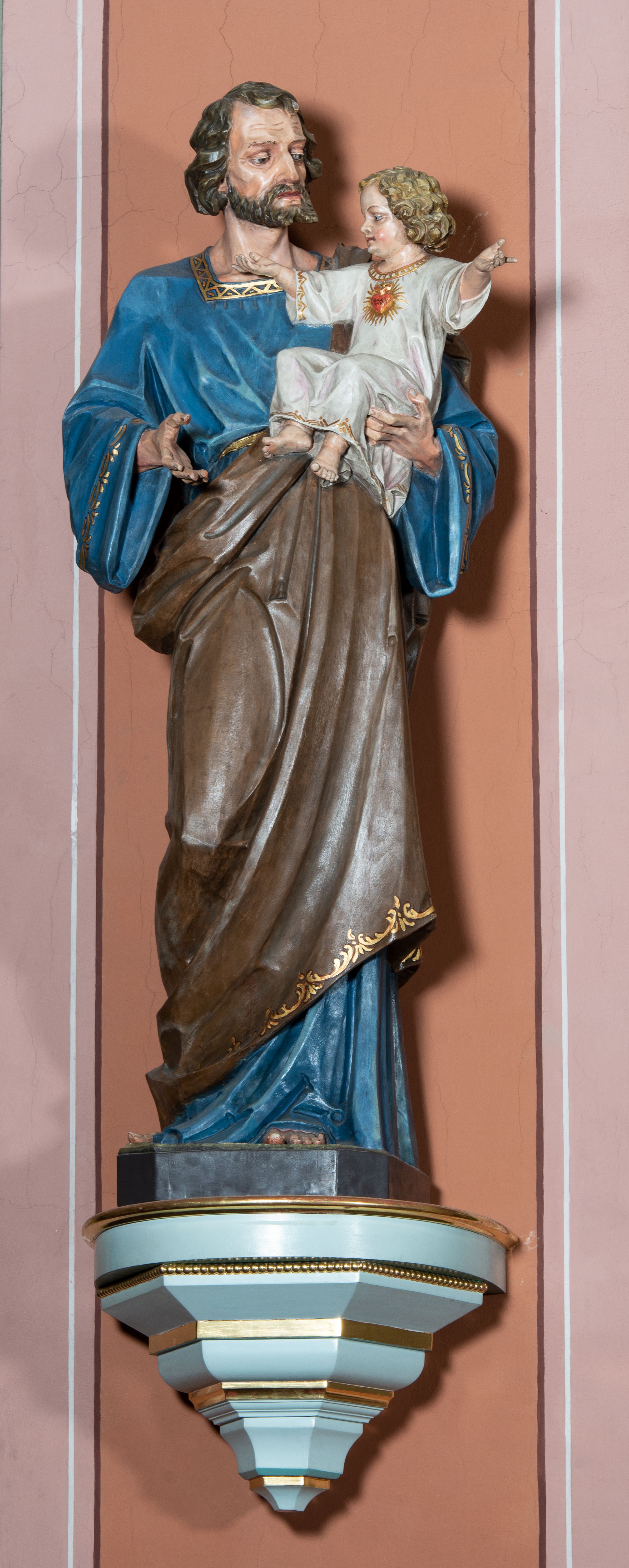 Pełnoplastyczna, rzeźba przedstawia w całej postaci ujętego w kontrapoście św. Józefa jako starszego mężczyznę stojącego na niskim czworobocznym postumencie o ściętych narożach. Józef na lewym przedramieniu trzyma Dzieciątko Jezus, wyciągając również przed siebie prawą rękę. Jego głowa ujęta została w trzech czwartych w prawo. Święty ma pociągłą twarz o ostrych rysach, jasnej karnacji, zapadłych policzkach z wydatnym nosem i ustami oraz spojrzeniem półprzymkniętych oczu skierowanych na Dzieciątko. Jego głowę otaczają ostro modelowane ciemne włosy i broda. Józef ubrany jest w niebieską tunikę lamowaną pod szyją i przy rękawach złotym ornamentem oraz w brązowy płaszcz przerzucony przez lewe ramię, którego prawa poła podwinięta jest na lewym boku. Mały Jezus został ukazany w trzech czwartych w lewo z rozłożonym obiema rękami i podkurczonymi nogami. Jego głowa widoczna z profilu skierowana jest w stronę św. Józefa. Jezus ma pociągłą twarz o jasnej karnacji i rumianych policzkach, wydatny nos i usta. Jego głowę otaczają krótkie, kędzierzawe jasne włosy. Ubrany jest w jasnoszarą tunikę lamowano pod szyją, na rękawach i na spodzie złotym obszyciem, która odsłania jego bose stopy. Na piersi Dzieciątka widoczne jest płonące Boskie Serce z koroną cierniową, otoczone złocistymi promieniami.