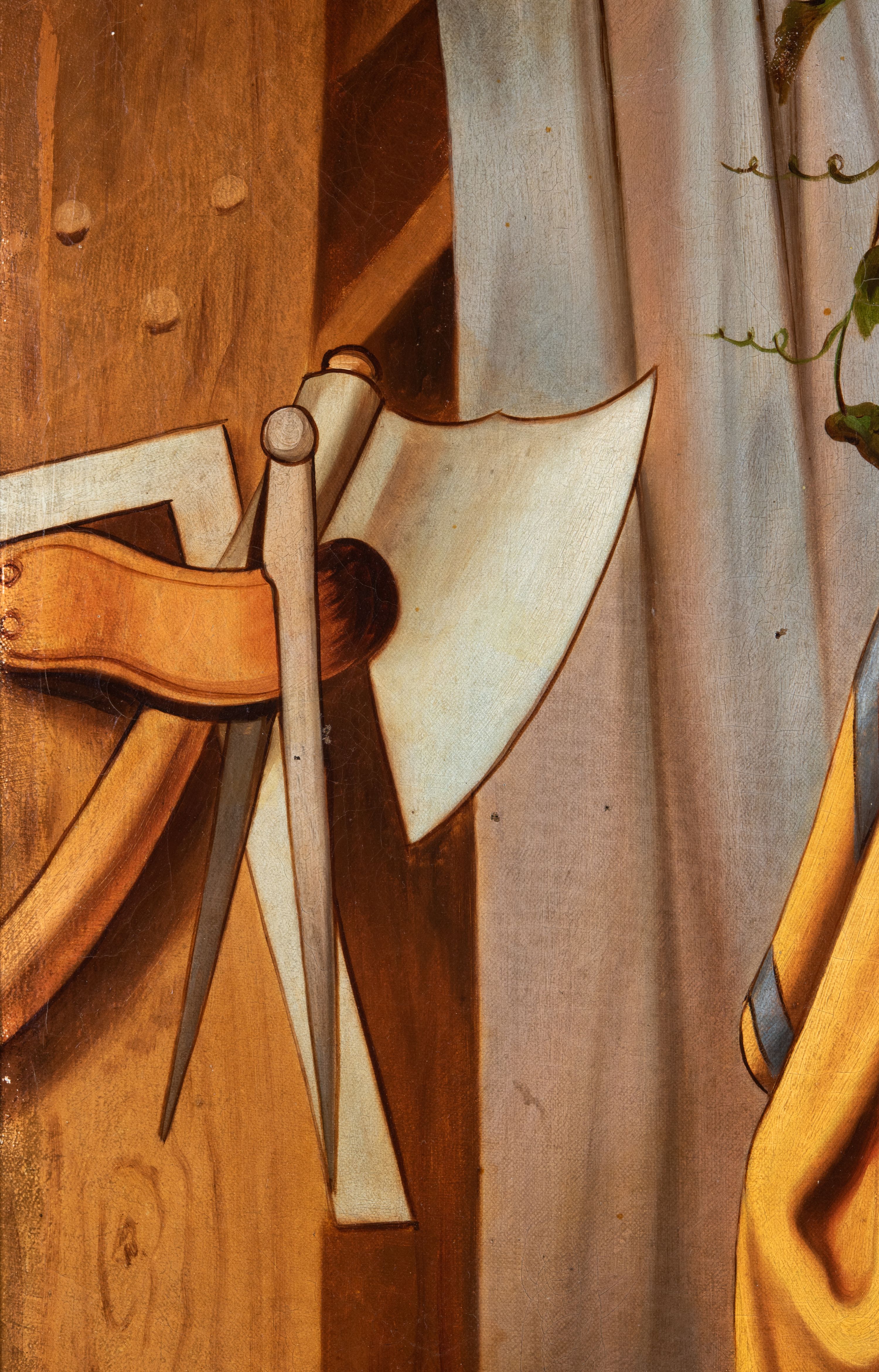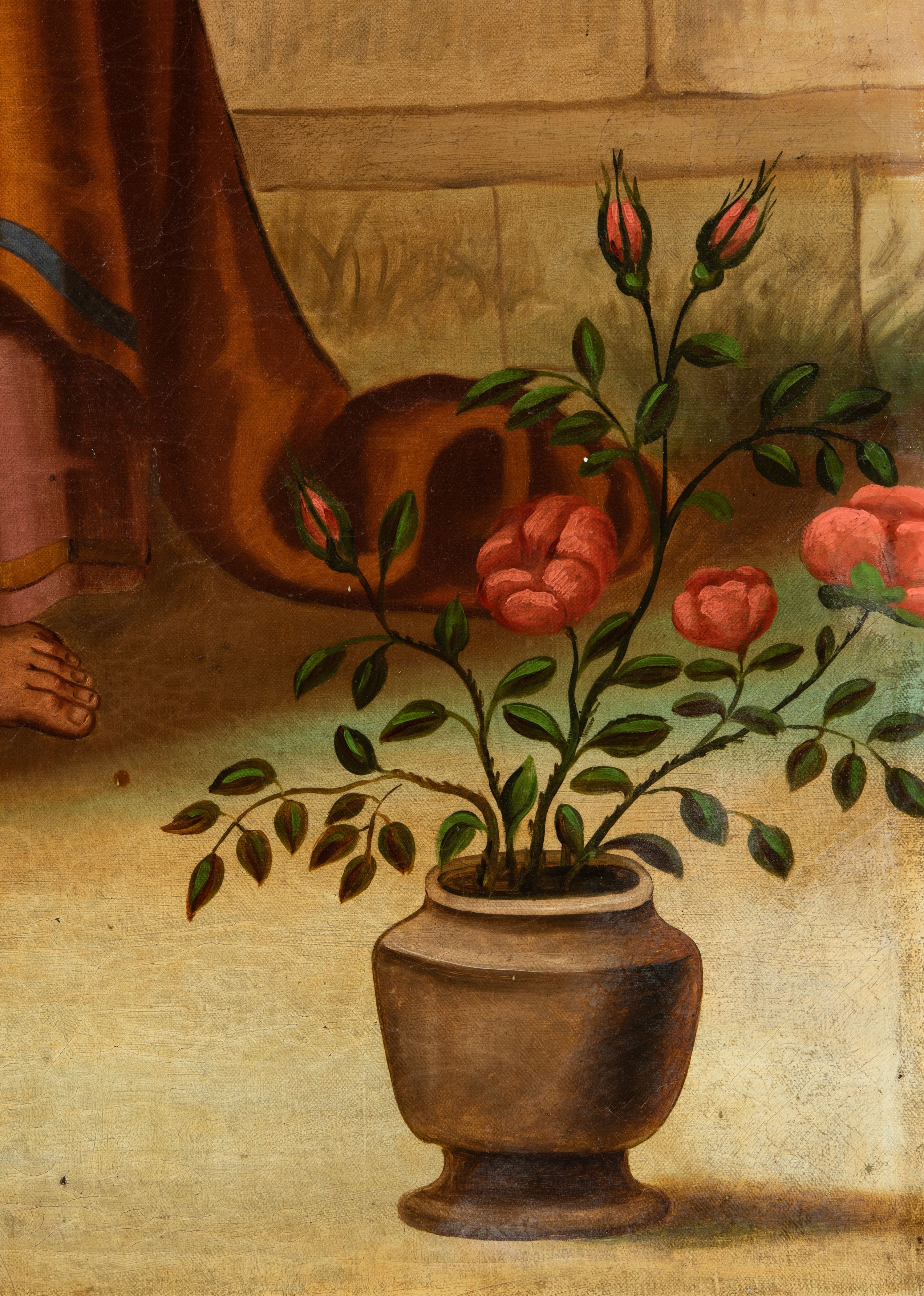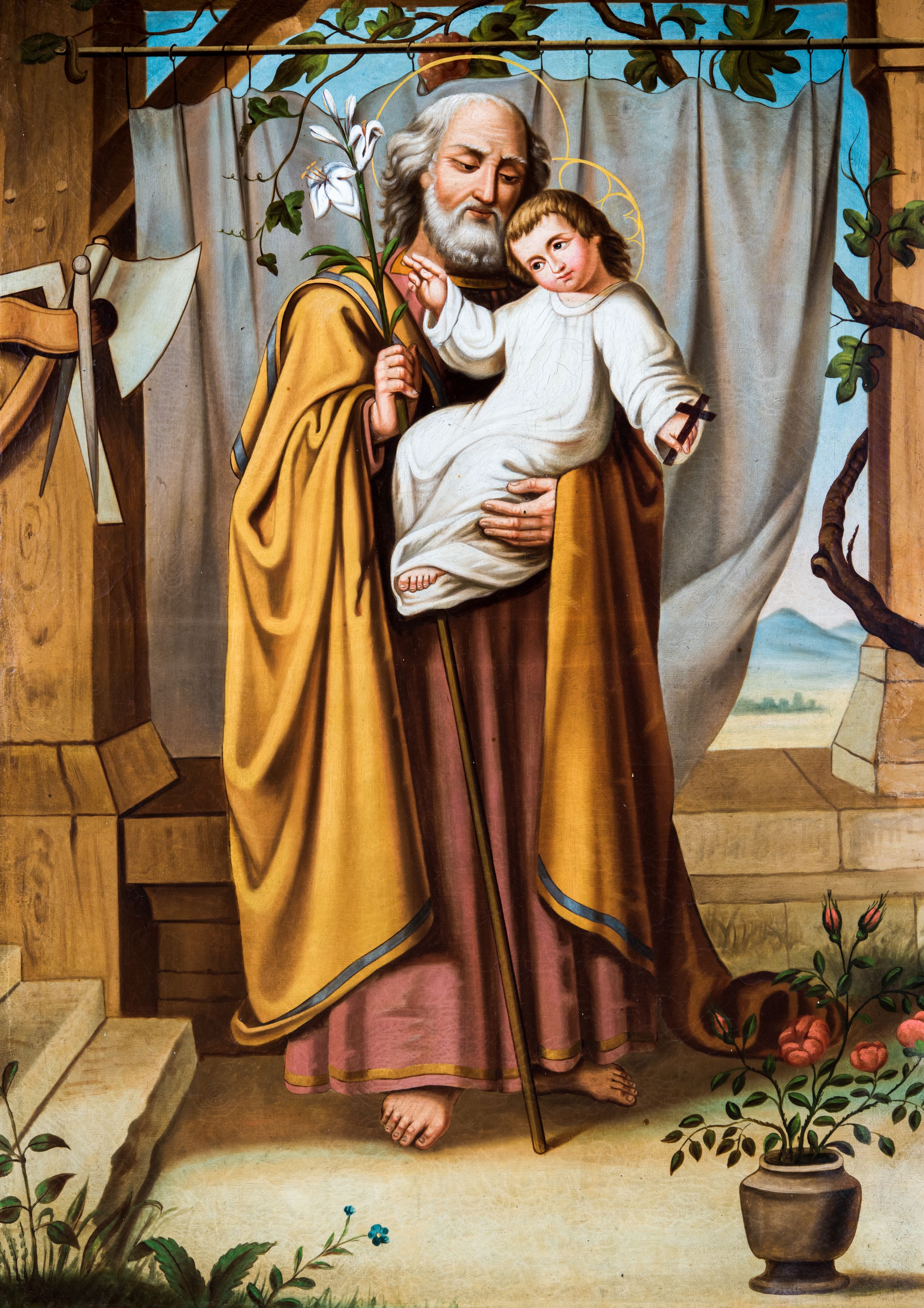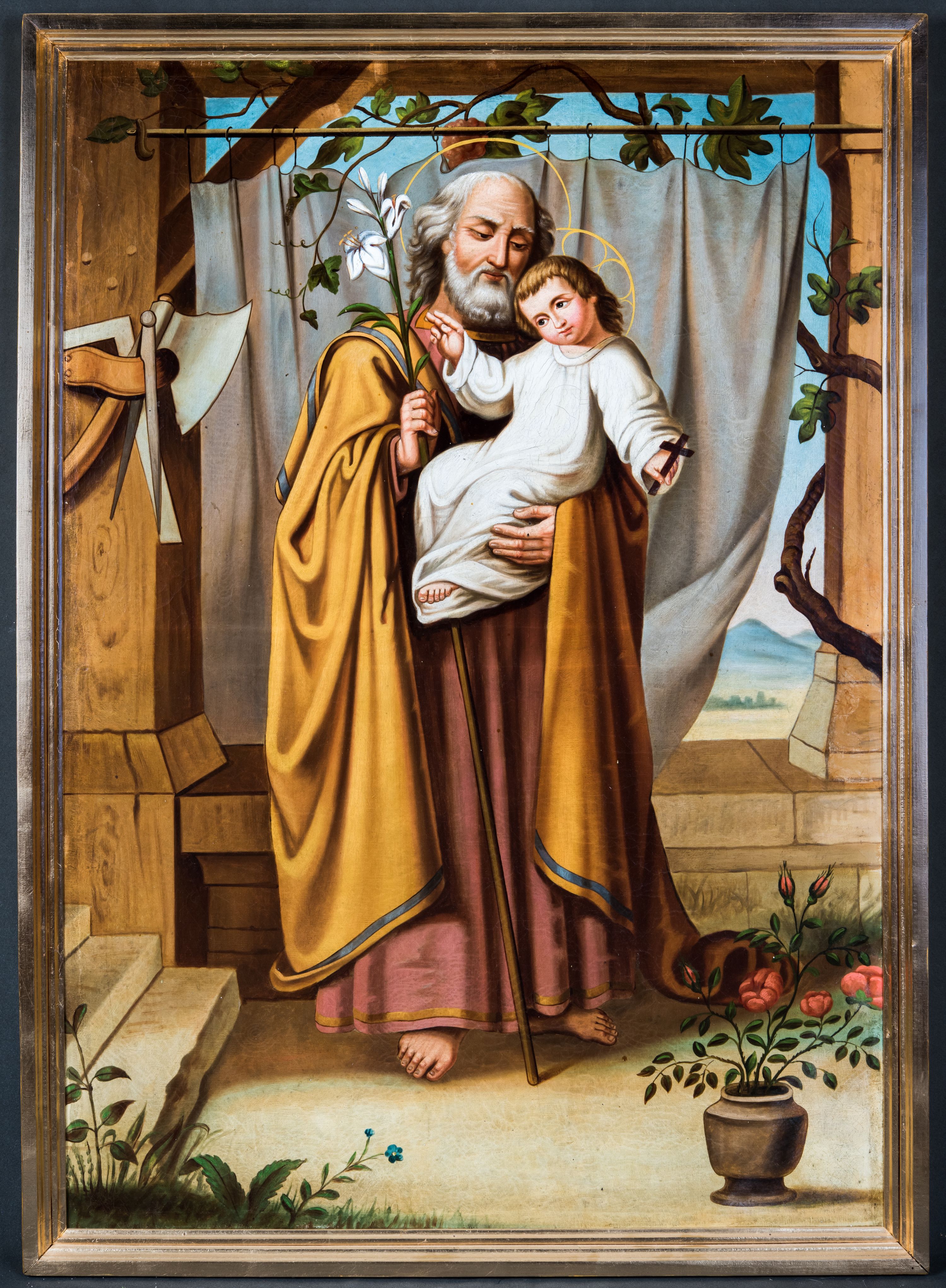 Obraz uzyskał formę stojącego prostokąta z całopostaciowym przedstawieniem św. Józefa z Dzieciątkiem. Józef zwrócony jest nieznacznie w trzech czwartych w lewo, z pochyloną głową. Święty lewą ręką podtrzymuje Dzieciątko, w prawej natomiast trzyma laskę zakończoną gałązką lilii. Twarz ma owalną, o starczych rysach, wysokim czole i migdałowatych oczach skierowanych w dół, długim nosie i pełnych ustach, okoloną siwą brodą oraz siwymi włosami sięgającymi ramion. Ubrany jest w długą ciemnoróżową tunikę oraz obficie drapowany, ciemnożółty płaszcz z zielonym pasem wzdłuż krawędzi zarzucony na ramiona. Wokół jego głowy widoczna jest złota aureola. Dzieciątko zwrócone zostało w trzech czwartych w prawo. Jezus z pochyloną głową i skrzyżowanymi stopami, prawą rękę unosi w geście błogosławieństwa, a w opuszczonej lewej dłoni trzyma krzyżyk. Zbawiciel ma okragłą twarz o dużych oczach, małym nosie i ustach, otoczoną jasnymi, krótkimi włosami. Jego głowę okala stylizowany nimb krzyżowy. Ubrany jest w białą obfitą tunikę. Postacie zostały ukazane w bliżej nieokreślonym wnętrzu otwierającym się na pejzaż zasadniczo przesłonięty kotarą zawieszoną na drążku, po którym pnie się winna latorośl. Po lewej stronie obrazu widoczne są zawieszone na filarze narzędzia ciesielskie (siekiera, kątownica, cyrkiel), a w prawym dolnym rogu wazon z różami.