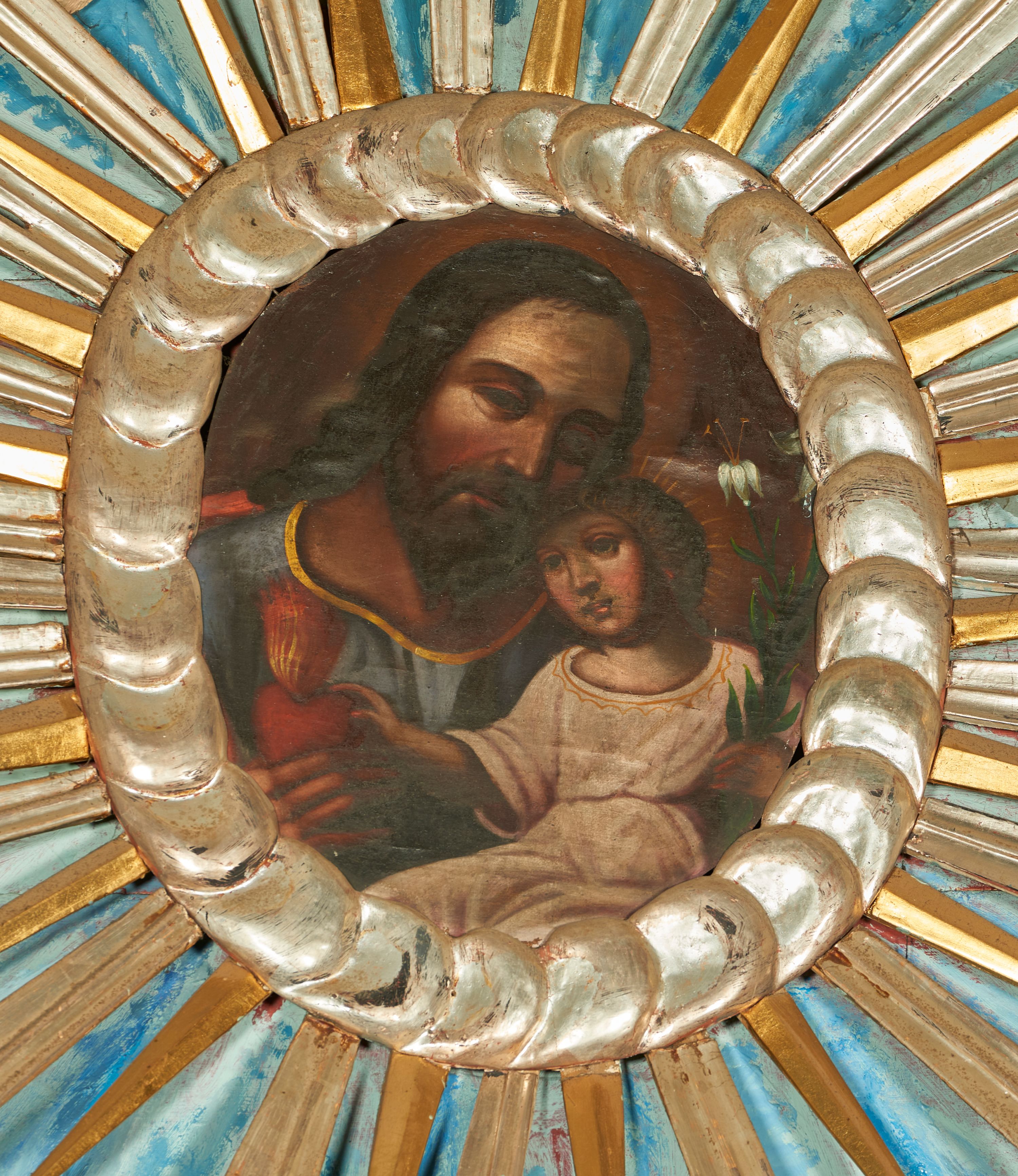 Święty Józef został ukazany jak podtrzymuje Dzieciątko Jezus, którego był opiekunem. Małżonek Marii chronił i utrzymywał Świętą Rodzinę, stał się symbolem wiary, pracowitości oraz skromności, patronem pracujących oraz rodzin. Obraz jest niewielki i umieszczony dość wysoko w odniesieniu do oglądających go osób, dlatego artysta wypełnił postaciami całą powierzchnię decydując się na bliskie ujęcie i ograniczając narrację. Dzieciatko trzyma lilię, symbol czystości, Józef serce, z którym przedstawia się dorosłego Chrystusa – symbol bożej miłości do ludzi. Postacie zostały ustawione na nieokreślonym, ponadczasowym tle.