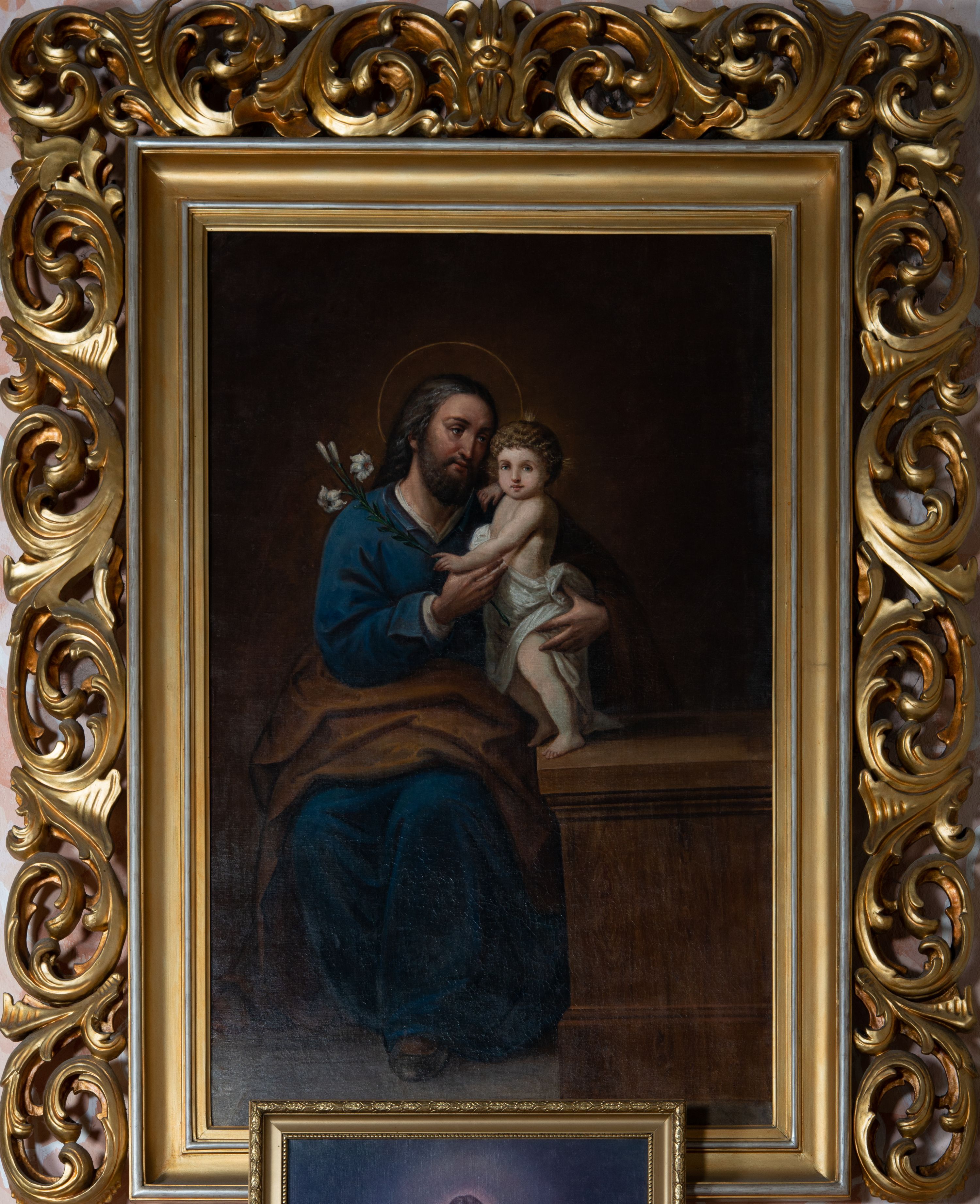 Przedstawienie św. Józefa nawiązuje do tradycyjnej ikonografii. Na obrazie został on ukazany, jak podtrzymuje Dzieciątko Jezus, którego był opiekunem. Józef, małżonek Marii, chronił i utrzymywał Świętą Rodzinę, stał się symbolem wiary, pracowitości oraz skromności, patronem pracujących oraz rodzin. Obraz o statycznej, centralnej kompozycji jest typowym przykładem dziewiętnastowiecznego malarstwa, w którym linearyzm przeważa nad malarskością, a postacie są przedstawione w strojach historyzujących lub ponadczasowych.