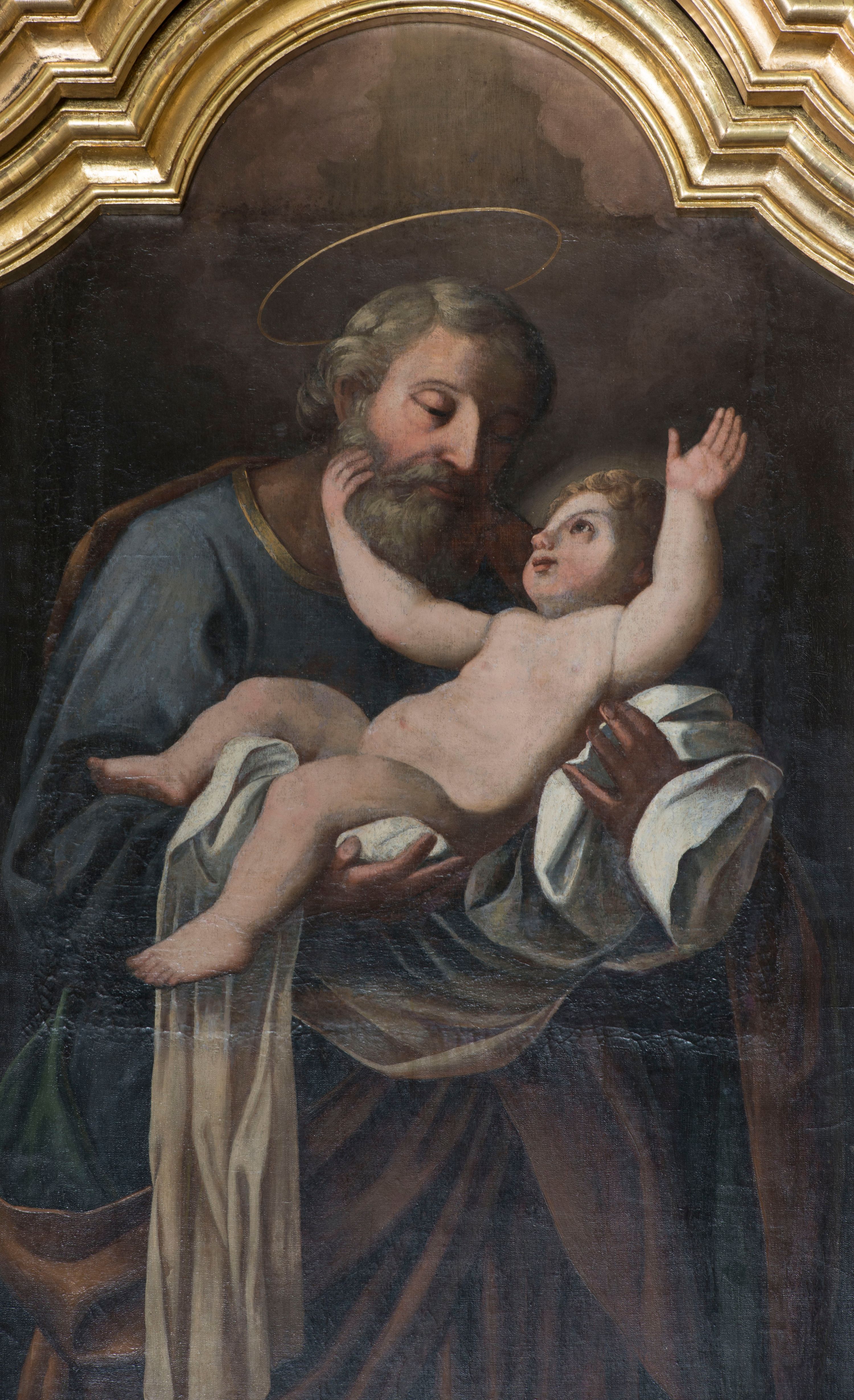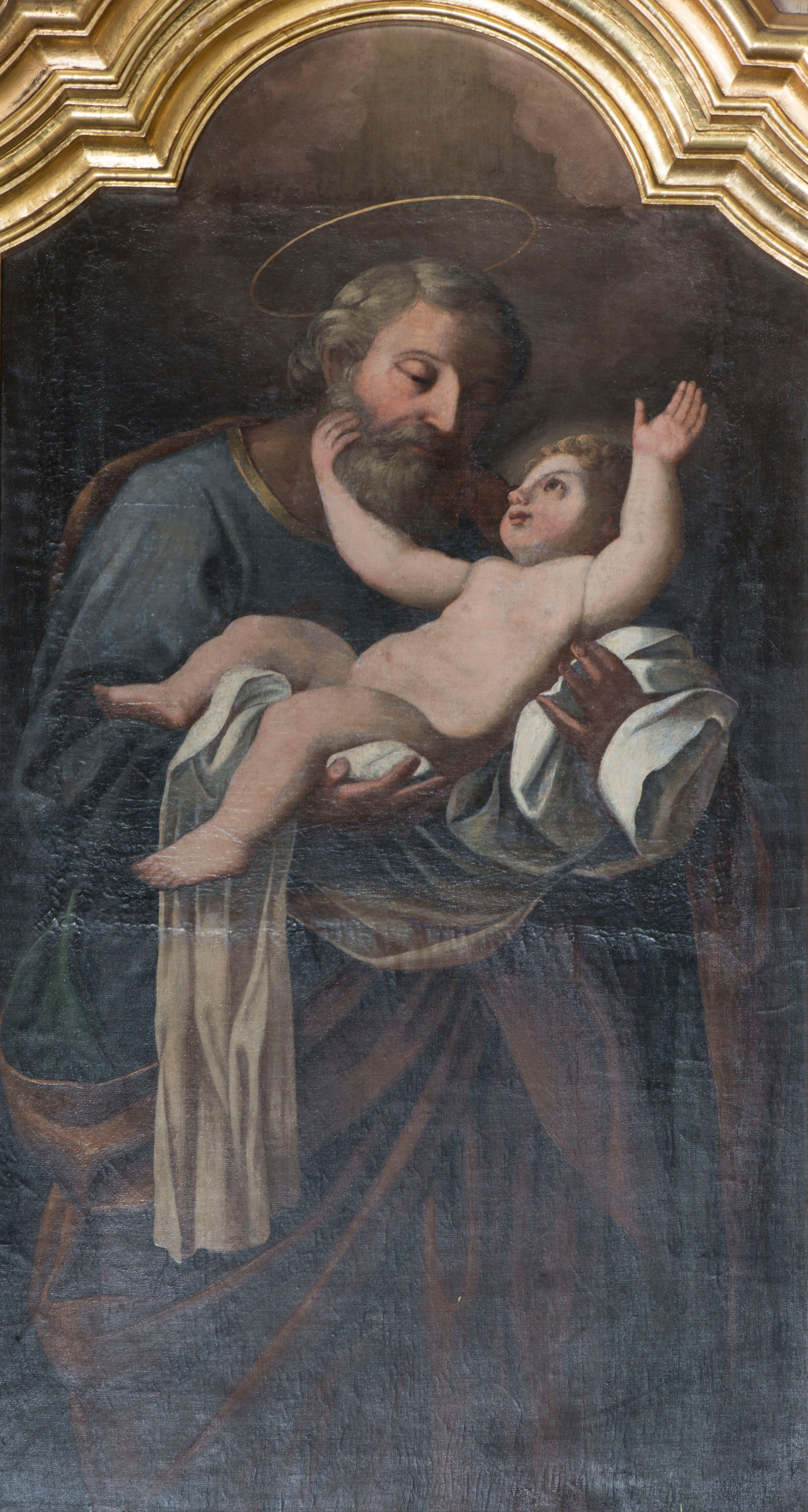 Obraz w kształcie stojącego prostokąta zwieńczonego łukiem nadwieszonym z uskokiem, w profilowanym obramieniu. Niemal całe pole obrazowe wypełnia postać św. Józefa z Dzieciątkiem. Józef został przedstawiony w ujęciu do kolan, zwrócony w lewo, z głową przechyloną lekko na bok w stronę Dzieciątka, ukazaną w głębokim światłocieniu, okoloną siwą brodą i skręconymi w pukle siwymi włosami. Nad głową złoty nimb. Jest ubrany w niebieską suknię lamowaną pod szyją złotem i brunatny, podbity zielenią, drapowany płaszcz, który przechodzi przez jego lewy bark i otacza prawe biodro. Oburącz podtrzymuje na jasnych tkaninach nagie, jaśniejące blaskiem Dzieciątko. Twarz małego Jezusa jest otoczona złotymi puklami. Dzieciątko prawą rączką dotyka brody Józefa, a lewą wznosi ku górze. Tło ciemnobrunatne, nieznacznie rozjaśnione w górnej części, frontalne światło łagodnie wydobywa z mroku postać Józefa i oświetla Dzieciątko.