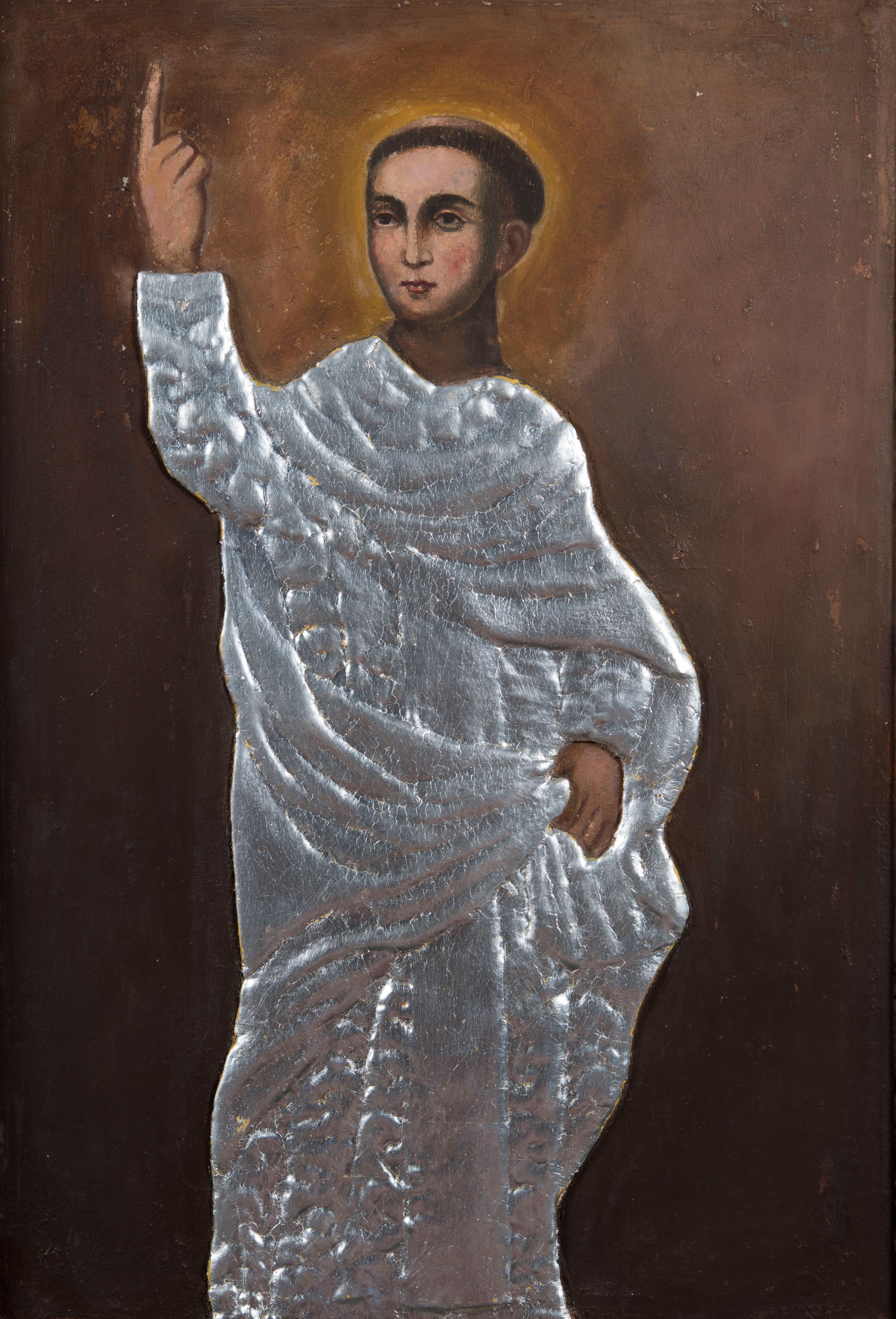 Na rewersie feretronu znajduje się wizerunek nierozpoznanego świętego ukazanego niemal w całej postaci. Zwróconego w trzech czwartych w prawo mężczyznę charakteryzuje młodzieńcza fizjonomia owalnej, pozbawionej zarostu twarzy o wyrazistych, sumarycznie opracowanych rysach i mocnym, światłocieniowym modelunku. Włosy przystrzyżone są w formie tonsury. Święty prawą rękę z wyprostowanym palcem wskazującym podnosi wysoko do góry, lewą podtrzymuje połę płaszcza. Sylwetkę osłania płaskorzeźbiona, srebrzona sukienka o układzie naśladującym malarskie drapowanie. Tło obrazu jest jednolite, ciemnobrązowe.
