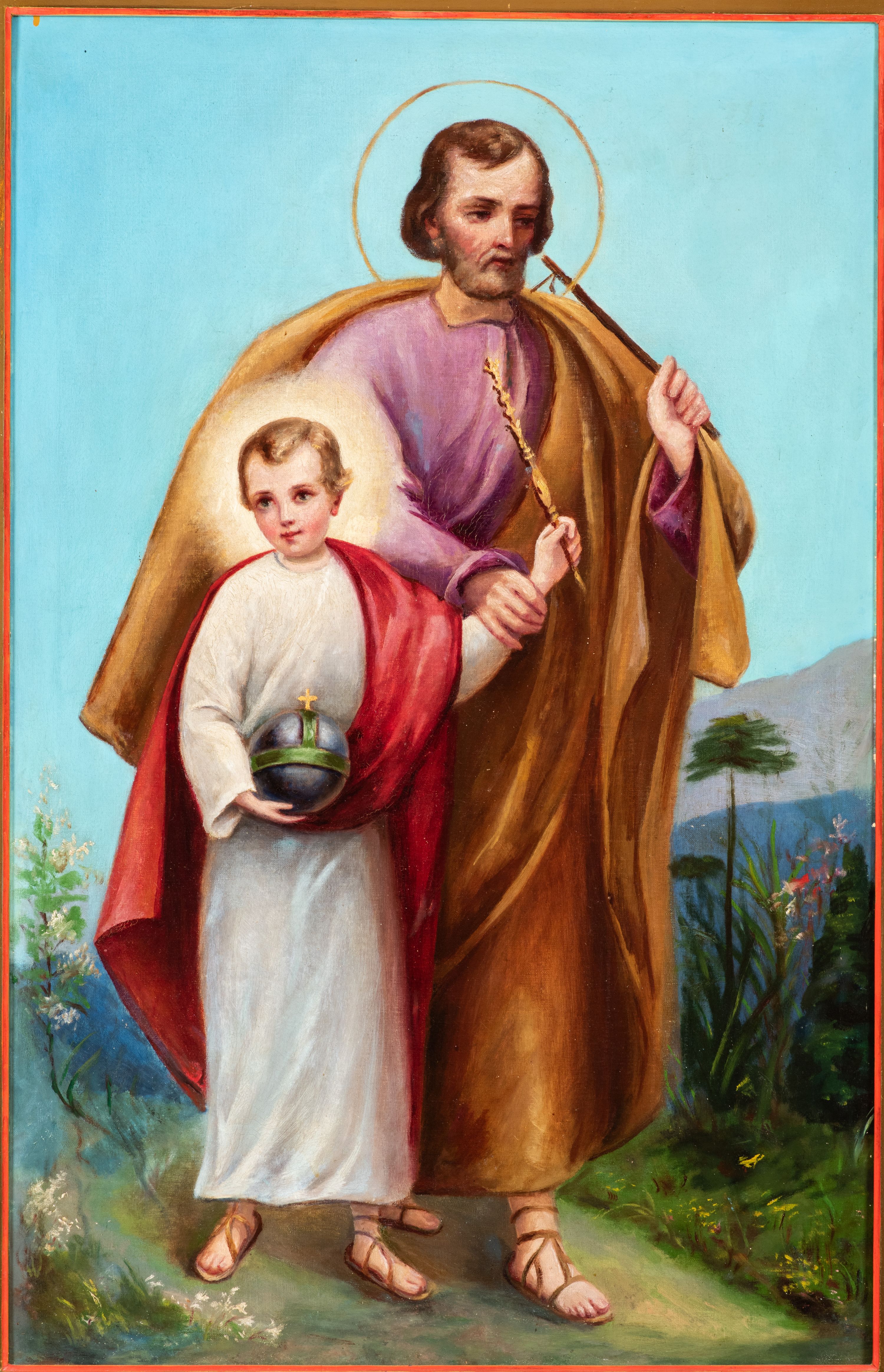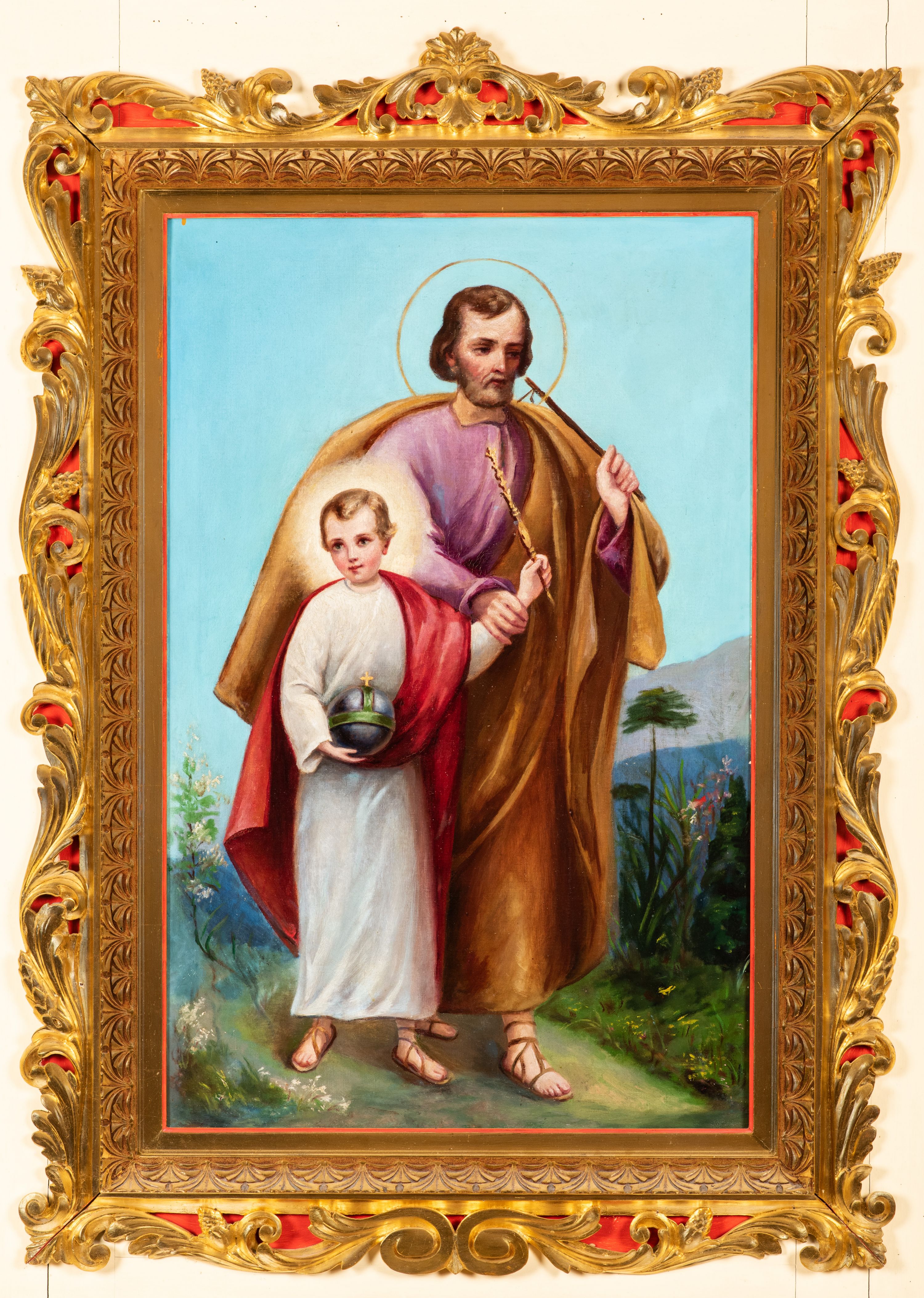 Obraz w kształcie stojącego prostokąta, ujęty drewnianą, złoconą ramą dekorowaną liśćmi akantu oraz stylizowanymi palmetami. W centralnej części kompozycji, na tle pejzażu przedstawiono św. Józefa wraz z kilkuletnim Jezusem. Święty Józef został ukazany w ujęciu całopostaciowym, z ciałem skierowanym w lewą stronę, w pozycji kroczącej. Twarz szczupła, z dużymi, ciemnymi oczami oraz prostym nosem. Włosy i zarost jasnobrązowe. Wokół głowy świętego przedstawiony nimb. Józef w lewej dłoni trzyma laskę, prawą chwyta za nadgarstek Jezusa. Postać ubrana jest w długą, jasnofioletową szatę oraz obszerny, brązowy płaszcz i sandały. Jezus został ukazany frontalnie, w ujęciu całopostaciowym z głową lekko skierowaną w prawą stronę. Twarz chłopca jest owalna, o jasnej karnacji z wyraźnie zaznaczonym rumieńcem na policzkach. Oczy duże, skierowane w kierunku widza. Włosy jasne, układające się w lekkie fale. Wokół głowy świetlisty nimb. Jezus w prawej dłoni podtrzymuje jabłko królewskie, a w lewej złote berło. Postać ubrana jest w długą, białą tunikę oraz czerwony płaszcz i sandały. W tle ukazany pogodny, wiosenny pejzaż z ukwieconą łąką i widocznymi w oddali wzgórzami. Kolorystyka obrazu jest jasna, pastelowa.