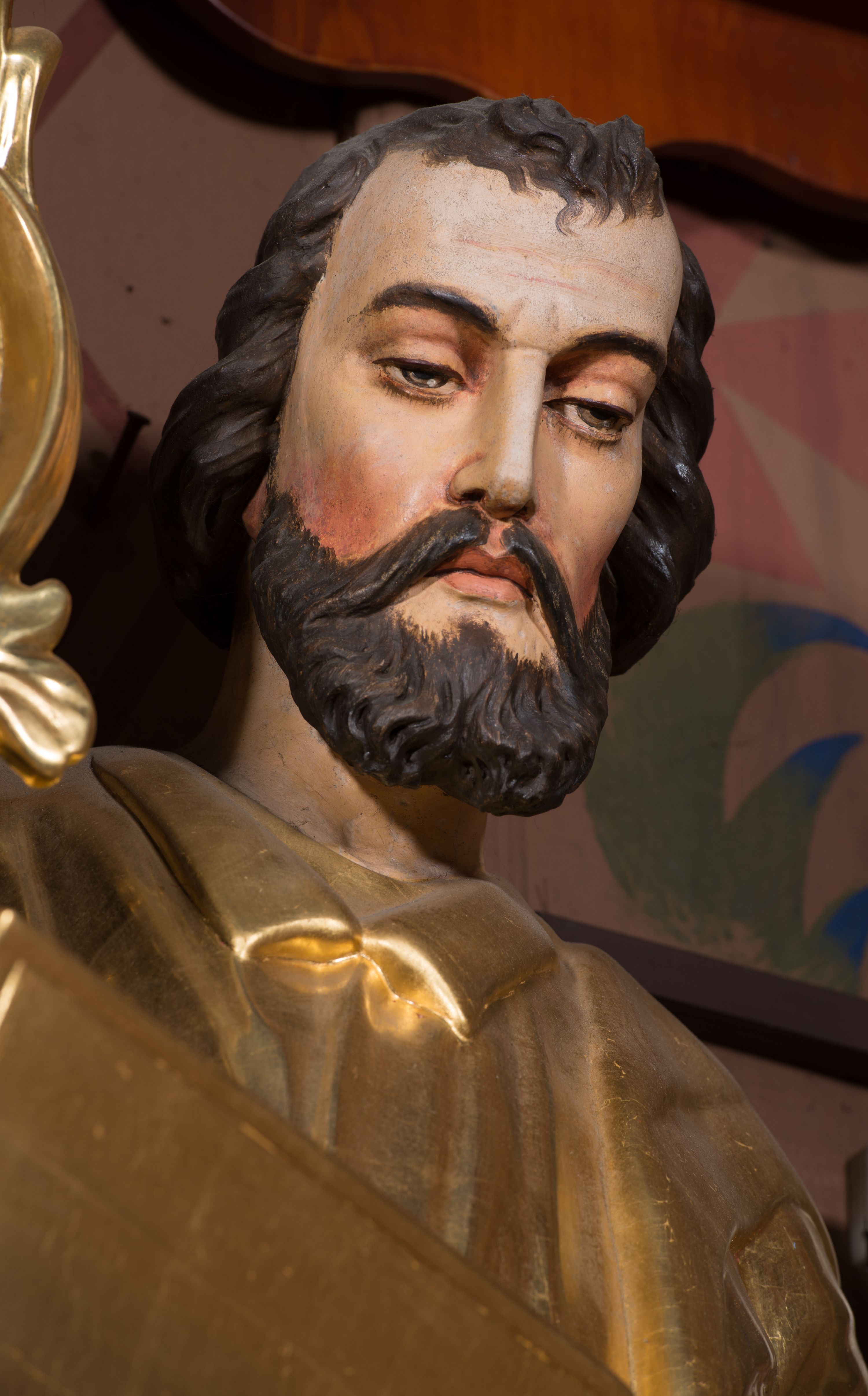 Figura pełnoplastyczna, ustawiona na nieregularnej podstawie. Święty ukazany frontalnie, z lekko pochyloną głową. W prawej, ugiętej ręce trzyma zamkniętą księgę, w lewej pałkę. Twarz ma pociągłą, o dojrzałych rysach, zmarszczonym czole, półprzymkniętych oczach, prostym nosie i pełnych ustach, okoloną krótką, falistą brodą i włosami. Ubrany jest w złoconą tunikę z kołnierzykiem, przepasaną w talii, przylegającą do ciała, silnie drapowaną oraz płaszcz zarzucony na prawe ramię postaci i opadający po bokach. Polichromia ciała naturalistyczna, włosy brązowe.