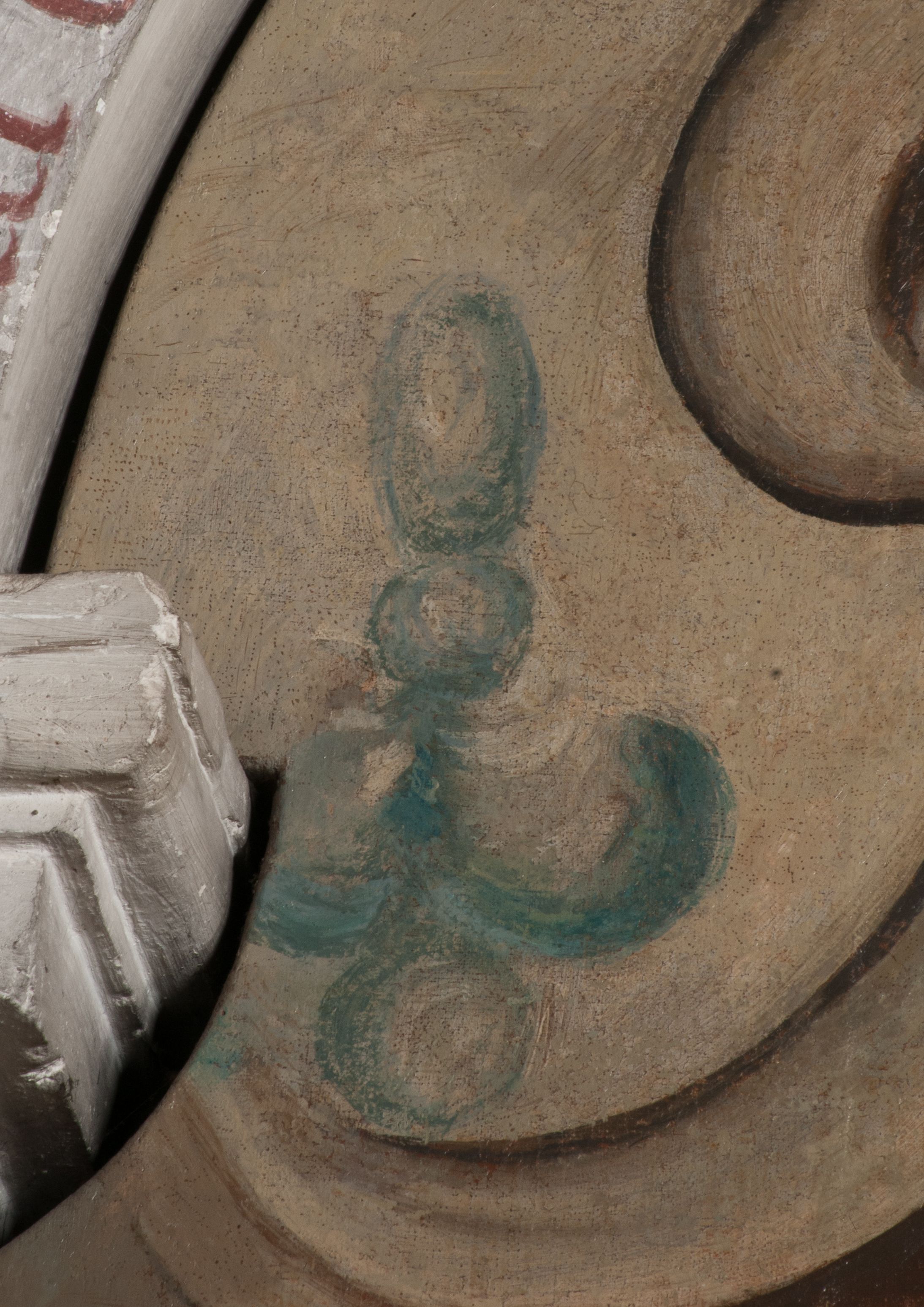 Ponad obrazem na archiwolcie arkady znajduje się czerwony łaciński napis: „Qui aurum diligit, non iustisificabitur Eccles[iastes] Cap[ut] 31 vers[us] 5”. Natomiast na dolnej krawędzi wnęki napis polski, także wykonany rubrą: „Złoto ubogim Karol ze szkatuły daye / znać ze złotem do nieba nikt się nie dostaye”.