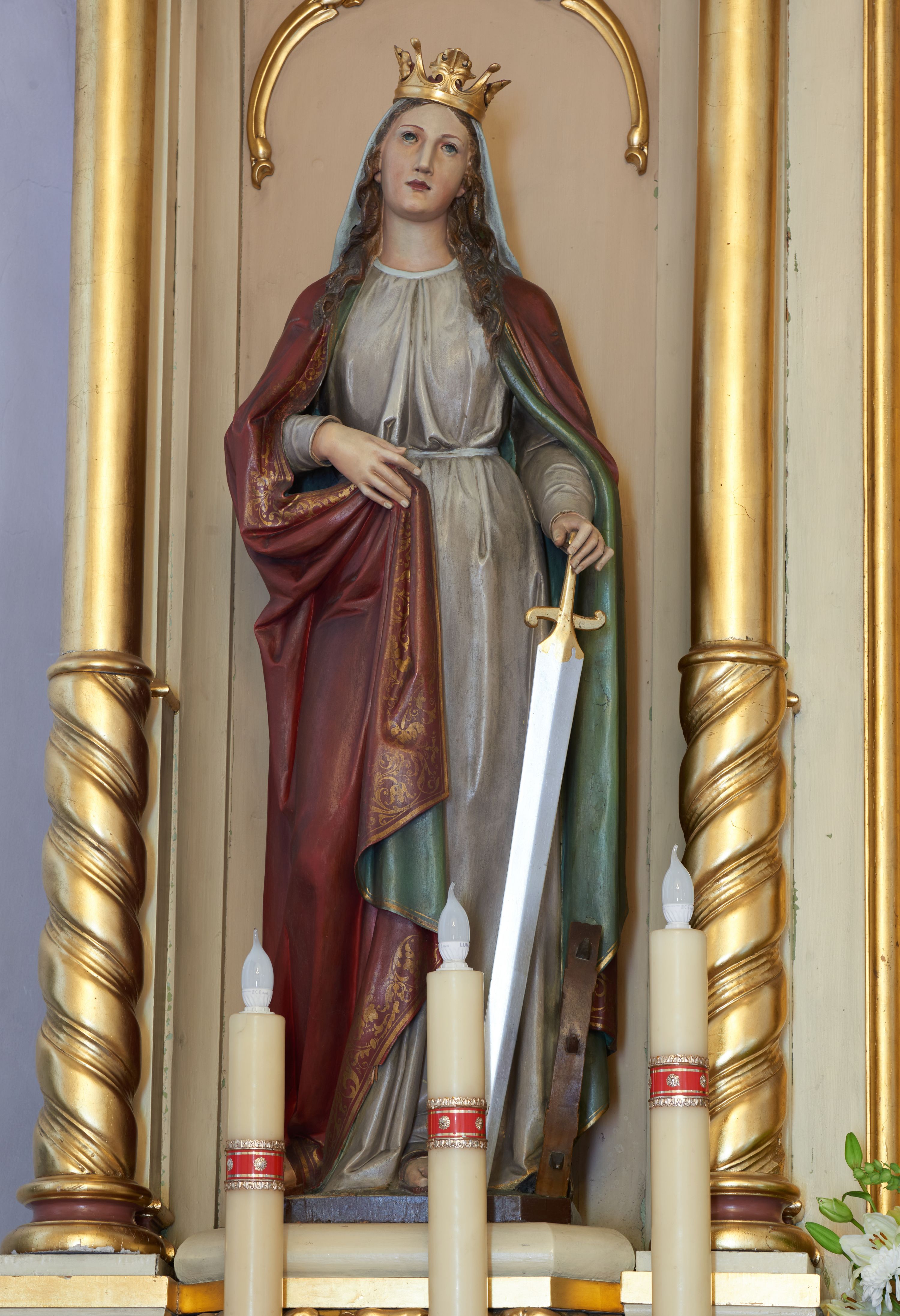 Rzeźba św. Katarzyny Aleksandryjskiej, pełnoplastyczna, ustawiona na niskiej, prostopadłościennej podstawie o ściętych narożach. Święta ustawiona jest frontalnie, w delikatnym kontrapoście, z głową przechyloną w stronę lewego ramienia. W lewej dłoni trzyma miecz zwrócony ostrzem do dołu, a prawą ugiętą w łokciu przytrzymuje brzeg płaszcza. Twarz owalna o wydatnym podbródku, długi nos, duże oczy, rysy delikatnie rzeźbione. Włosy ciemnobrązowe, długie, falowane, opadające na plecy i ramiona. Święta ubrana jest w szarą suknię z długimi rękawami, przewiązaną w talii i bordowy płaszcz z zieloną podszewką. Płaszcz zdobiony jest na brzegu szeroką bordiurą w formie stylizowanej wici roślinnej. Na głowie święta ma założony jasnoszary welon oraz złotą, otwartą koronę, a na stopach ciemnobrązowe sandały. W podstawie, po lewej stronie świętej zatknięte jest koło. Polichromia naturalistyczna w odsłoniętych partiach ciała.
