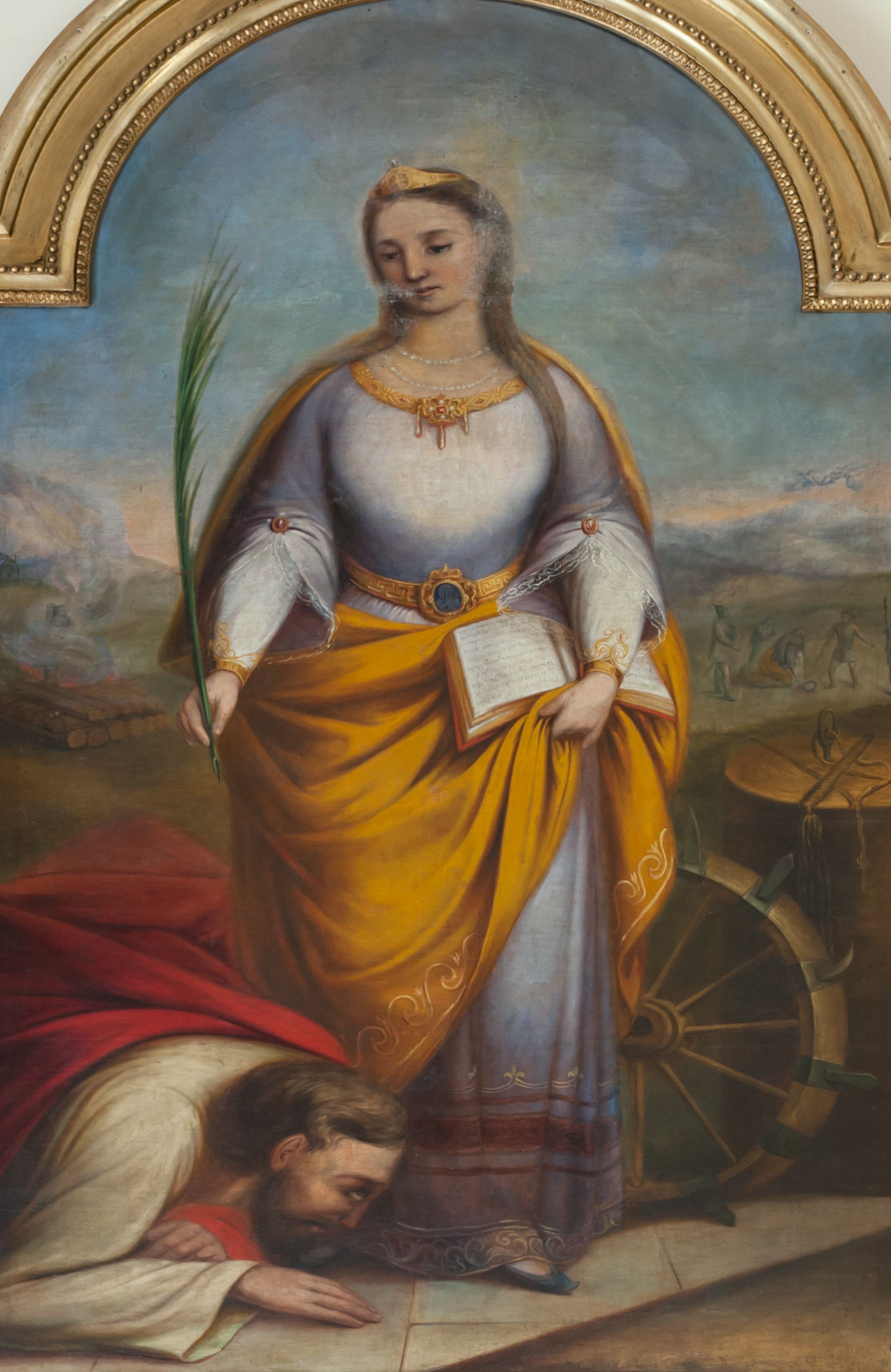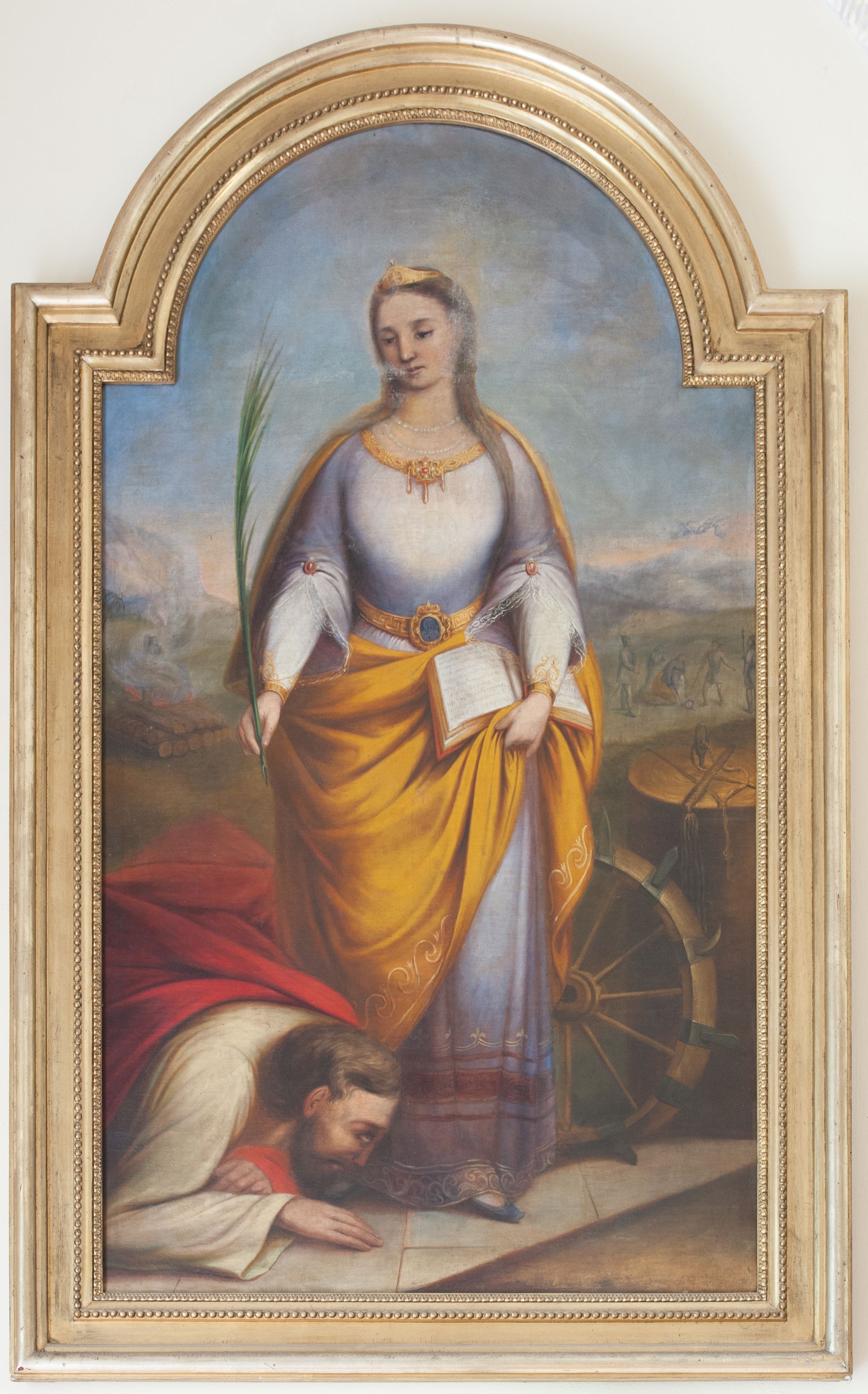 Obraz w kształcie stojącego prostokąta, zamknięty łukiem nadwieszonym. Pośrodku kompozycji na tle rozległego pejzażu z błękitnym niebem przedstawiona św. Katarzyna Aleksandryjska w pozycji stojącej, z palmą męczeństwa w prawej dłoni i otwartą księgą w lewej. Twarz o idealizowanych rysach, młodzieńcza z długim nosem, małymi ustami i oczami skierowanymi w dół; długie włosy spadają na plecy i lewe ramię. Święta jest ubrana w szatę spodnią z białymi, długimi rękawami, w długą suknię wierzchnią z rękawami podpiętymi do łokci broszkami, zdobionymi angażantami (mankietami z koronką), przewiązaną w talii złoconym pasem z klamrą ozdobioną niebieskim kamieniem, obwiedzioną na brzegach dekoracyjnymi lamówkami. Na plecy ma założony żółty płaszcz. Jej włosy ozdabia złota opaska z białym klejnotem, a szyję sznury pereł, na stopach ma niebieski buty. Po lewej stronie znajduje się mężczyzna oddający jej niski pokłon, widoczny w półpostaci, ubrany w białą suknię i czerwony płaszcz. Po prawej stronie przedstawiono koło tortur oraz kolumnę biczowania z biczem i sznurami. W oddali widoczne miniaturowe sceny ukazujące męczeństwo: palenie na stosie (po lewej) i ścięcie mieczem (po prawej). W tle pejzaż górski, powyżej błękitne niebo. Rama drewniana, profilowana i złocona.
