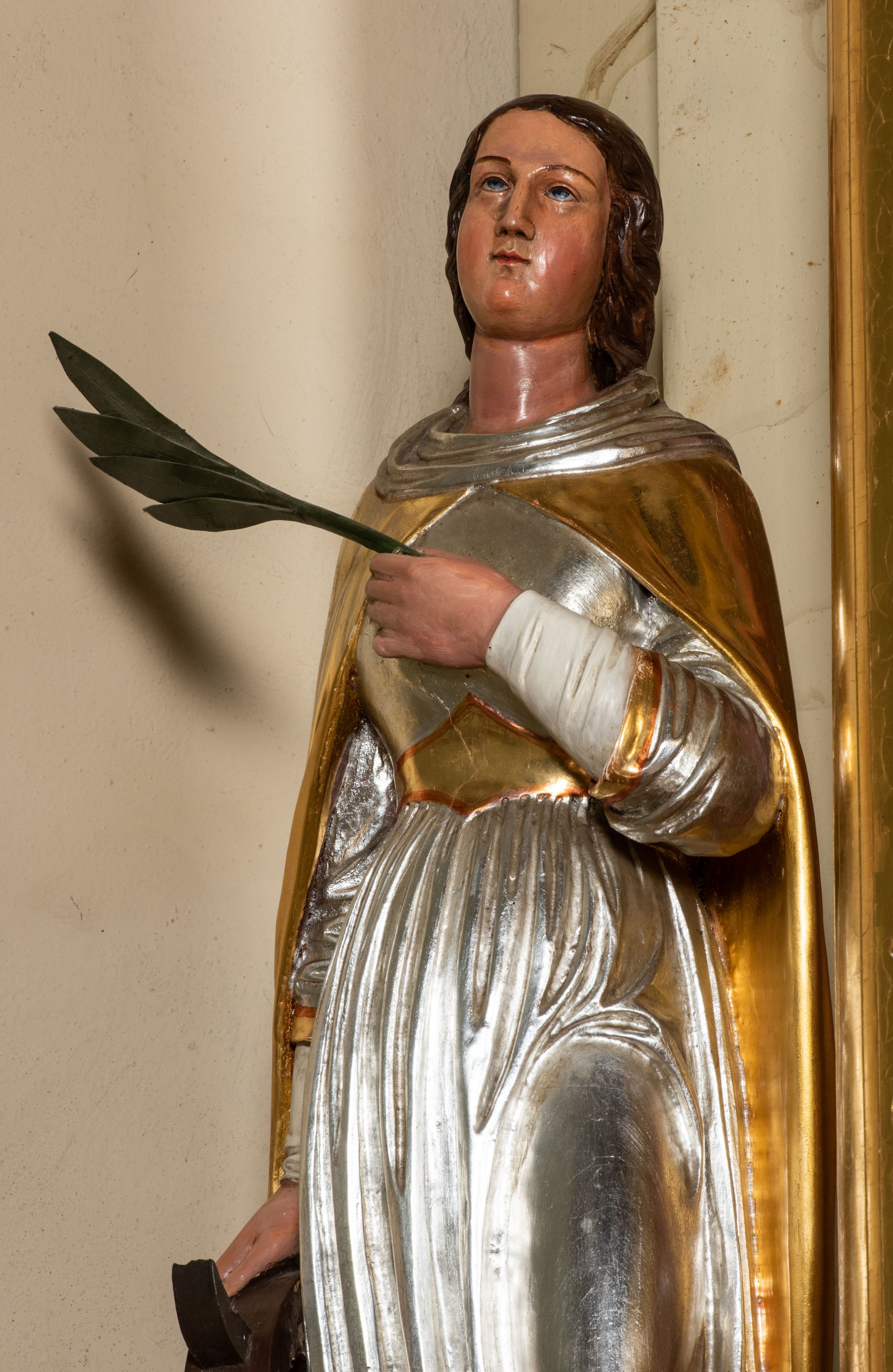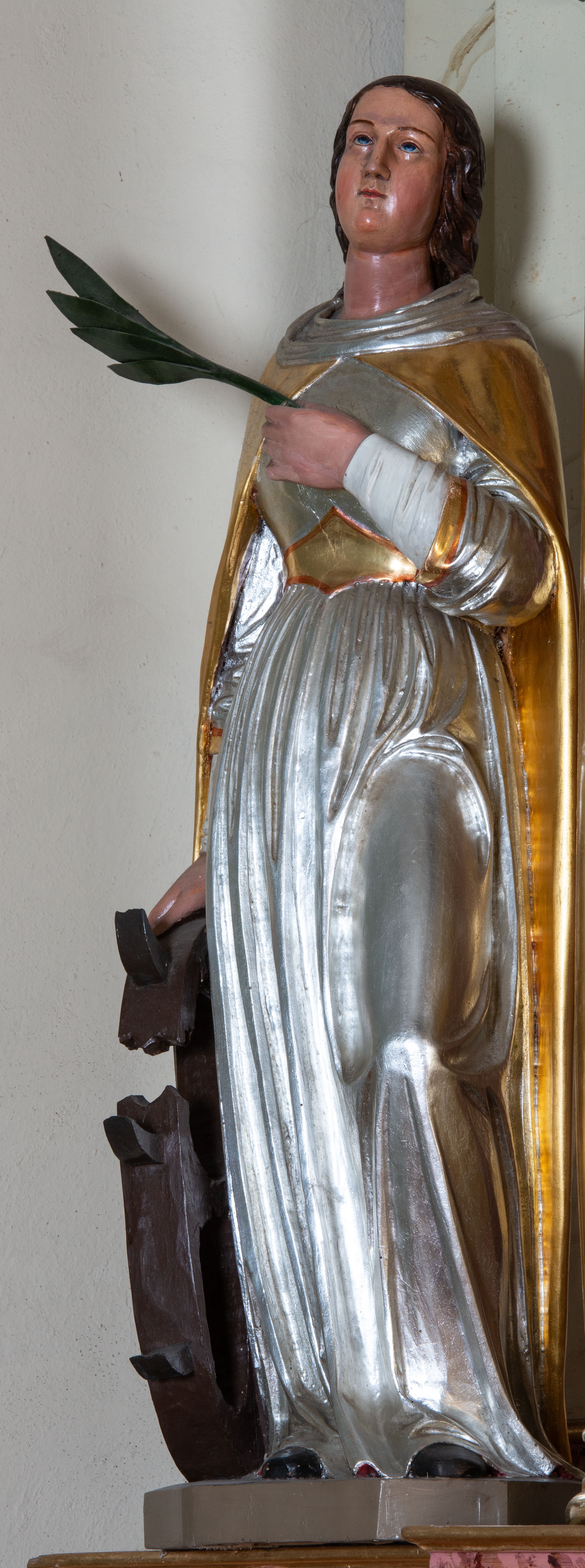 Rzeźby św. Katarzyny Aleksandryjskiej, św. Wawrzyńca oraz aniołków w zwieńczeniu ołtarza zostały wykonane w czasie powstania całej nastawy ołtarzowej w jednym warsztacie rzeźbiarskim. Figury pozbawione są silnej ekspresji, cechuje je statyka, ręce usytuowane są blisko ciała, a draperia szat została potraktowana powierzchniowo. Omawiana rzeźba przedstawia św. Katarzynę Aleksandryjską, patronkę filozofów chrześcijańskich oraz uniwersytetów, ponieważ za życia miała otrzymać wysokie wykształcenie. Zalicza się ją do grona Czternastu Świętych Wspomożycieli. Święta zginęła śmiercią męczeńską na początku IV wieku, gdy odmówiła wykonania rozkazu cesarza Maksencjusza – złożenia ofiar pogańskim bogom. W rzeźbie ołtarza bocznego została ukazana z kołem u stóp, które nawiązuje do jej męczeńskiej śmierci. W trakcie tortury miażdżenia kołem sprawiła modlitwą, że rozpadło się ono w rękach oprawców. Ostatecznie została ścięta mieczem. Oba atrybuty są często wykorzystywane w ikonografii świętej.