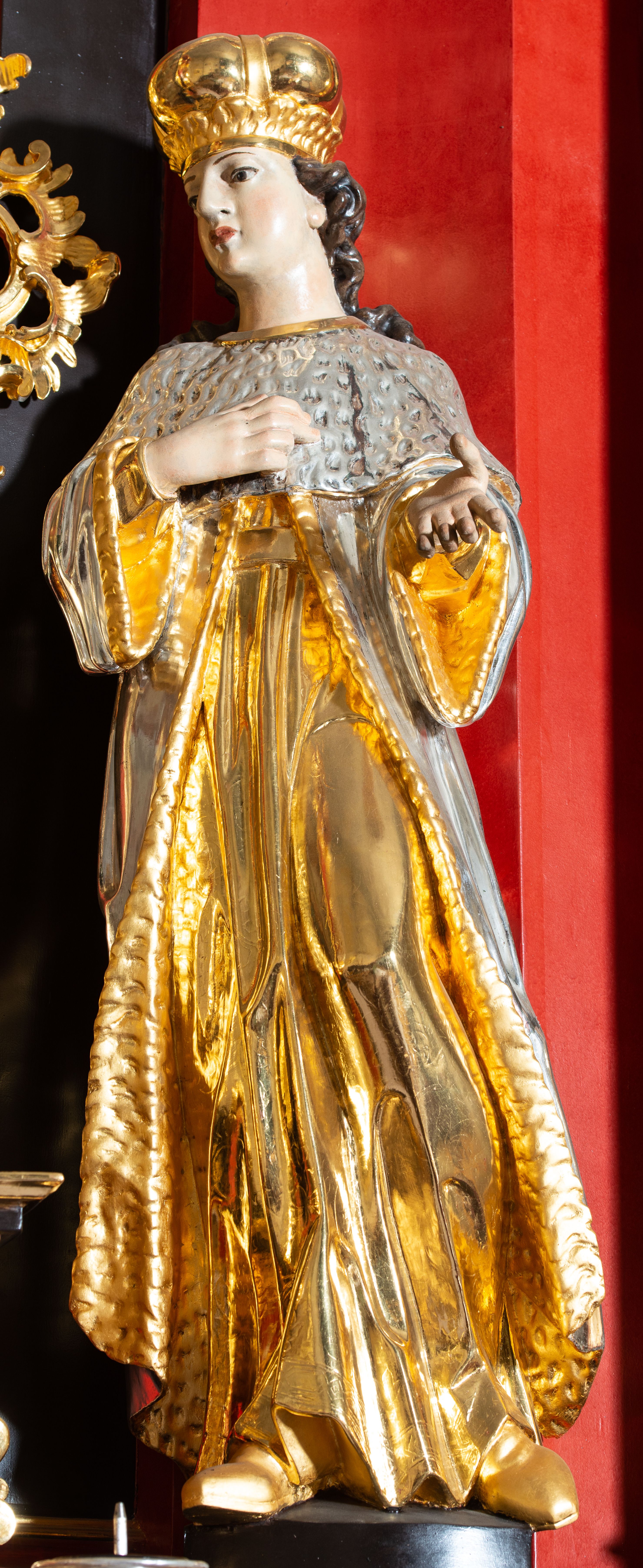 Rzeźba ścięta z tyłu, drążona, przedstawiająca św. Kazimierza królewicza. Święty ukazany w postawie stojącej w delikatnym kontrapoście, zwrócony trzy czwarte w prawo, z prawą ręką złożoną na piersi, a lewą wyciągniętą przed siebie. Twarz młodzieńcza, owalna o pełnych policzkach, z wyraźnie zaznaczonym podbródkiem, dużym nosem i małymi oczami. Włosy długie, ciemnobrązowe i kręcone opadają dużymi falami na plecy. Święty jest ubrany w długą, złoconą suknię oraz królewski płaszcz z gronostajową pelerynką i podbiciem. Na stopach ma założone buty, a na głowie mitrę książęcą. Polichromia naturalistyczna w odsłoniętych partiach ciała, szaty złocone i srebrzone.