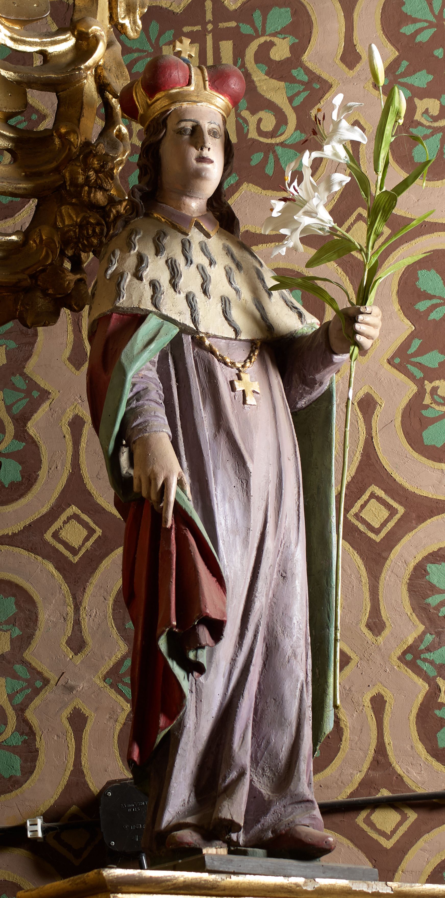 Rzeźba wolnostojąca, ukazująca św. Kazimierza, ustawiona na niskim cokole. Święty przedstawiony w całej postaci, w postawie stojącej z gałązką białej lilii w lewej dłoni, prawą dłonią przytrzymujący połę płaszcza. Twarz owalna, z wyraźnie zaznaczonym podbródkiem, z wąskimi ustami i wzrokiem skierowanym przed siebie; włosy długie i ciemnobrązowe opadające na plecy. Ubrany jest w długą, fioletową suknię z długimi rękawami, czerwony płaszcz z zieloną podszewką i gronostajową pelerynką, mitrę książęcą, zwieńczoną krzyżykiem na głowie oraz krzyżyk zawieszony na piersi na długim łańcuszku, na stopach buty. Polichromia w odsłoniętych partiach ciała naturalistyczna.