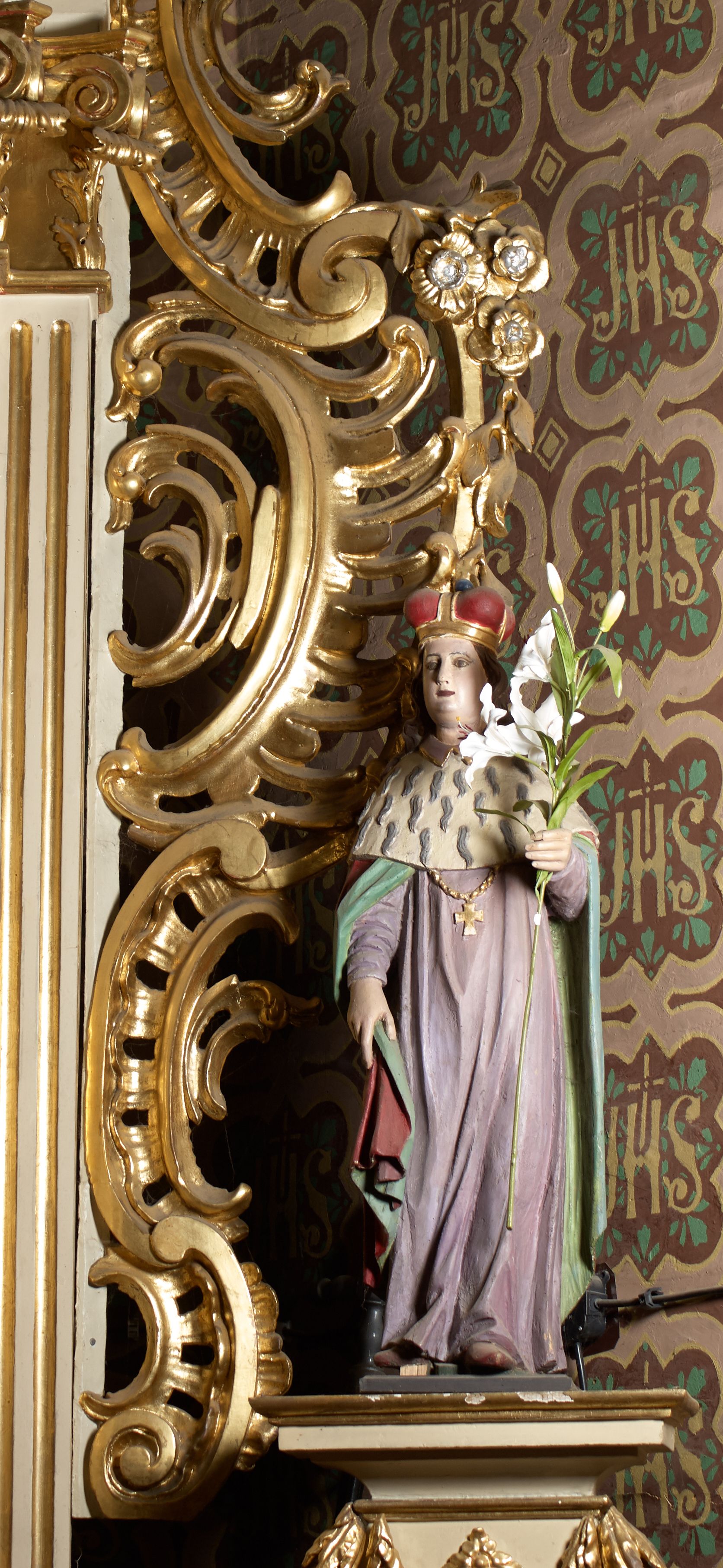 Rzeźba św. Kazimierza została wykonana przez nieznanego artystę w końcu XIX wieku, a następnie ustawiona nad bramką przy ołtarzu głównym. Przedstawia drugiego syna króla polskiego Kazimierza Jagiellończyka i Elżbiety Rakuskiej, patrona Litwy i Wilna.