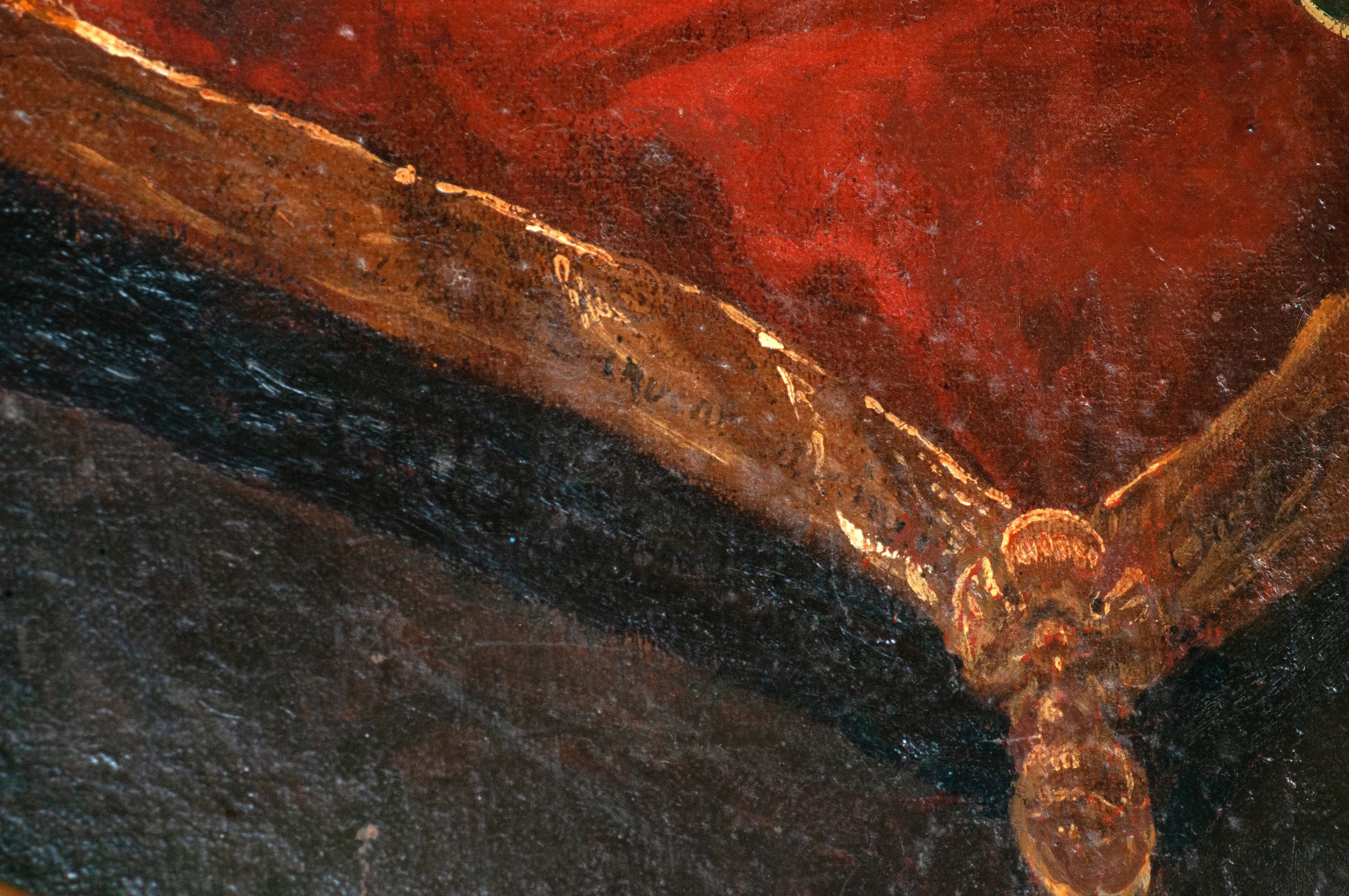 Dostateczny, ubytki i spękania warstwy malarskiej na całości płótna, spłowiały werniks, zabrudzenia powierzchni.