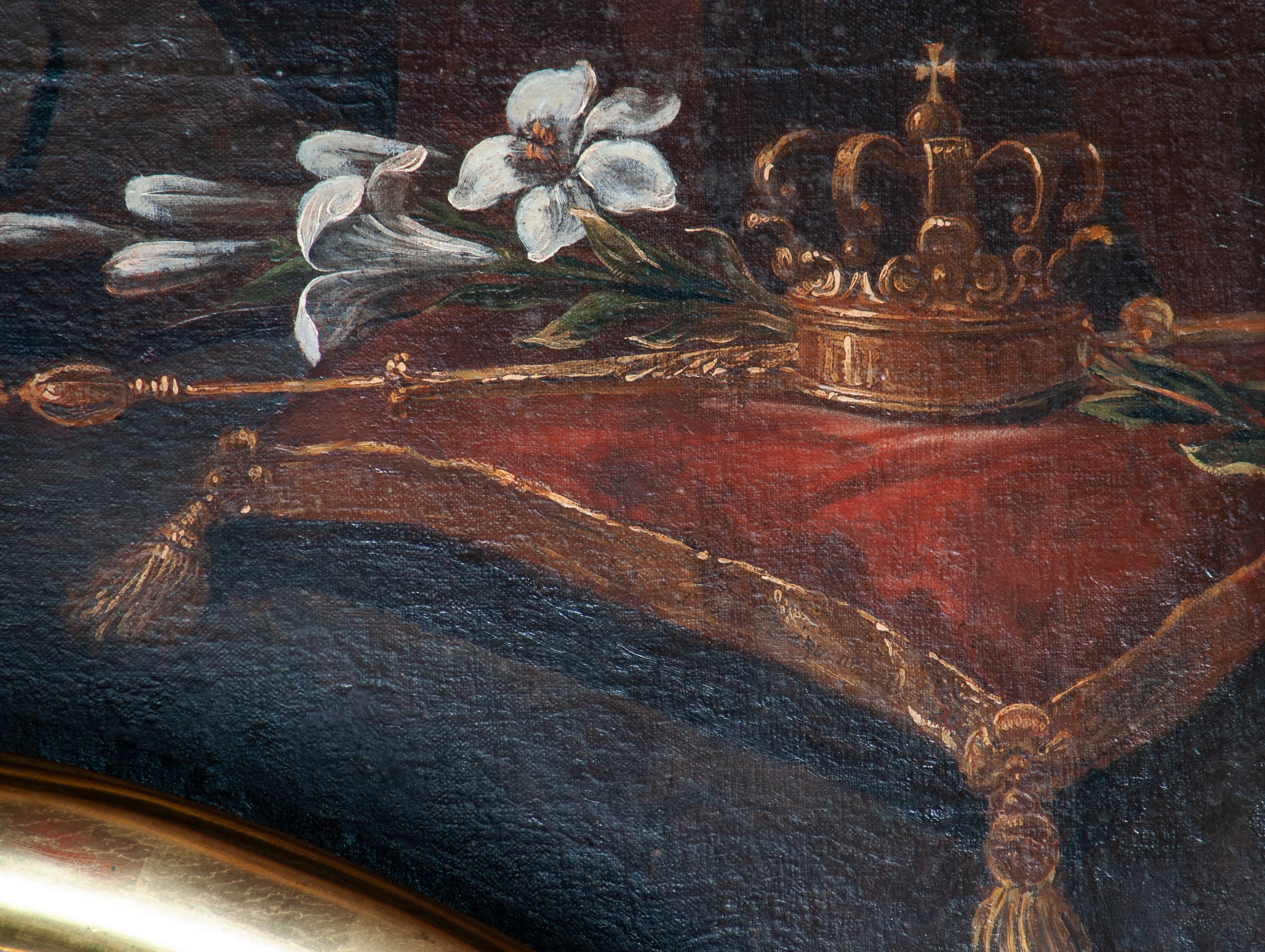 Obraz powstał na początku XIX wieku, jego autorem jest krakowski malarz Michał Stachowicz (1768-1825), który w 1807 i w 1809 roku wykonał szereg innych prac dla wielickiego klasztoru, m.in. antepedia, obrazy „Św. Klara”, „Św. Jan Kanty”, „Św. Walenty”, „Stygmatyzacja św. Franciszka” i inne. Stachowicz choć podejmował różne tematy w swojej twórczości (malował sceny współczesne i historyczne, portrety, widoki miast, zabytki architektoniczne, sceny religijne, osobliwości przyrody, stroje ludowe i mundury wojskowe, ilustrował różne utwory i rysował mapy geograficzne i strategiczne) to jednak największą część jego prac stanowi właśnie malarstwo religijne. Przykłady tych dzieł możemy odnaleźć w wielu kościołach na terenie Krakowa i Małopolski: w Rudawie, Krośnie, Rybnej, Chrzanowie, Porębie Żegoty, Czernichowie, czy Suchej. Pomimo tak ogromnej ilości prac obrazy religijne artysty są uważane za najsłabsze spośród jego całego dorobku. W obrazach tych zarzuca się mu czasem błędy kompozycyjne lub kolorystyczne. Jednocześnie w religijnym malarstwie Stachowicza wskazywany jest wpływ manieryzmu włoskiego i rodzinnych twórców, tj. Tadeusza Kuntzego i Szymona Czechowicza. W centrum kompozycji wielickiego dzieła została ukazana św. Kinga, która urodziła się w 1234 roku. Była córką króla Węgier Beli IV. Została poślubiona księciu sandomierskiemu Bolesławowi Wstydliwemu. Święta Kinga, zwana również Kunegundą opiekowała się biednymi i kobietami, które spodziewały się potomstwa, osobiście angażowała się w sprawy sądowe, aby bronić sierot, wdów i ubogich. Fundowała kościoły, w tym za największe jej dzieło uważa się fundację klasztoru Klarysek w Starym Sączu, do którego wstąpiła po śmierci męża. Zmarła w 1292 roku. Prawdopodobnie obraz mógł stanowić komplet wystroju ołtarza św. Kingi wraz z antepedium (również autorstwa Michała Stachowicza) ukazującym scenę odnalezienia pierścienia św. Kingi w bryle soli. Obecnie antepedium znajduje się w ołtarzu przytęczowym, lewym Matki Boskiej Nieustającej Pomocy. Nie bez powodu na antepedium ukazano scenę z odnalezienia jej pierścienia w bryle soli w kopalni. Święta Kinga jest szczególnie czczona przez górników wielickich, którzy po jej beatyfikacji ubiegali się o relikwie świętej do kościoła parafialnego w Wieliczce. Kult św. Kingi, jako patronki górników salinarnych prawdopodobnie początkowo istniał w Bochni, a dopiero później objął środowisko wielickie. Liczne pielgrzymki do grobu świętej patronki w Starym Sączu odbywały się w latach 1992-1994, kiedy kopalni zagroziło zalanie wodą, a kościół Reformatów uległ poważnym uszkodzeniom.