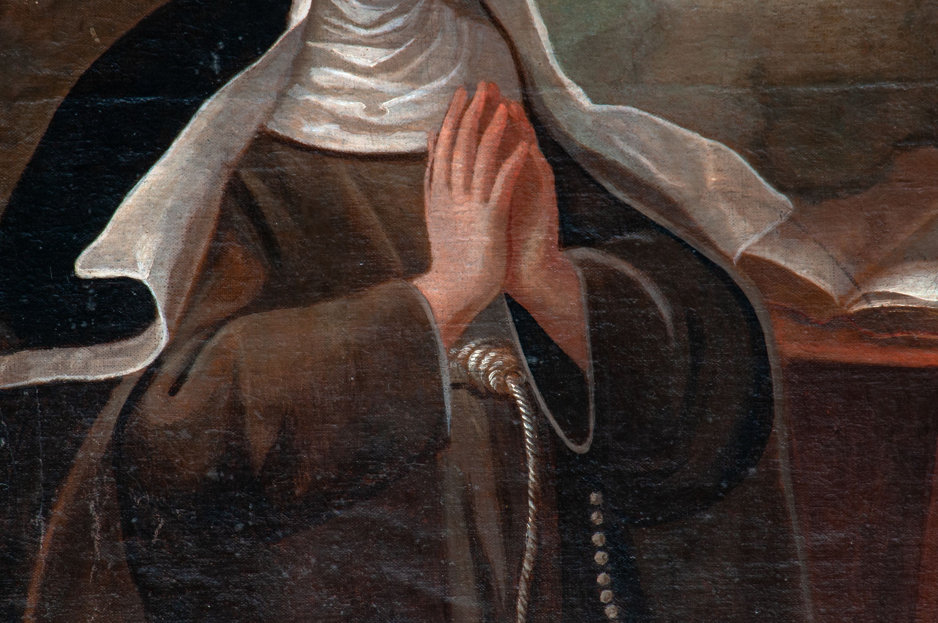 Obraz w kształcie stojącego prostokąta zamkniętego łukiem wklęsło-wypukłym z uskokami, przedstawiający św. Kingę; podstawa obrazu ścięta półkoliście. W centrum kompozycji znajduje się św. Kinga zwrócona w trzech czwartych w swoją lewą stronę, ukazana w pozie klęczącej z rękoma złożonymi do modlitwy, z głową przechyloną na lewe ramię. Twarz św. Kingi jest owalna o bladej karnacji, z migdałowymi oczami skierowanymi ku górze, prostym nosem i pełnymi ustami, delikatnie rozchylonymi. Święta ubrana jest w brązowy habit, przewiązany sznurem, brązowy płaszcz oraz biało-czarny welon (strój klaryski). W dłoni trzyma różaniec. W górnej części kompozycji, po prawej stronie został ukazany Chrystus, siedzący na obłokach, zwrócony trzy czwarte w prawo, z prawą ręką wzniesioną w geście błogosławieństwa, lewą opuszczoną w dół. Ma podłużną twarz, długi i prosty nos, długą i ciemnobrązową brodę. Długie i ciemne włosy opadają na plecy. Jest ubrany w czerwony płaszcz, spływający z prawego ramienia, odsłaniający nagi tors. Nad jego prawym ramieniem dwójka małych aniołków unosi ku górze prosty krzyż. W dolnej części kompozycji, po prawej stronie obrazu widnieje wysoki pulpit, zasłany czerwonym obrusem, na nim leży otwarta księga. Poniżej pulpitu jest czerwona poduszka, na której są położone: korona i berło królewskie oraz gałązka białej lilii. Tło obrazu stanowi zachmurzone niebo. Kolorystyka ciemna, ciepła z dominacją brązu i elementami czerwieni. W lewym dolnym narożu obrazu na brzegu poduszki sygnatura „M(ichał) Stachowicz invenit / [nieczytelna data]”. Rama profilowana, złocona.